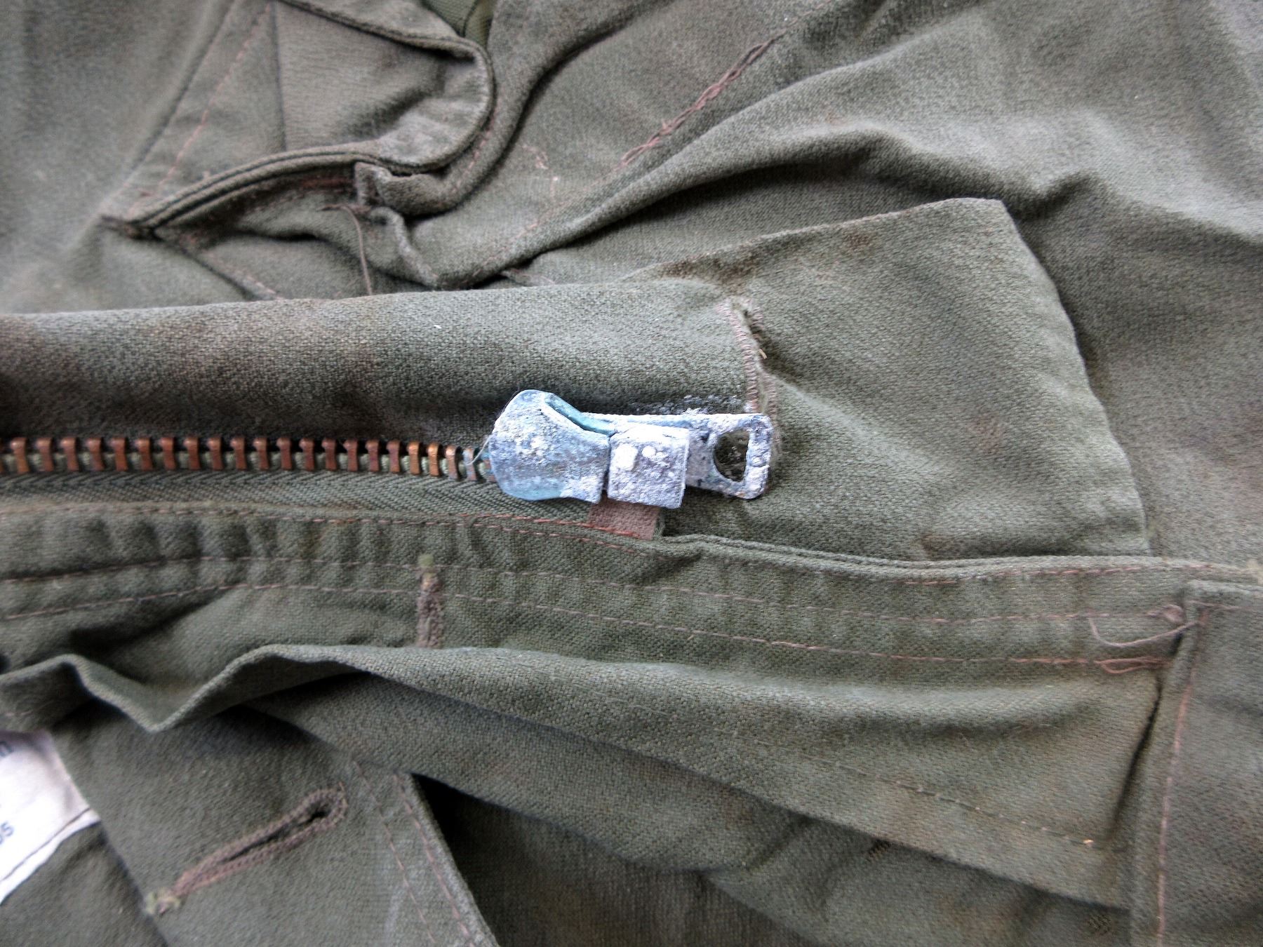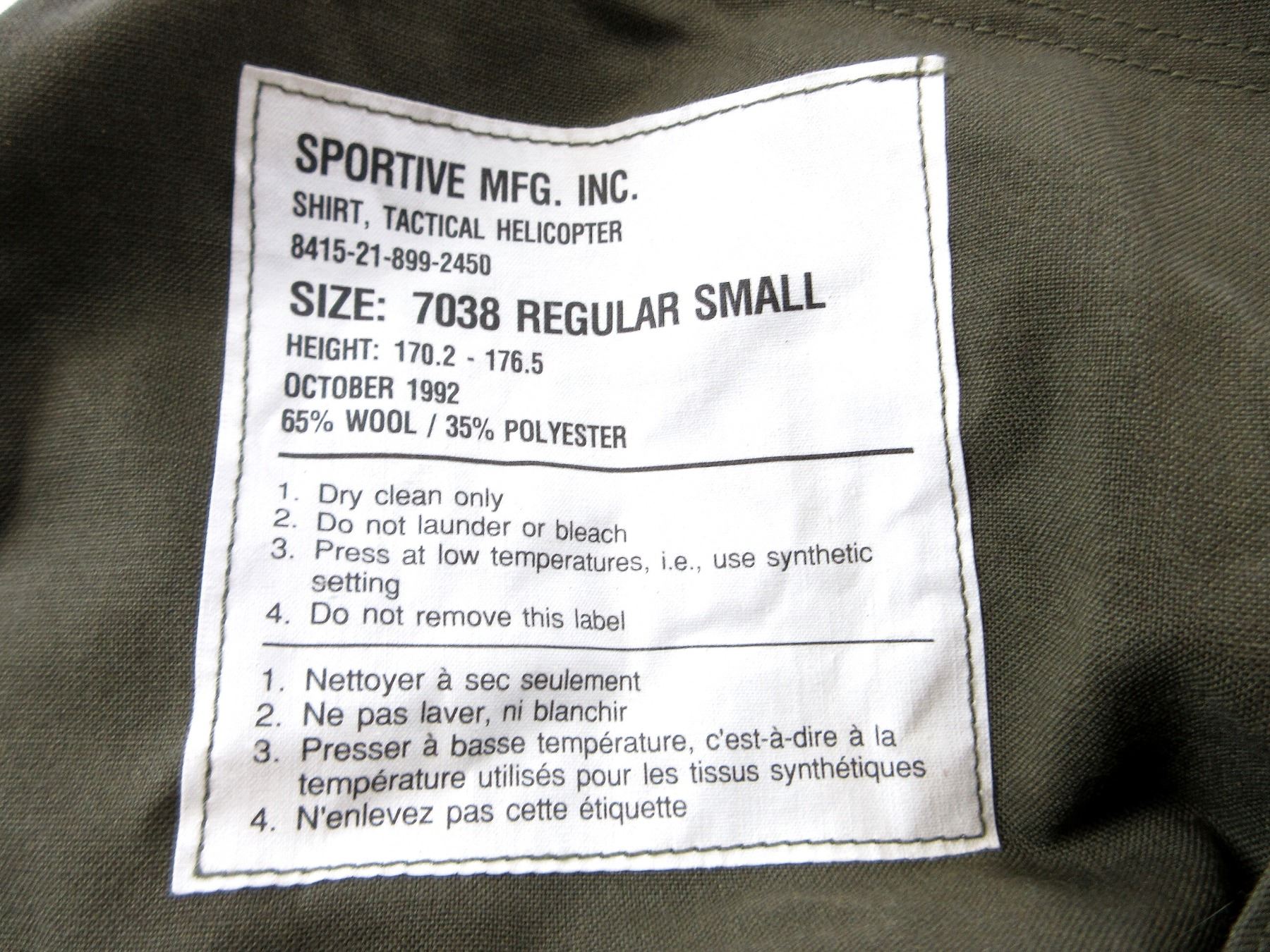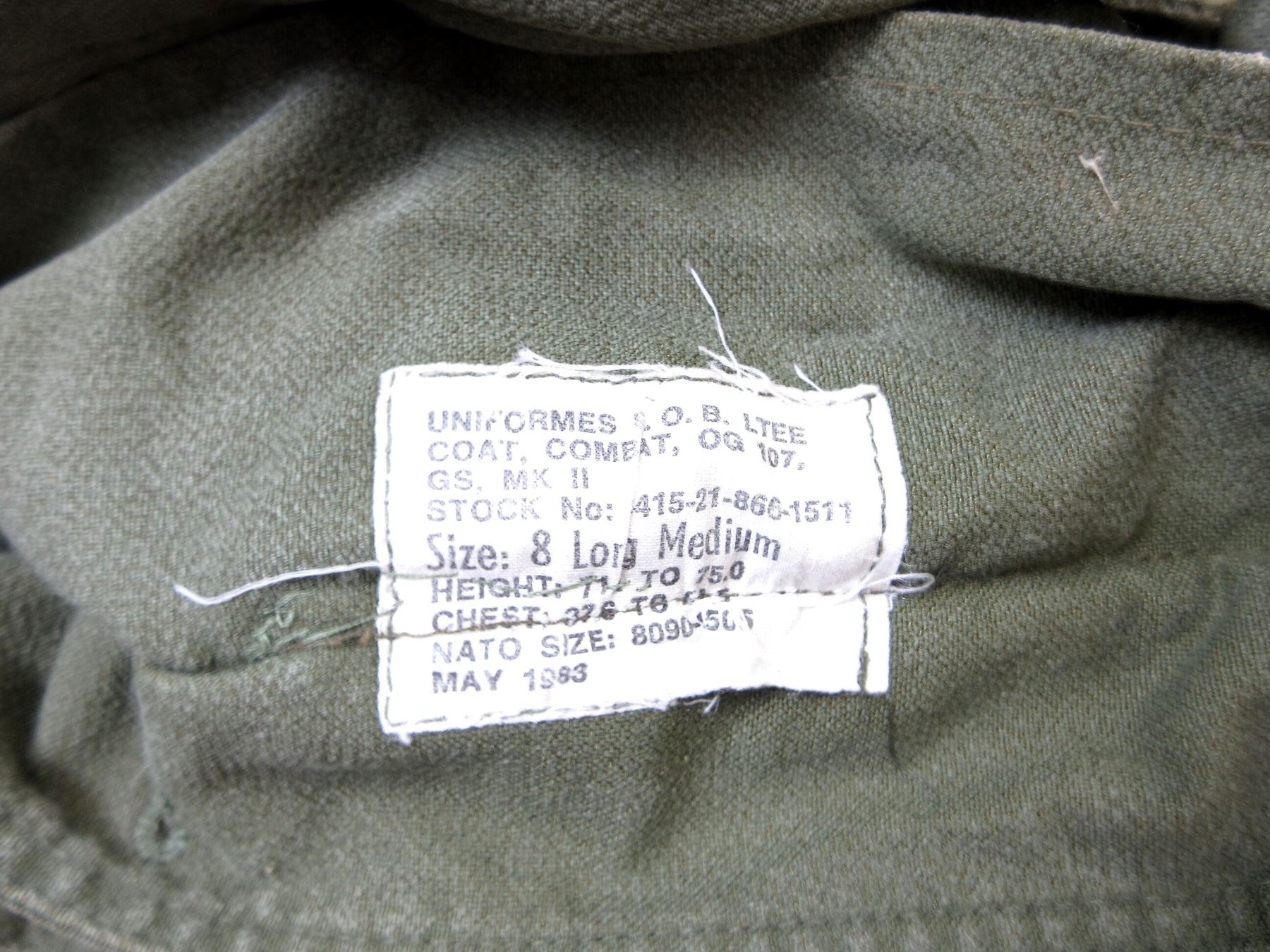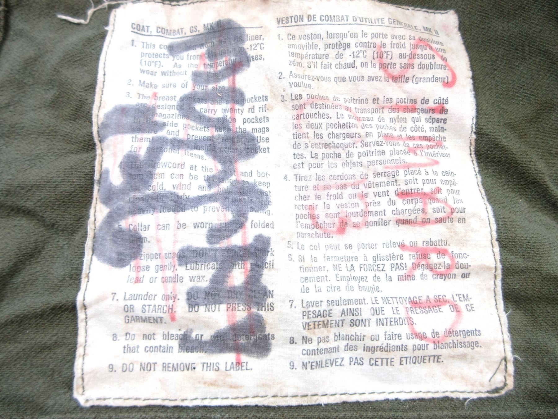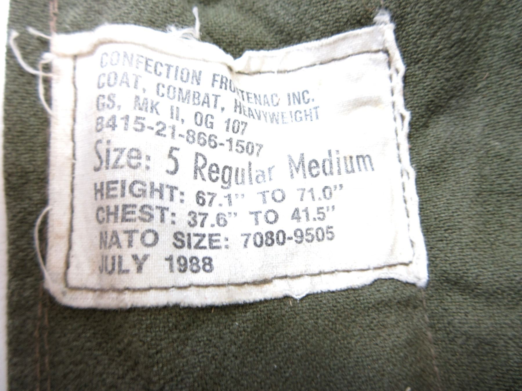 LOT INCLUDES; (1) RCAF GREEN FLIGHT / TACTICAL HELICOPTER SHIRT, MARKED: "SPORTIVE MFG. INC., SHIRT, TACTICAL HELICOPTER, 8415-21-899-2450, SIZE: 7038 REGULAR SMALL" ETC., ZIPPERED-FRONT / VARIOUS ZIPPERS (ALL WORK) & (3) GREEN CANVAS GS MKII COMBAT COATS, SIZES 5 REGULAR-MEDIUM / 8 LONG-MEDIUM, VARIOUS LABELS / MARKINGS ON ALL, BUTTON / ZIPPERED FRONTS, ONE WORKS, TWO DO NOT (CORRODED), ALL SHOW AGE / WEAR / TEAR. SEE PHOTOS.
