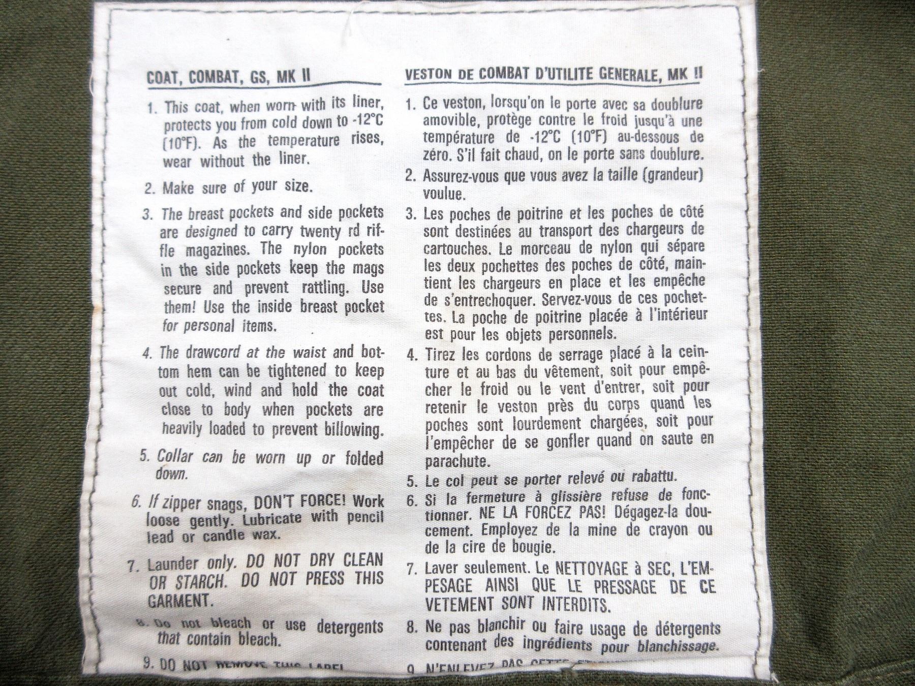 LOT INCLUDES; (1) CANADIAN MILITARY GREEN CANVAS GS MKII COMBAT COAT, SIZE 8 TALL-MEDIUM, VARIOUS LABELS / MARKINGS, BUTTON / ZIPPERED FRONT (WORKS), SHOWS WEAR & (1) BRITISH MILITARY COMBAT SMOCK FOR COLD WEATHER, CHEST SIZE 40" TO 42", HEIGHT 6' TO 6'8", VARIOUS LABELS / MARKINGS, BUTTON / ZIPPERED FRONT (WORKS), SHOWS WEAR / TEAR. SEE PHOTOS.
