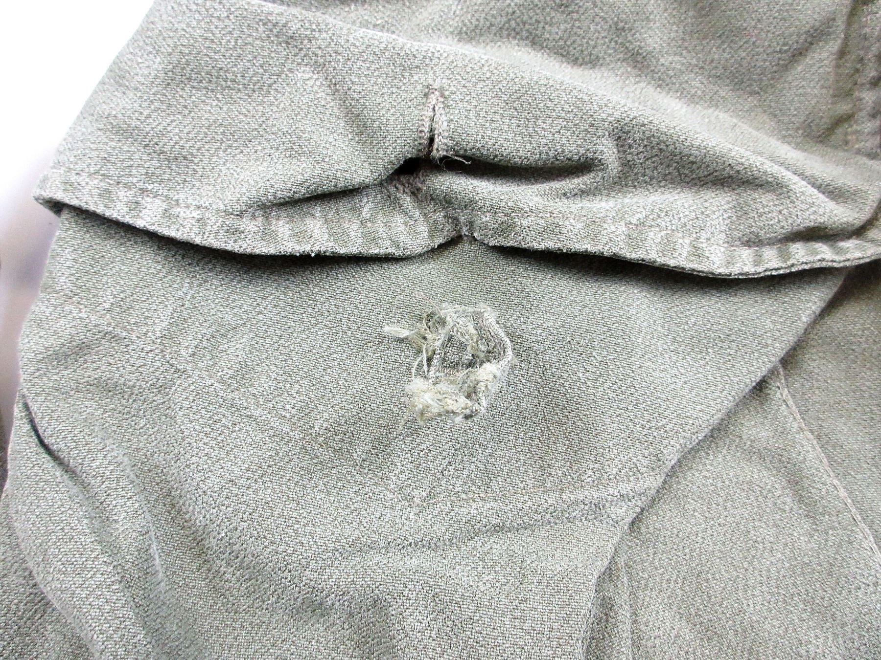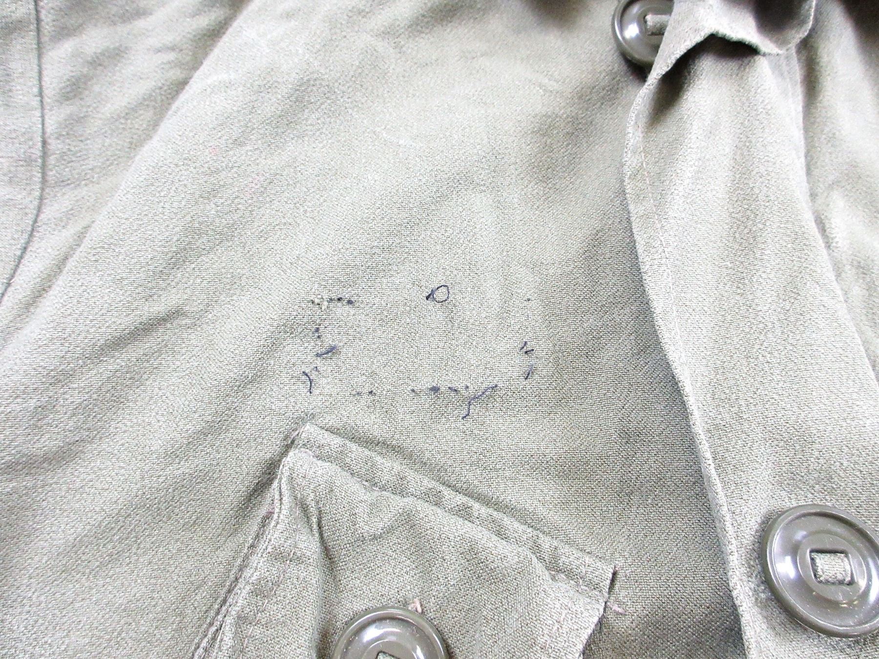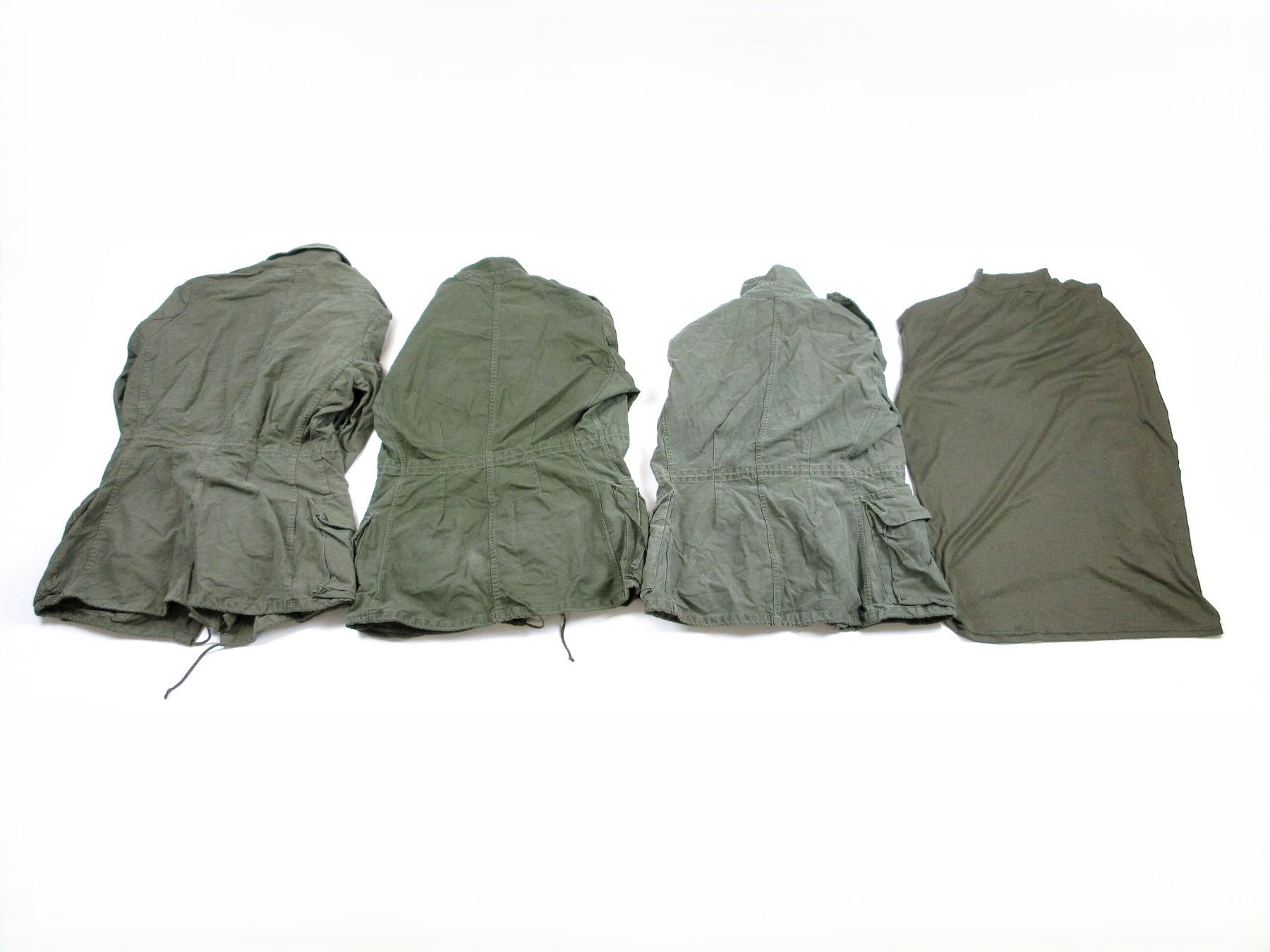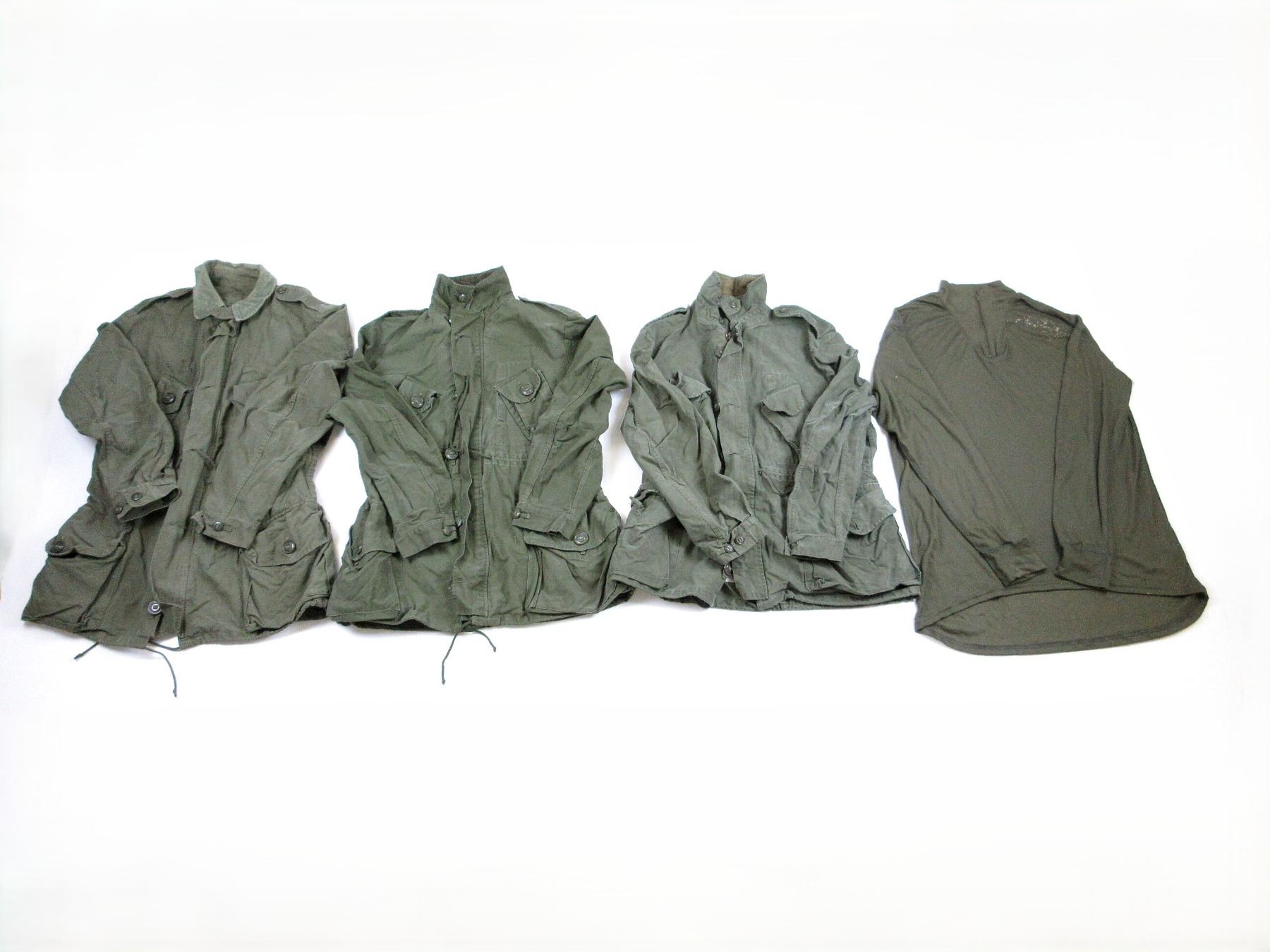 LOT INCLUDES; (3) GREEN CANVAS GS MKII COMBAT COATS, SIZES 2 SHORT-MEDIUM / 5 REGULAR-MEDIUM / 8 TALL-MEDIUM, VARIOUS LABELS / MARKINGS ON ALL, BUTTON / ZIPPERED FRONTS, ALL WORK, ALL SHOW AGE / WEAR & (1) MILITARY STYLE LONG-SLEEVED SHIRT, SIZE XL, ZIPPERED COLLAR, SHOWS WEAR. SEE PHOTOS.