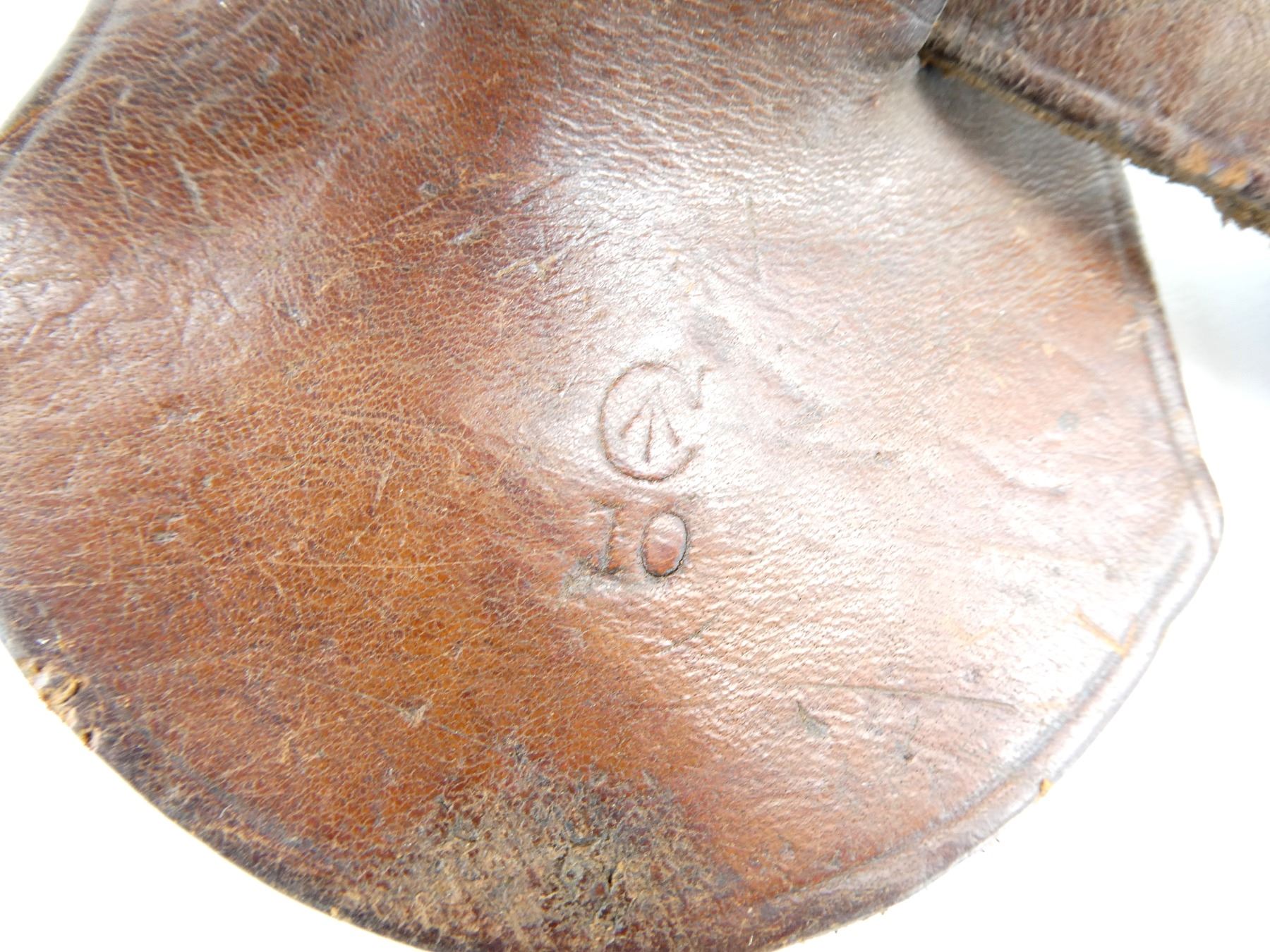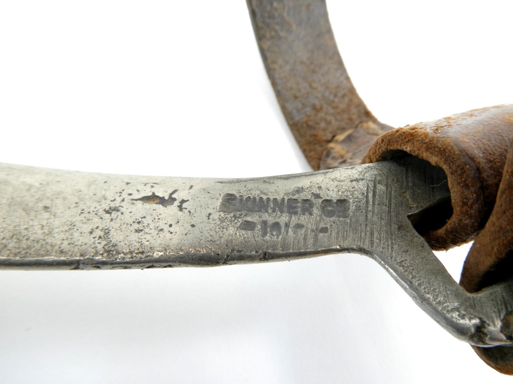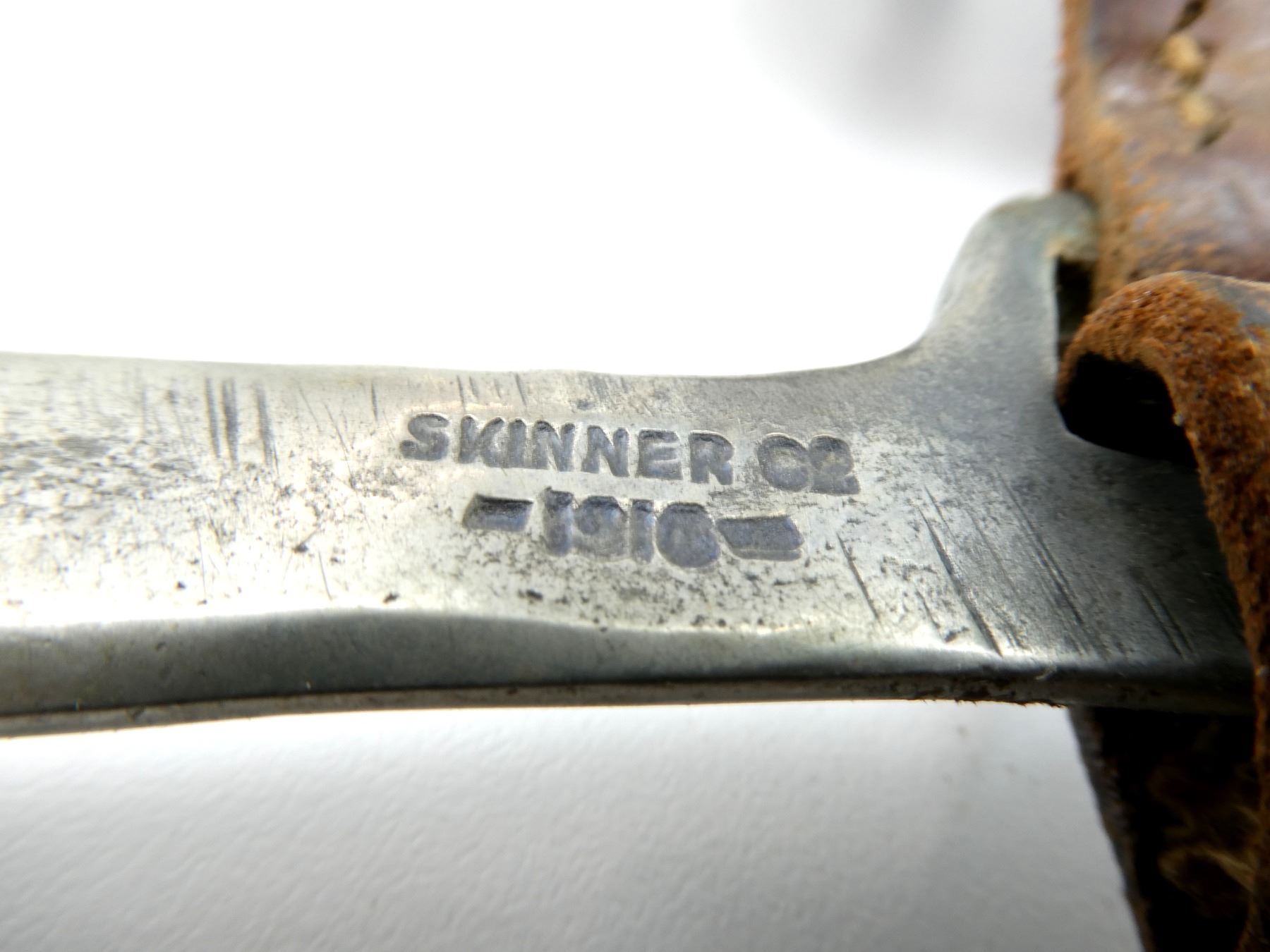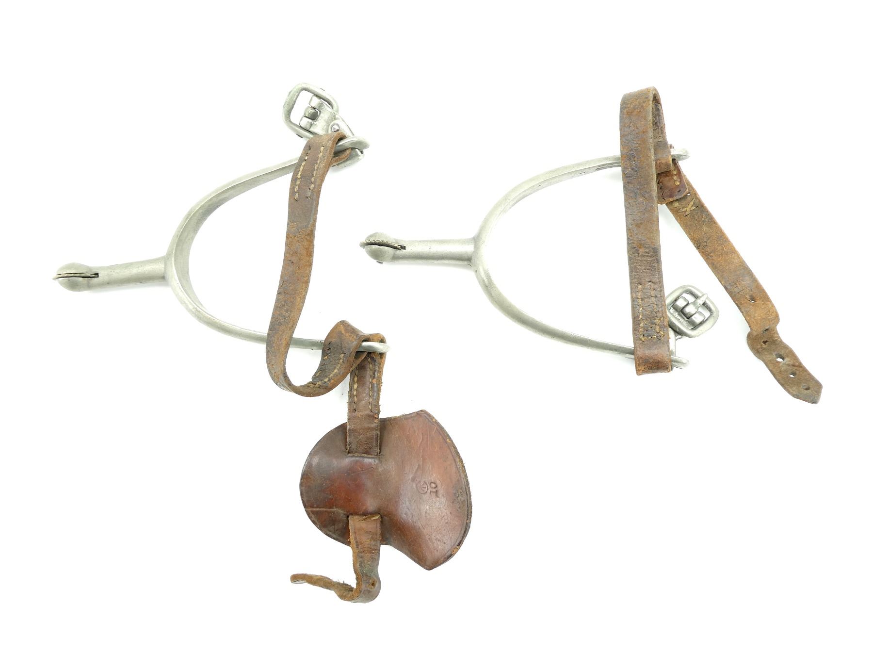 (1) PAIR OF BOOT SPURS, METAL SPURS WITH LEATHER STRAPS, METAL MARKED: "SKINNER CO., 1916" WITH C-BROAD ARROWS, LEATHER STRAPS / TABS MARKED: C-BROAD ARROW OVER "10", ONE MISSING LEATHER TAB, LEATHER STILL FAIRLY SOFT, SHOWS WEAR / TEAR, APPROX. 4" L X 4" W, OAL APPROX. 6.5". SEE PHOTOS.