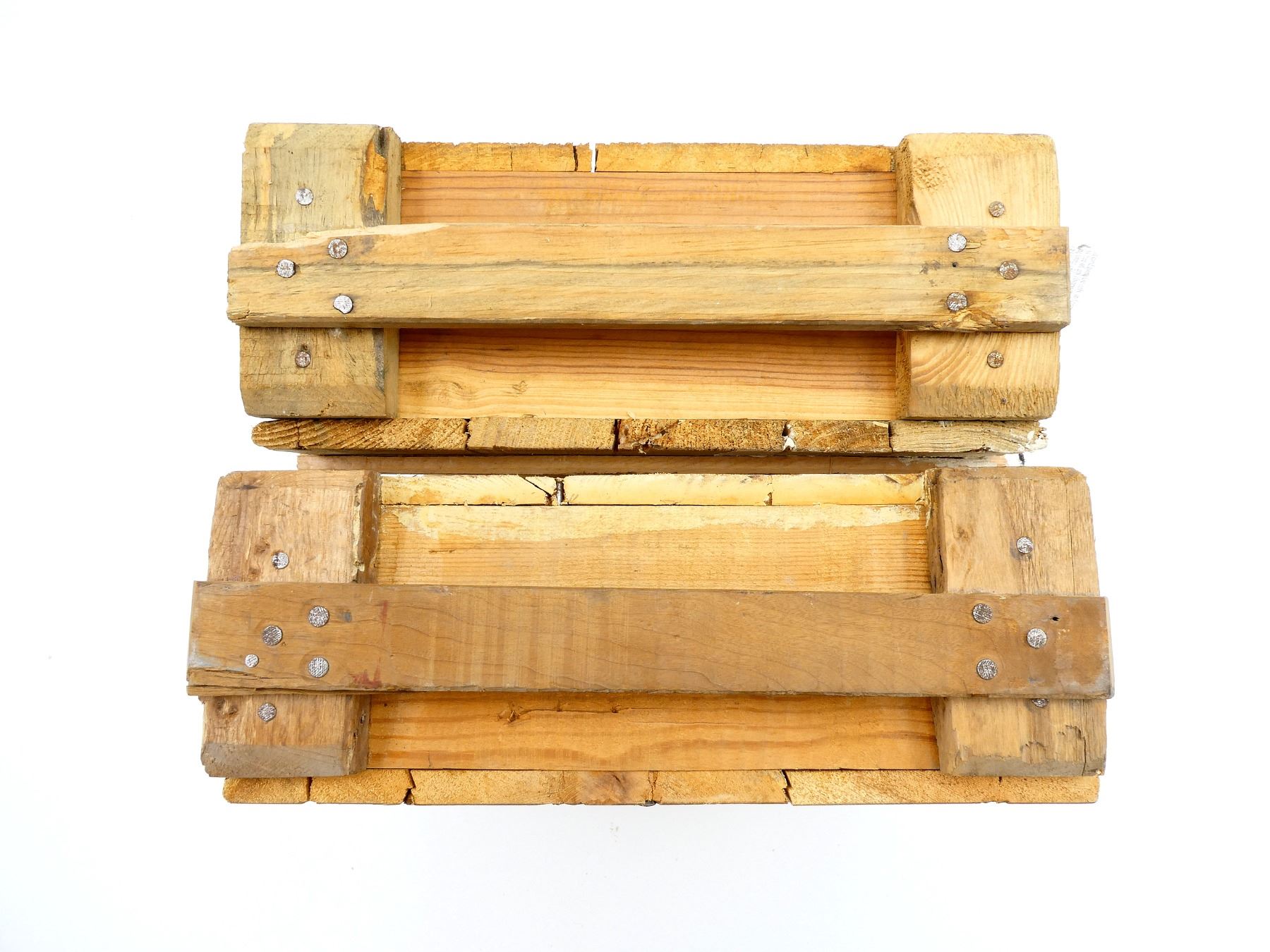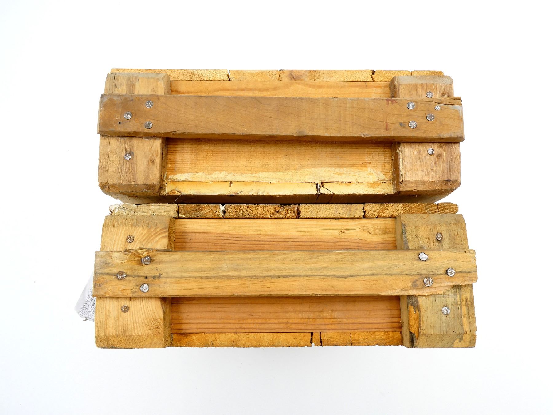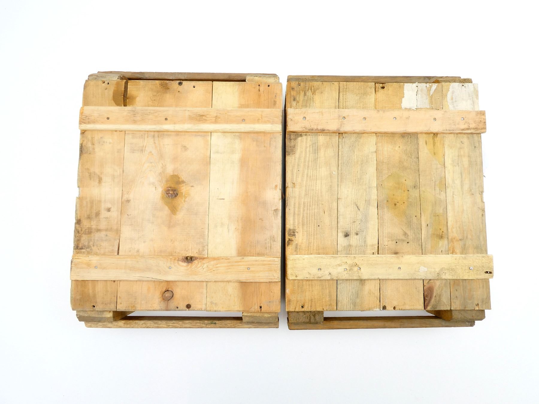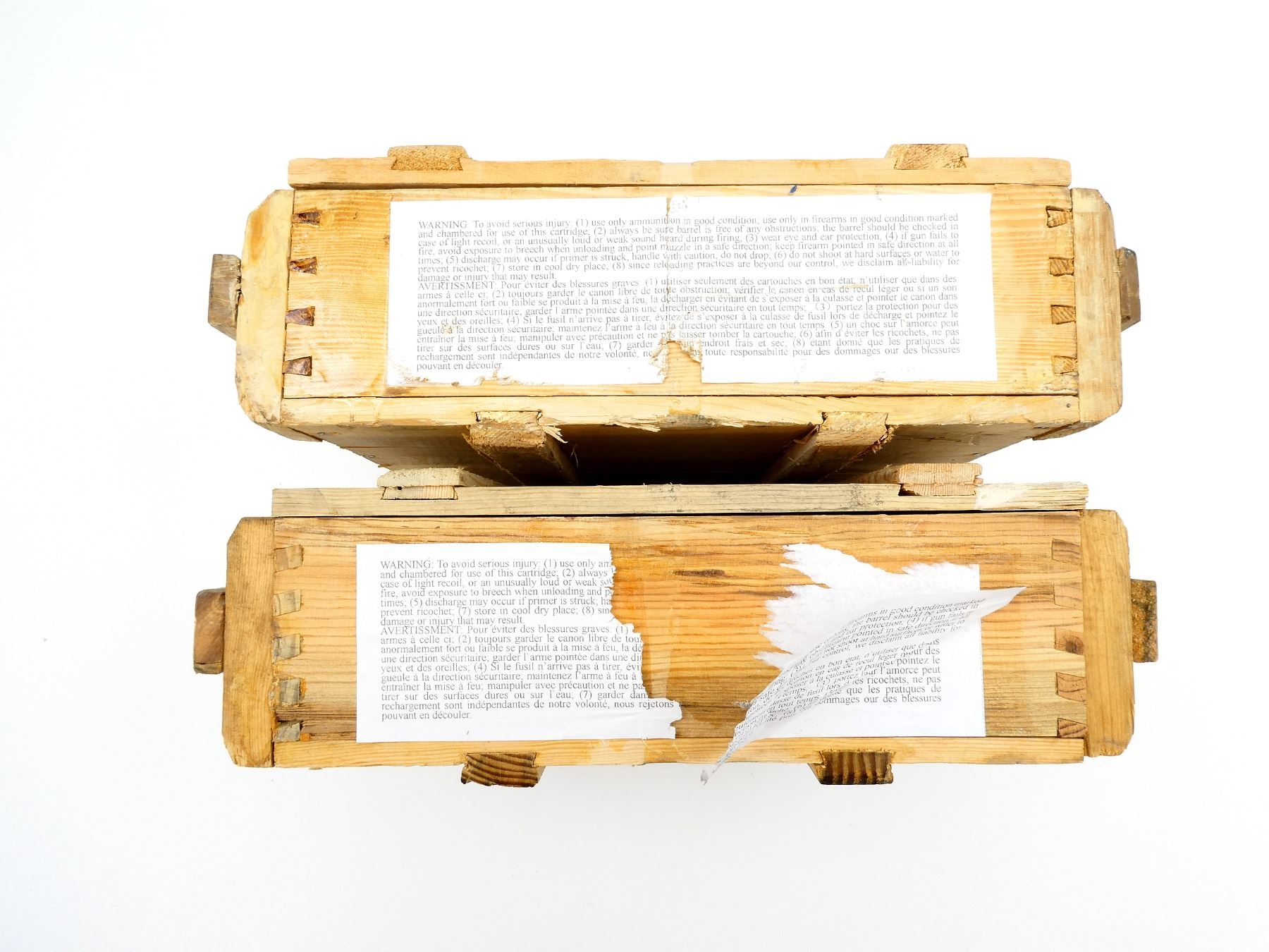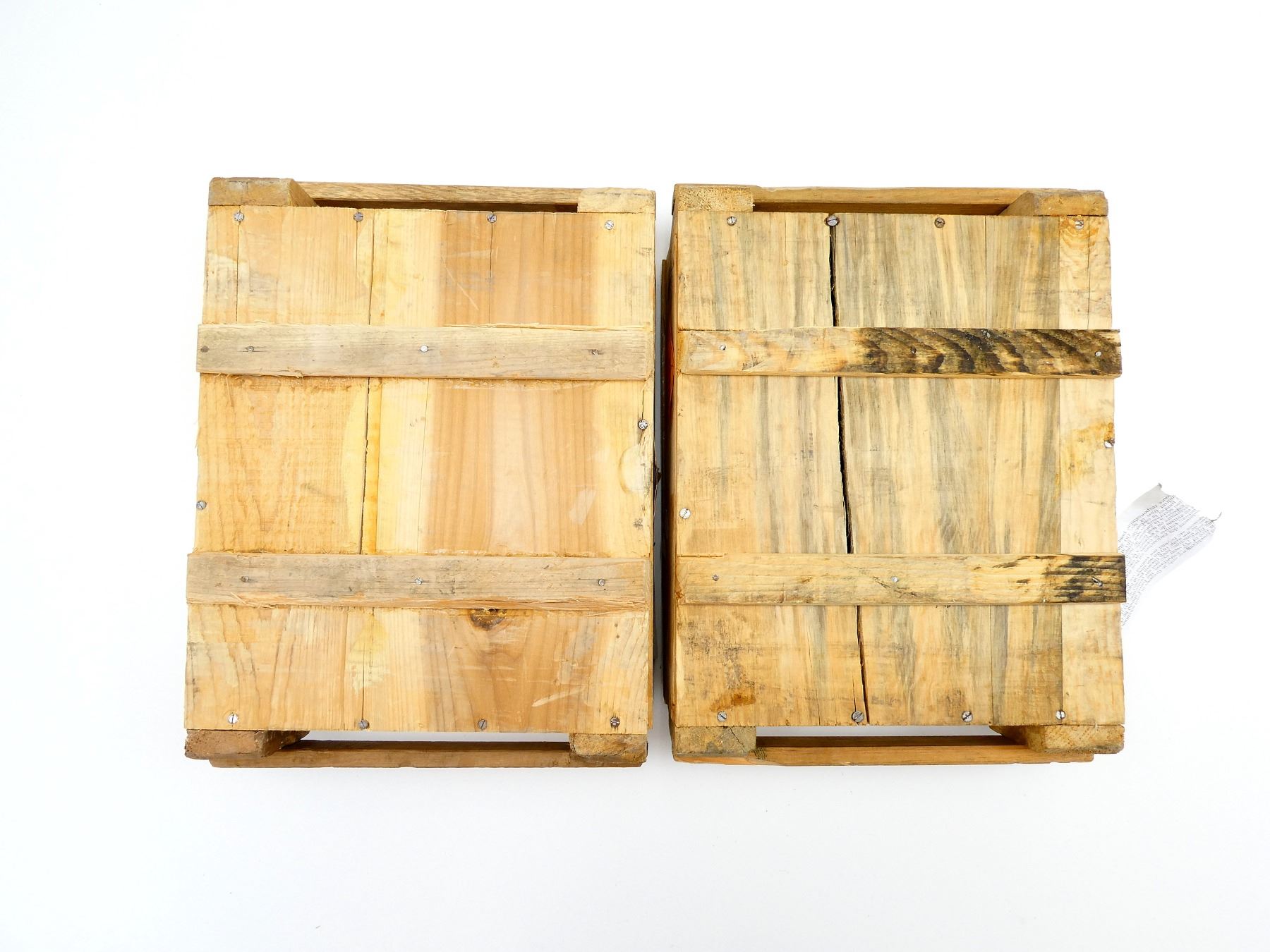 LOT INCLUDES; (2) WOODEN AMMO CRATES WITH LIDS (EMPTY), ONE HAS CRACK ACROSS BOTTOM, VARIOUS MARKINGS, APPROX. 18.25" X 13.25" X 6.25". SEE PHOTOS.