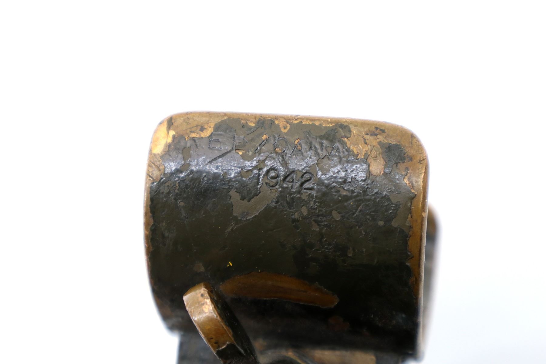 (1) GREEN PAINTED BRASS CLAMP WITH WOOD LEGS, LEGS UNFOLD PROPERLY, CLAMP MARKED: "TRIPOD TELESCOPE, NO.21 MK 5, (C1A1), SERIAL-274-C" WITH BROAD ARROW, OTHER-SIDE MARKED: "R.E.L. / CANADA, 1942", OAL APPROX. 17.75" (FOLDED). SEE PHOTOS.