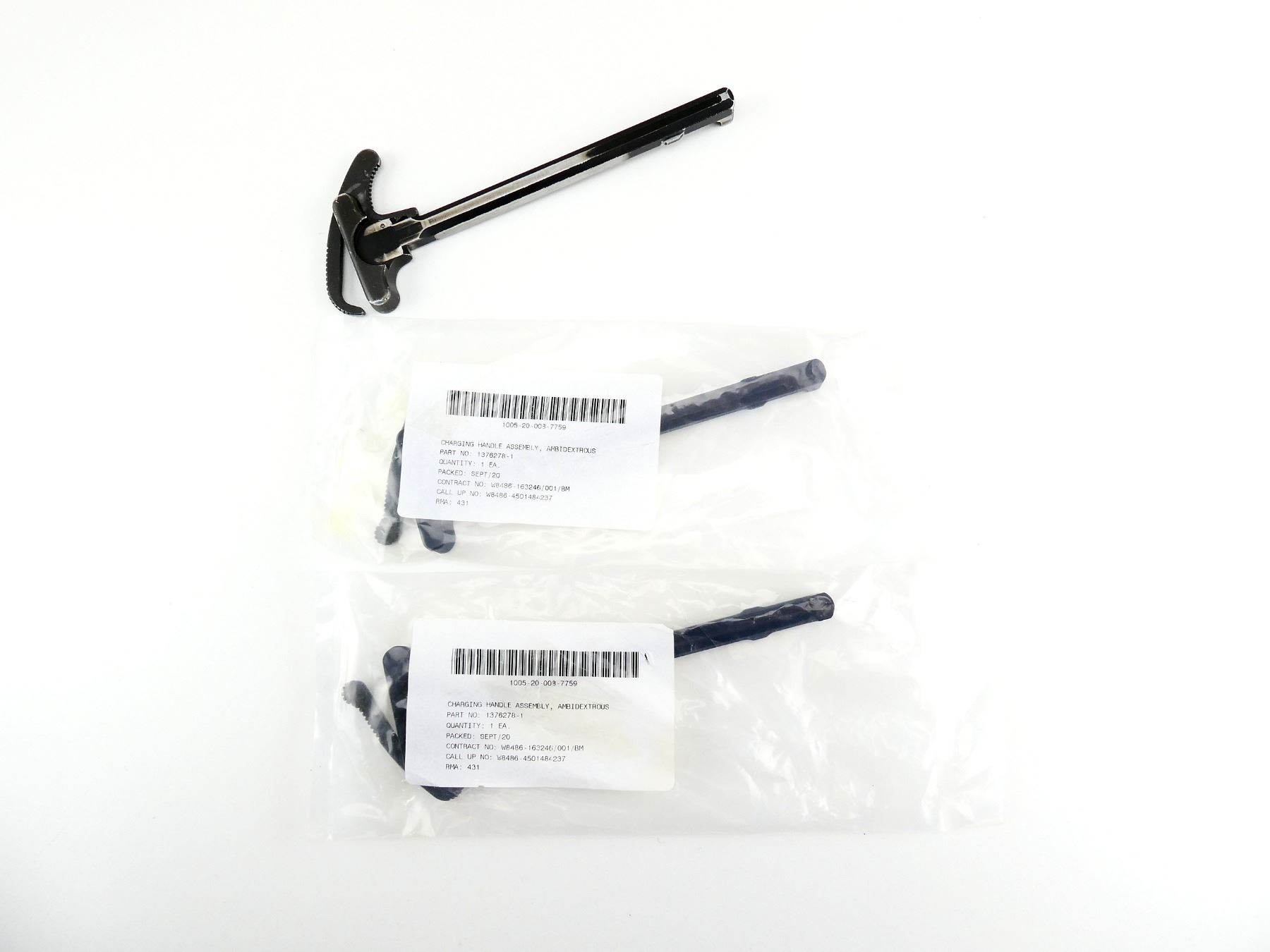 LOT INCLUDES; (3) FOR USE WITH: C7 / C8 / AR-15 & VARIOUS OTHER RIFLES, TWO MARKED: "1005-20-008-7759", "CHARGING HANDLE ASSEMBLY, AMBIDEXTROUS, PART NO: 1376278-1, QUANTITY: 1 EA., PACKED: SEPT/20", ETC., TWO ARE NOS IN UNOPENED PACKAGING, ONE IS WITHOUT PACKAGING, SHOWS WEAR / USE MARKS. SEE PHOTOS.