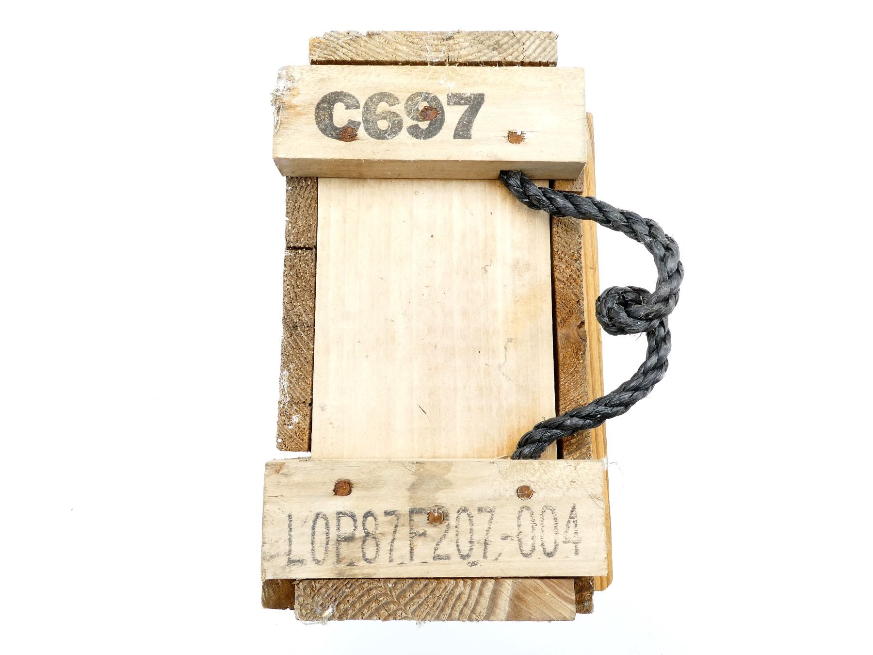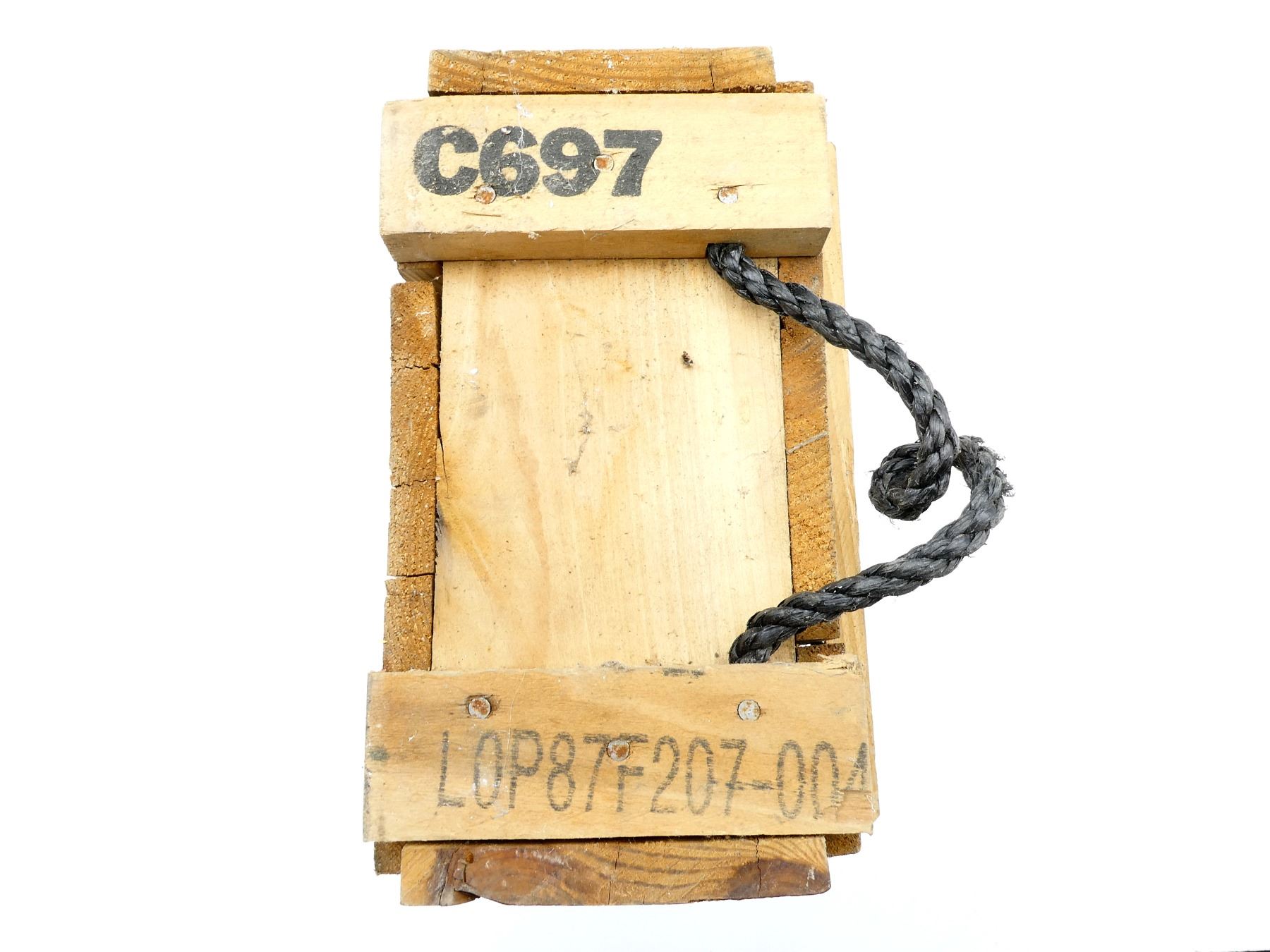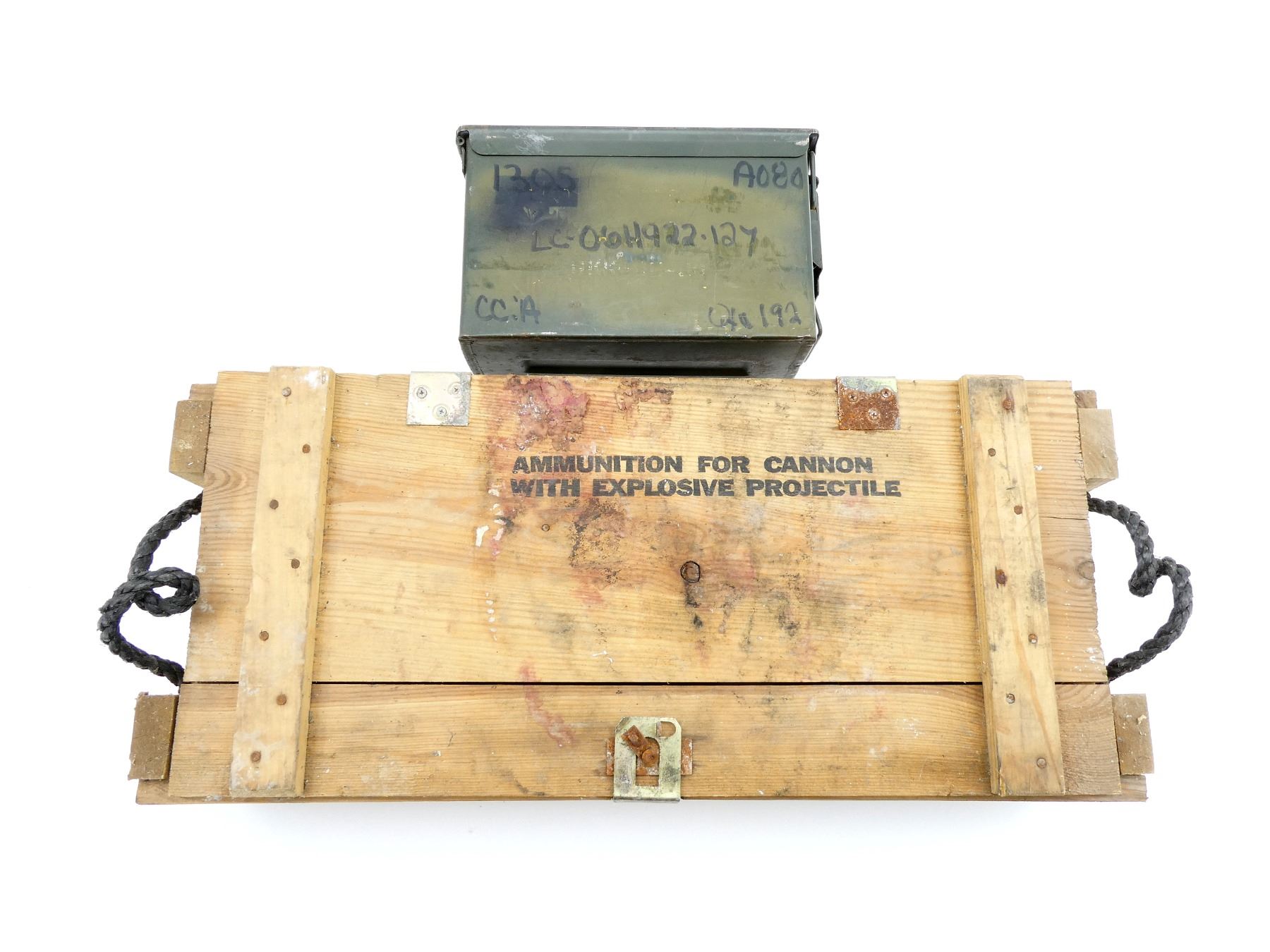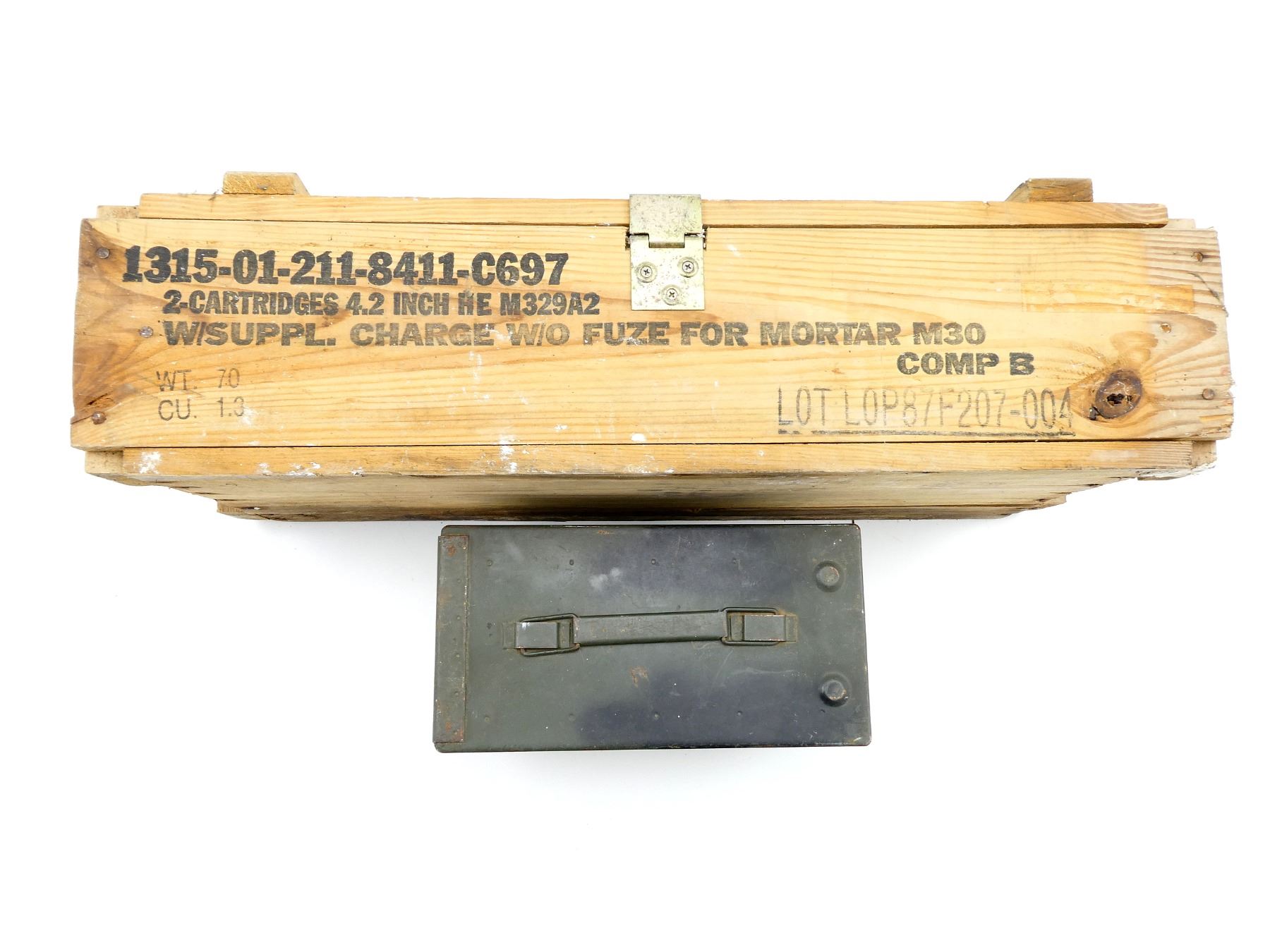 LOT INCLUDES; (1) U.S. MILITARY WOODEN AMMO CRATE, MARKED: "1315-01-211-8411-C697, 2-CARTRIDGES 4.2 INCHHE M329A2" ETC. & VARIOUS OTHER MARKINGS, BLACK PLASTIC ROPE STYLE CARRY HANDLES, METAL HINGES / LATCH, APPROX. 27 3/8" X 12" X 7.25" & (1) GREEN PAINTED METAL AMMO TIN, VARIOUS MARKINGS, APPROX. 12" X 6" X 7.25". SEE PHOTOS.