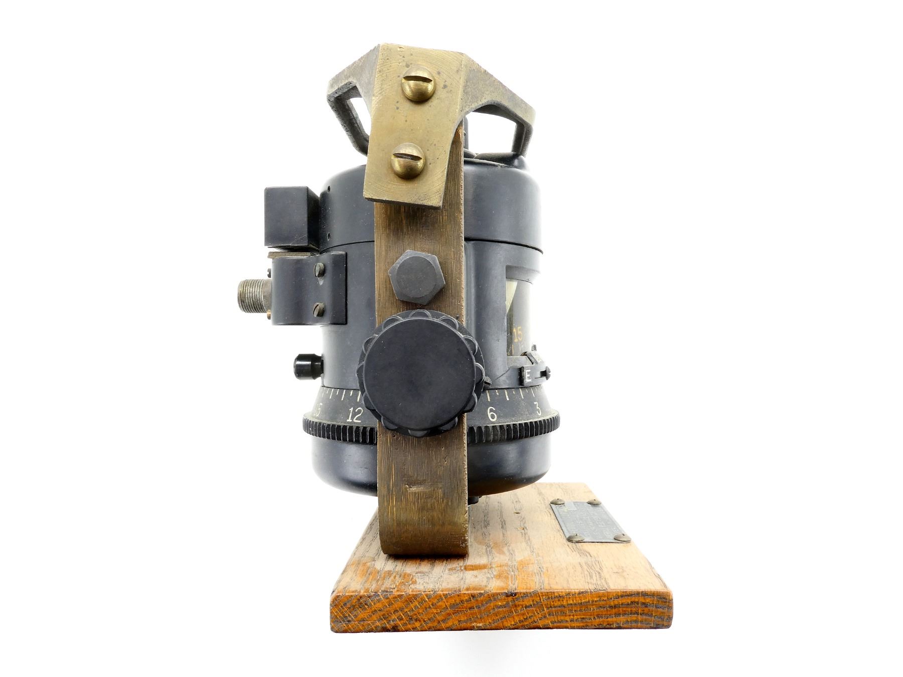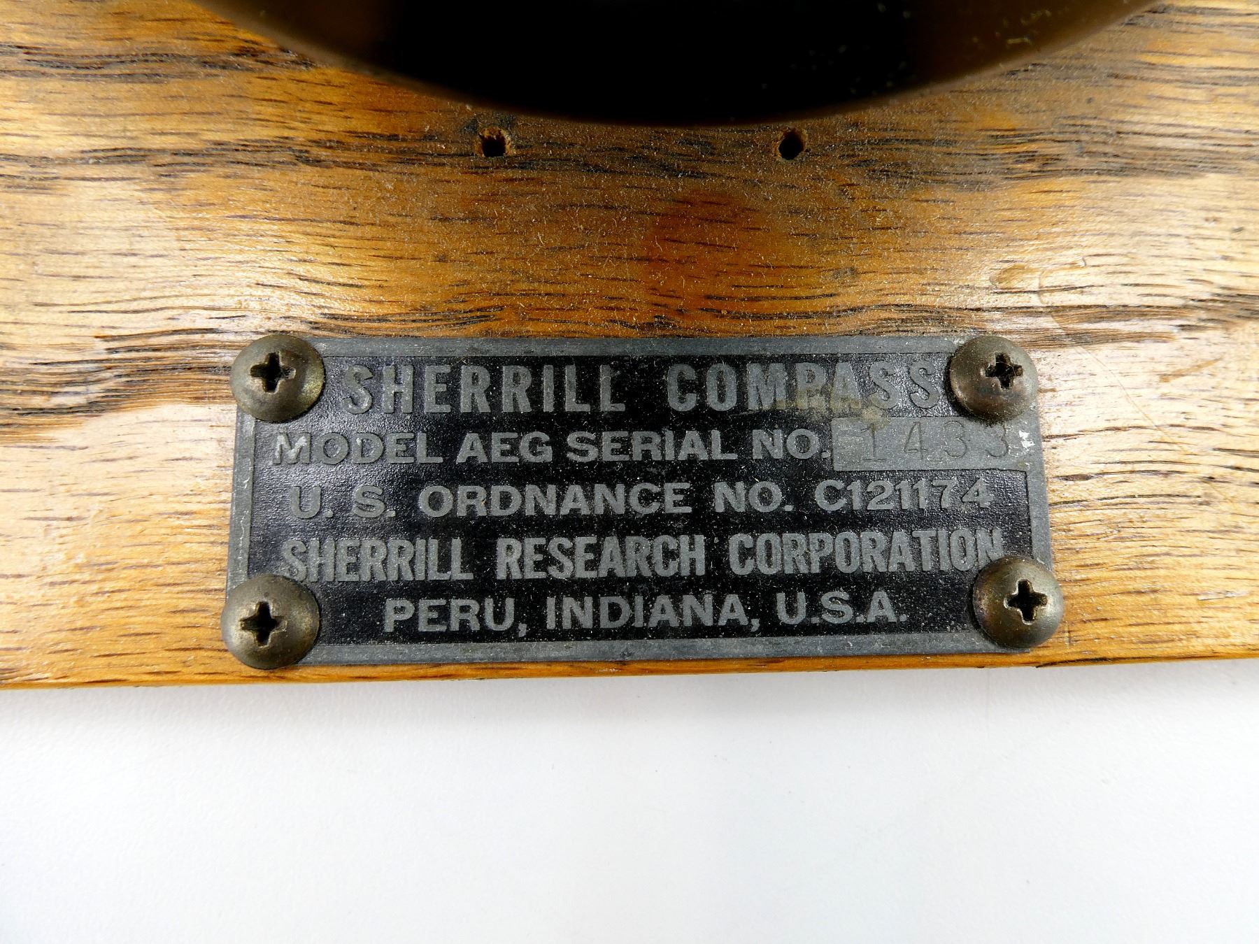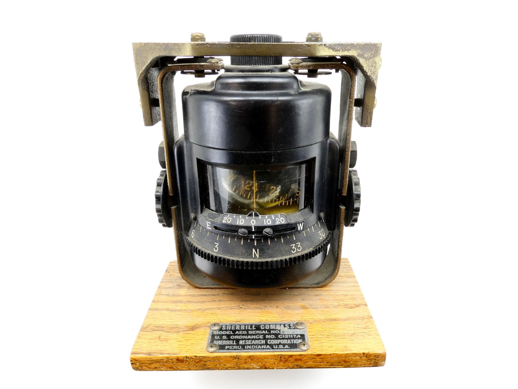 (1) METAL / PLASTIC CONSTRUCTED SHERRILL MODEL AEG COMPASS, DATA PLATE MARKED: "SHERRILL COMPASS, MODEL AEG SERIAL NO. 1433, U.S. ORDNANCE NO. C121174, SHERRILL RESEARCH CORPORATION" ETC., ON WOODEN BASE, COMPASS FLUID UNDER GLASS, APPROX. 4.5" X 6.25" X 7 5/8". SEE PHOTOS. *NO GUARANTEE ON GLASS FOR SHIPPING*