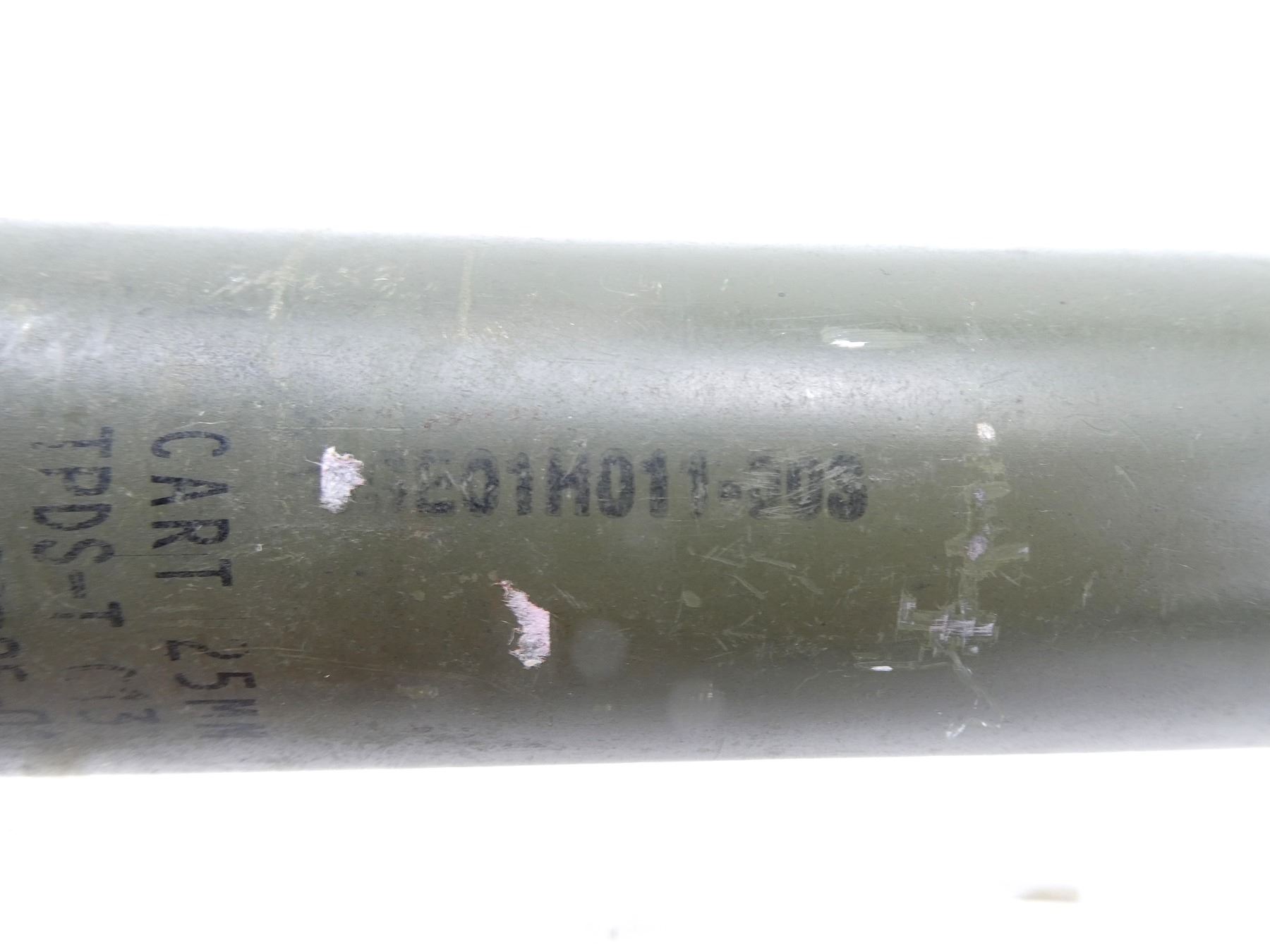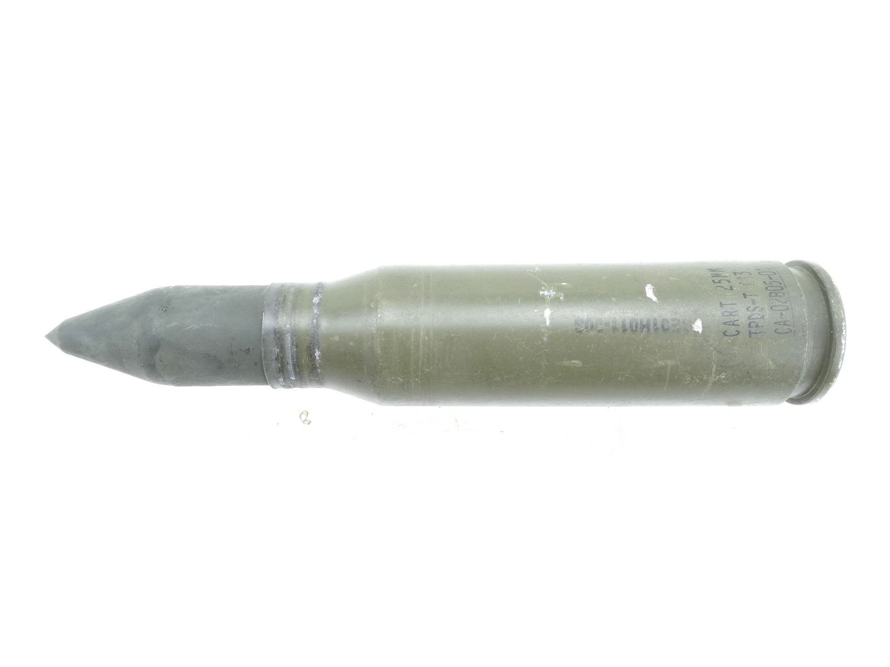 (1) GREEN PAINTED CASE, GREY PAINTED PROJECTILE, GREY PAINTED COPPER DRIVING BAND, FIRED PRIMER, MARKED: "CART 25MM, TPDS-T C131, CA-02B05-01" & "USE01H011-003", APPROX. 1.5" DIA., OAL APPROX. 7 5/8". SEE PHOTOS.