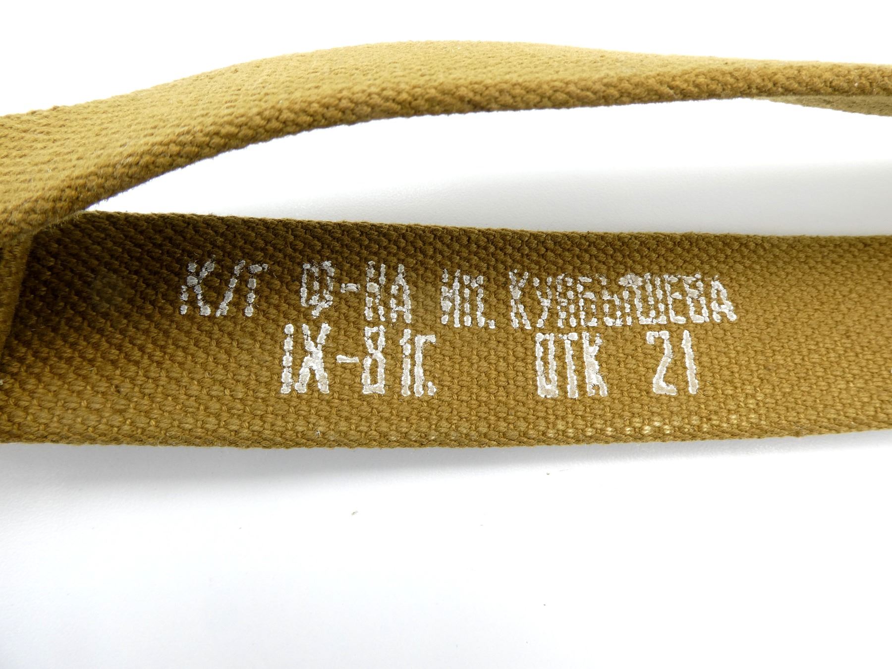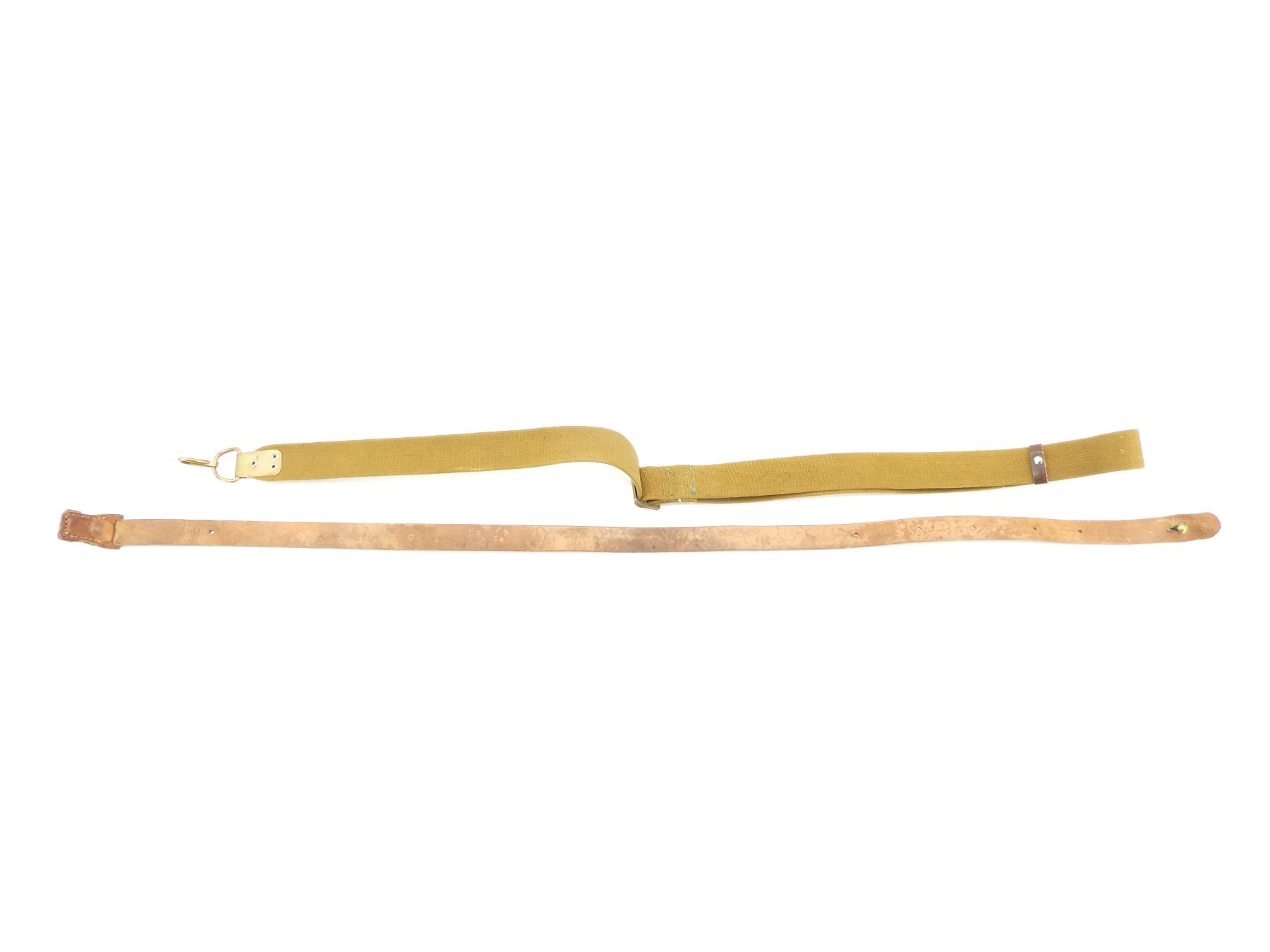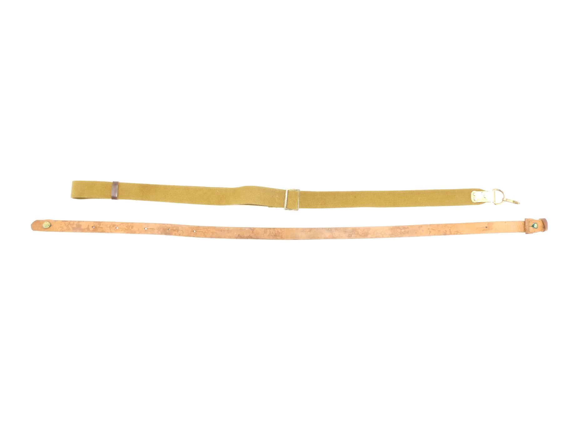 LOT INCLUDES; (1) RUSSIAN / COMBLOC SKS / AK47 / AKM SLING, TAN CANVAS, STEEL FITTINGS, STEEL HOOK, VARIOUS MARKINGS, OAL APPROX. 56", ADJUSTABLE & (1) UNKNOWN MILITARY TAN LEATHER MAUSER SLING, NO VISIBLE MARKINGS, BRASS FITTINGS, OAL APPROX. 43.75". SEE PHOTOS.
