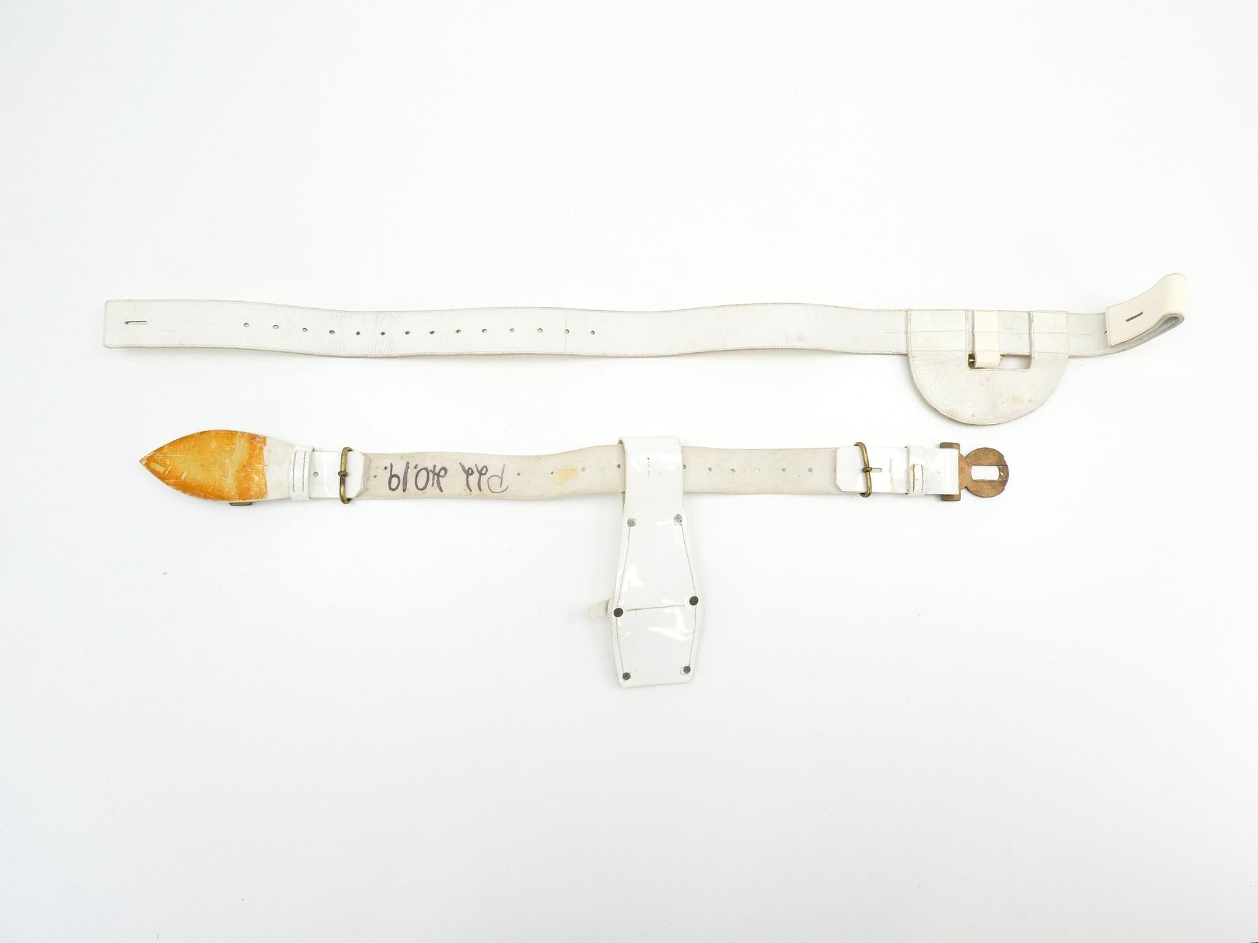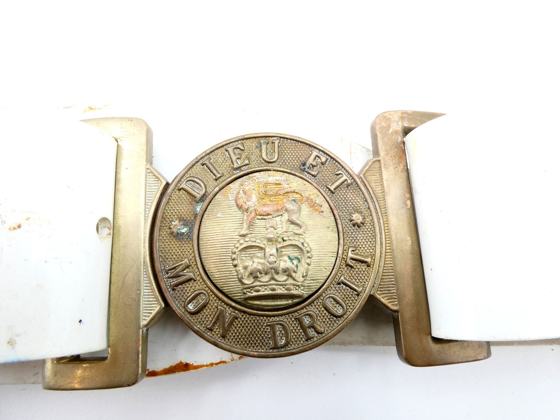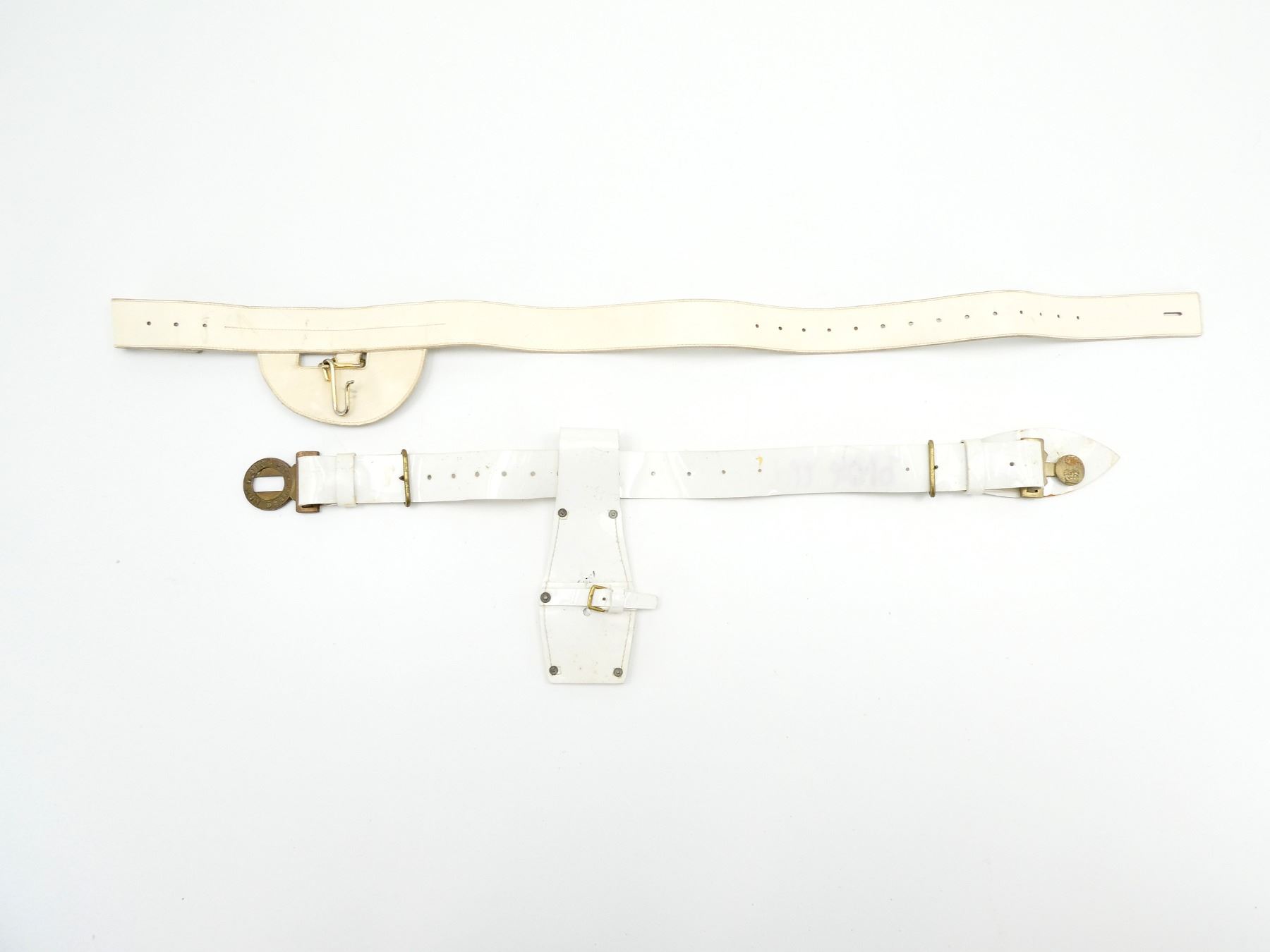 LOT INCLUDES; (1) WHITE PLASTIC PARADE BELT WITH BRASS BELT BUCKLE & SWORD HANGER, BUCKLE MARKED: "DIEU ET MON DROIT" WITH LION OVER QUEEN'S CROWN, BRASS FITTINGS, OAL APPROX. 36" & (1) WHITE LEATHER PARADE BELT WITH SWORD HANGER, NO VISIBLE MARKINGS, OAL APPROX. 45". SEE PHOTOS.