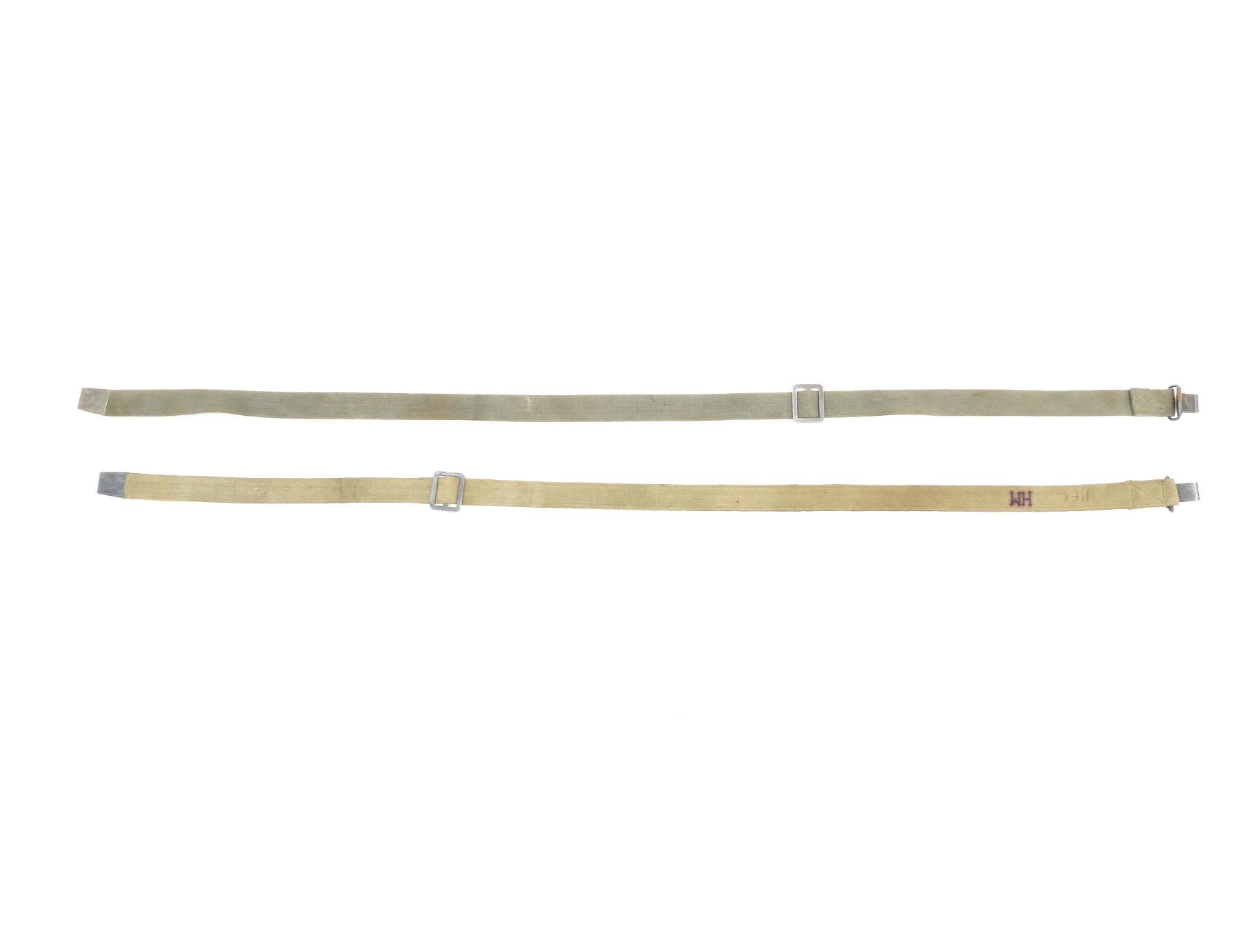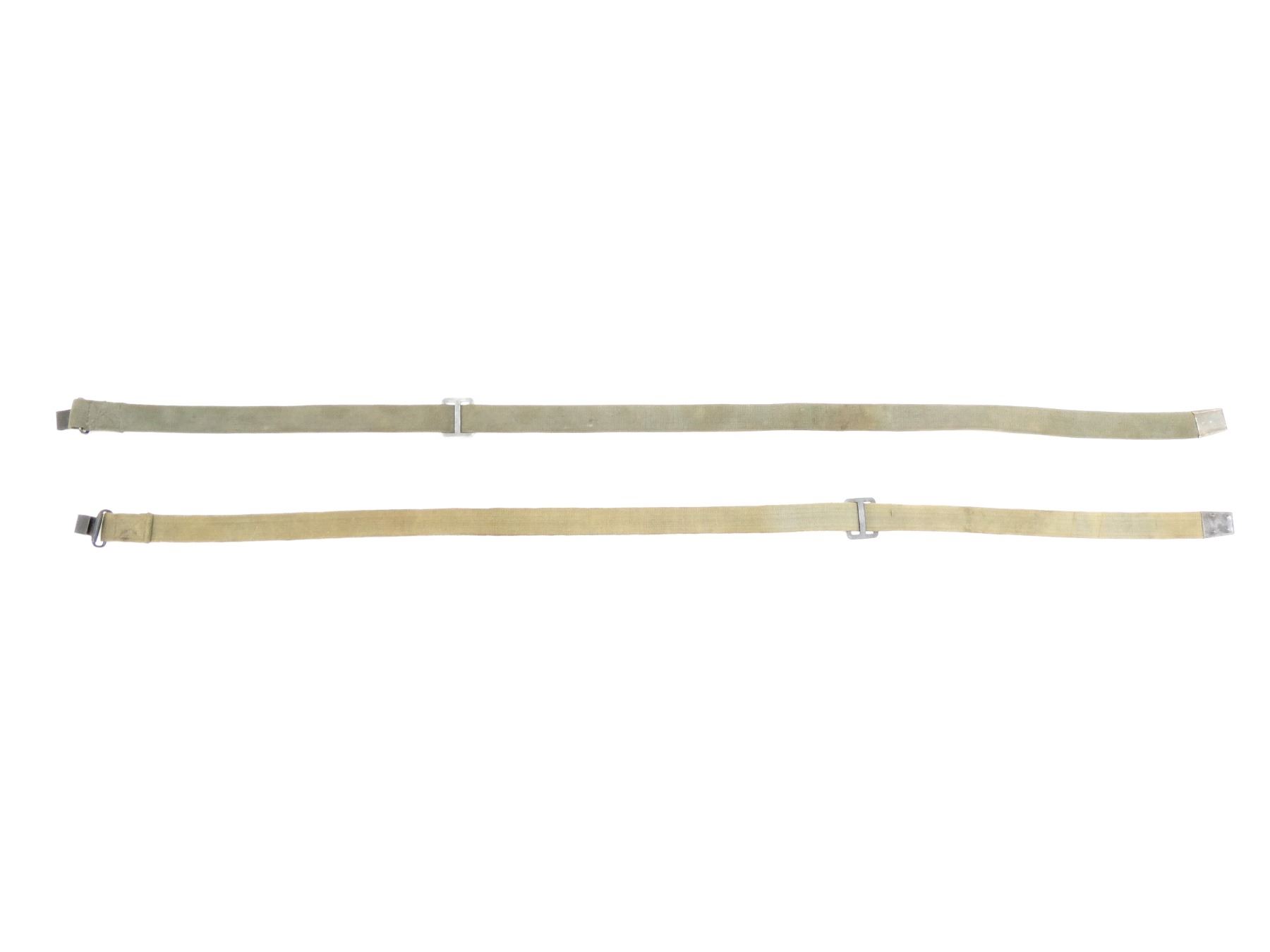 LOT INCLUDES; (2) GREEN CANVAS SLINGS, ONE WITH VARIOUS HAND-WRITTEN MARKINGS, OTHER HAS NO VISIBLE MARKINGS, METAL FITTINGS, OALS APPROX. 46.5" & 47.75". SEE PHOTOS.