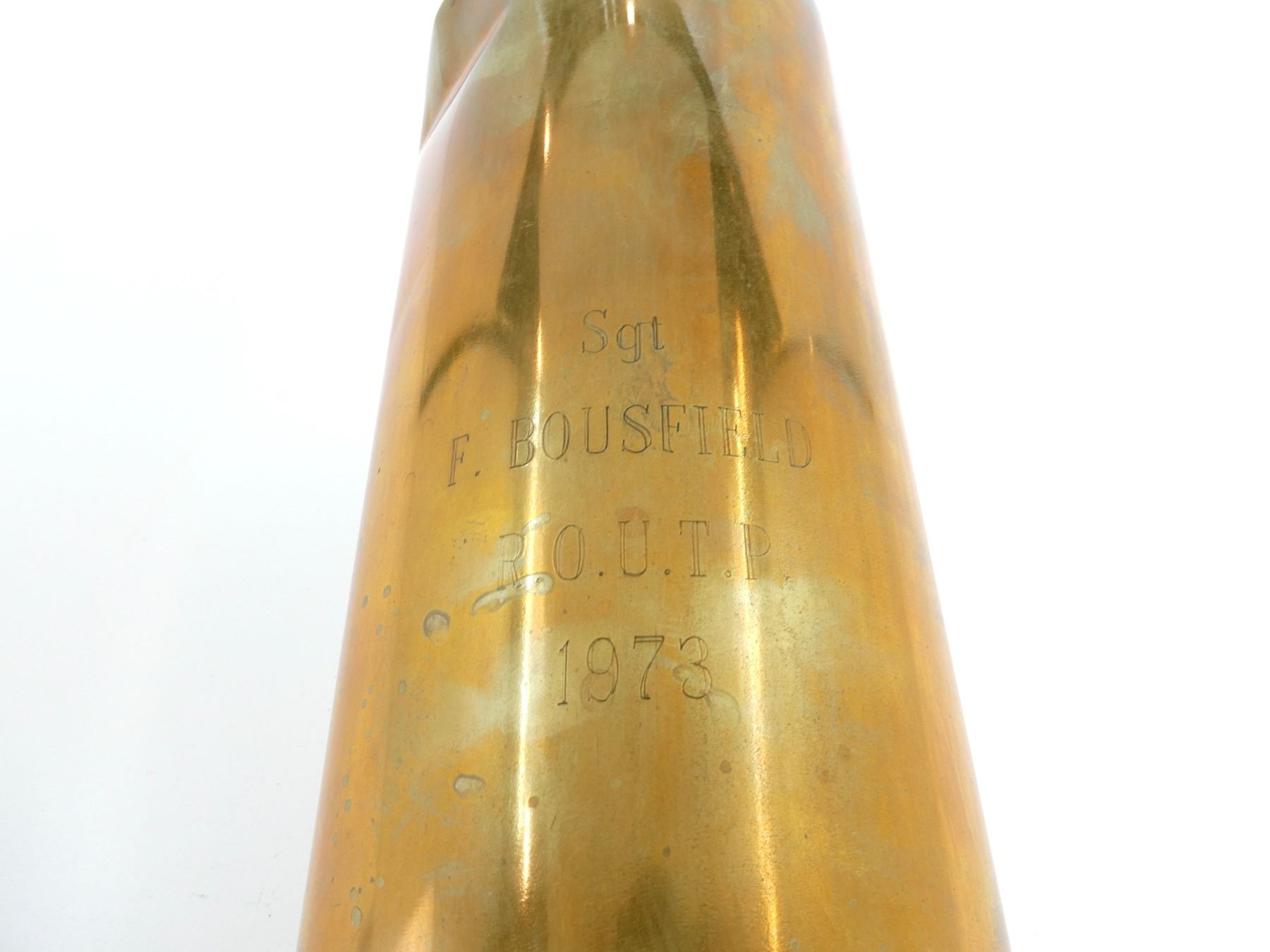 (1) CANADIAN BRASS SHELL CASING, PRIMER INTACT, MARKED: "SGT F.BOUSFIELD R.O.U.T.P 1973, 105H DUAL GRAN, 105 MM M14, LOT - IVI-1-1, VARIOUS FAINT / UN-CLEAR MARKINGS, APPROX. DIA. 4.25", APPROX. OAL 14.5". SEE PHOTOS.