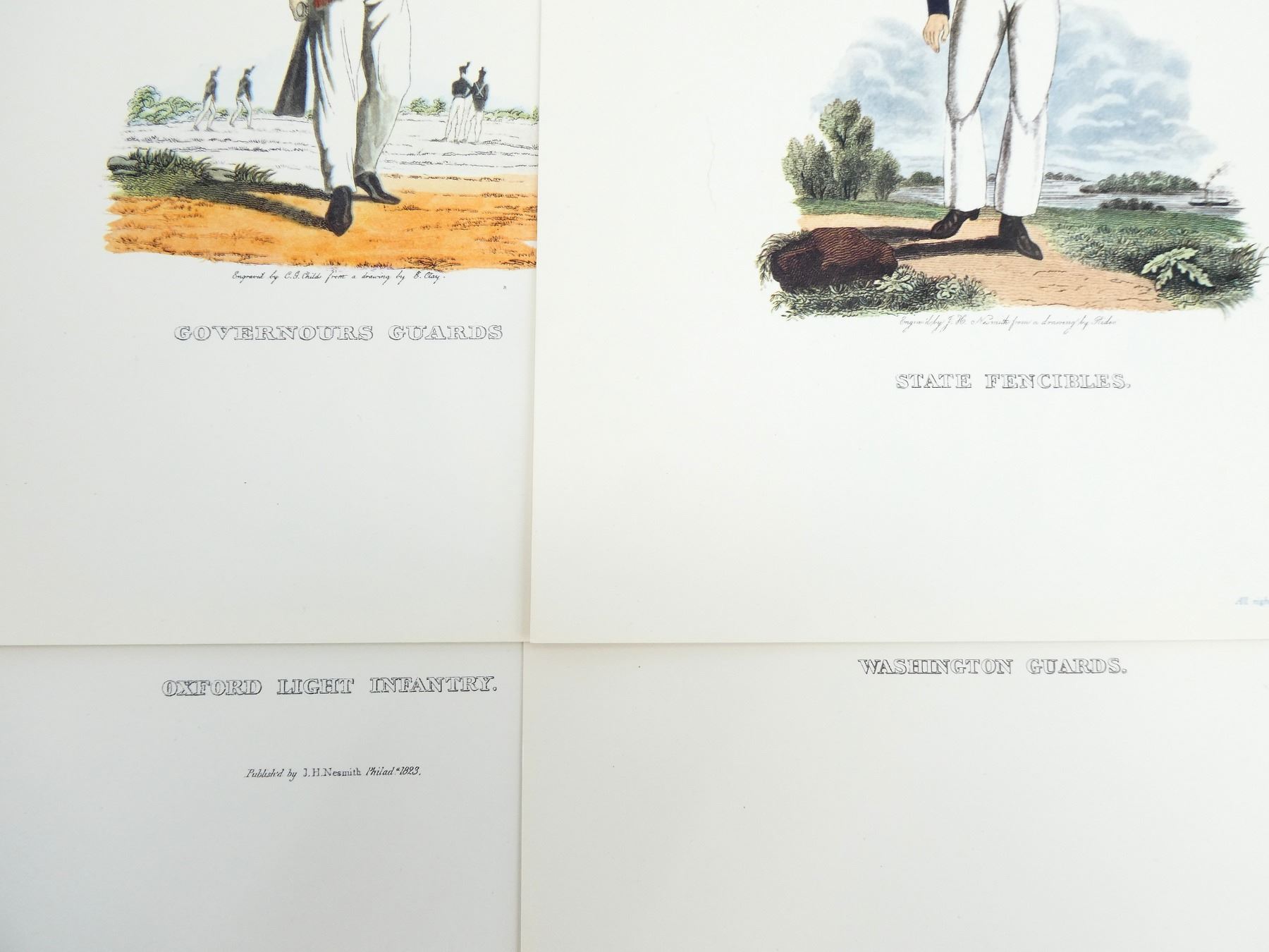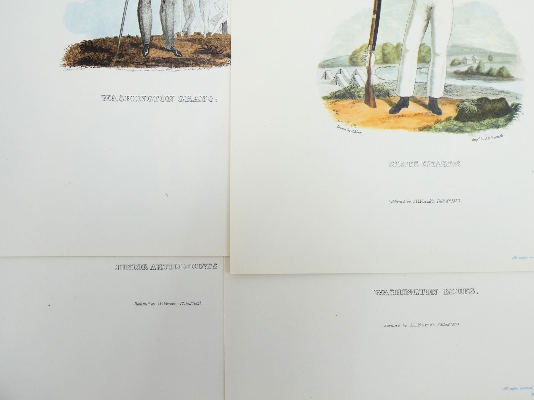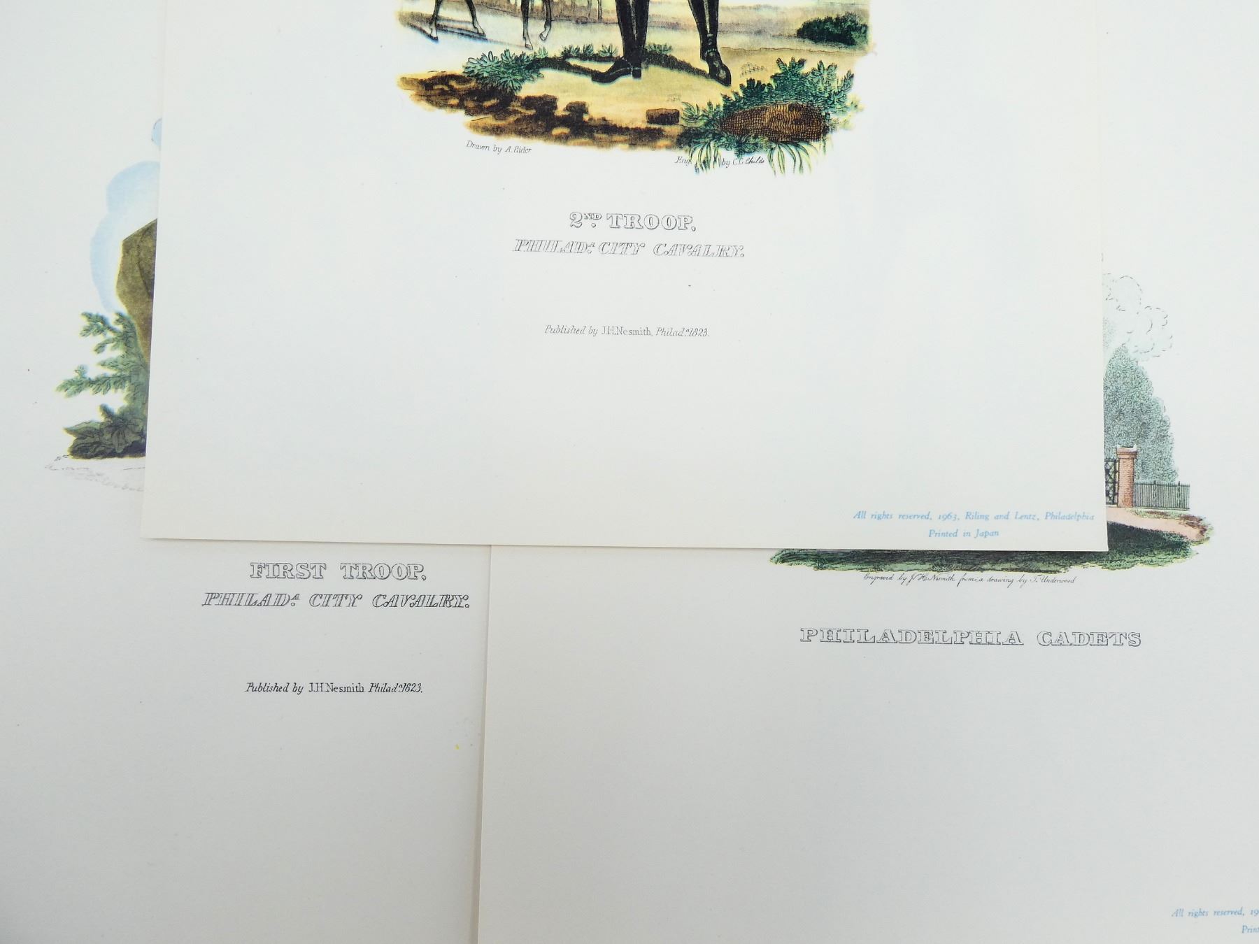 APPROX. (11) COLOUR PLATES FROM "THE SOLDIER'S MANUAL" BY JAMES H. NESMITH, ONE OF 2000 SETS AVAILABLE, INCLUDES; "WASHINGTON BLUES", "STATE GUARDS", "PHILADELPHIA CADETS", "GOVERNOURS GUARDS", "WASHINGTON GUARDS", "JUNIOR ARTILLERISTS", "WASHINGTON GRAYS", "OXFORD LIGHT INFANTRY", "STATE FENCIBLES", "2ND TROOP, PHILAD. CITY CAVALRY", "FIRST TROOP, PHILAD. CITY CAVALRY", PUBLISHED BY RILING AND LENTZ, PHILADELPHIA, PRINTED IN JAPAN, PRINTS APPROX. 8" X 10.5". SEE PHOTOS.
