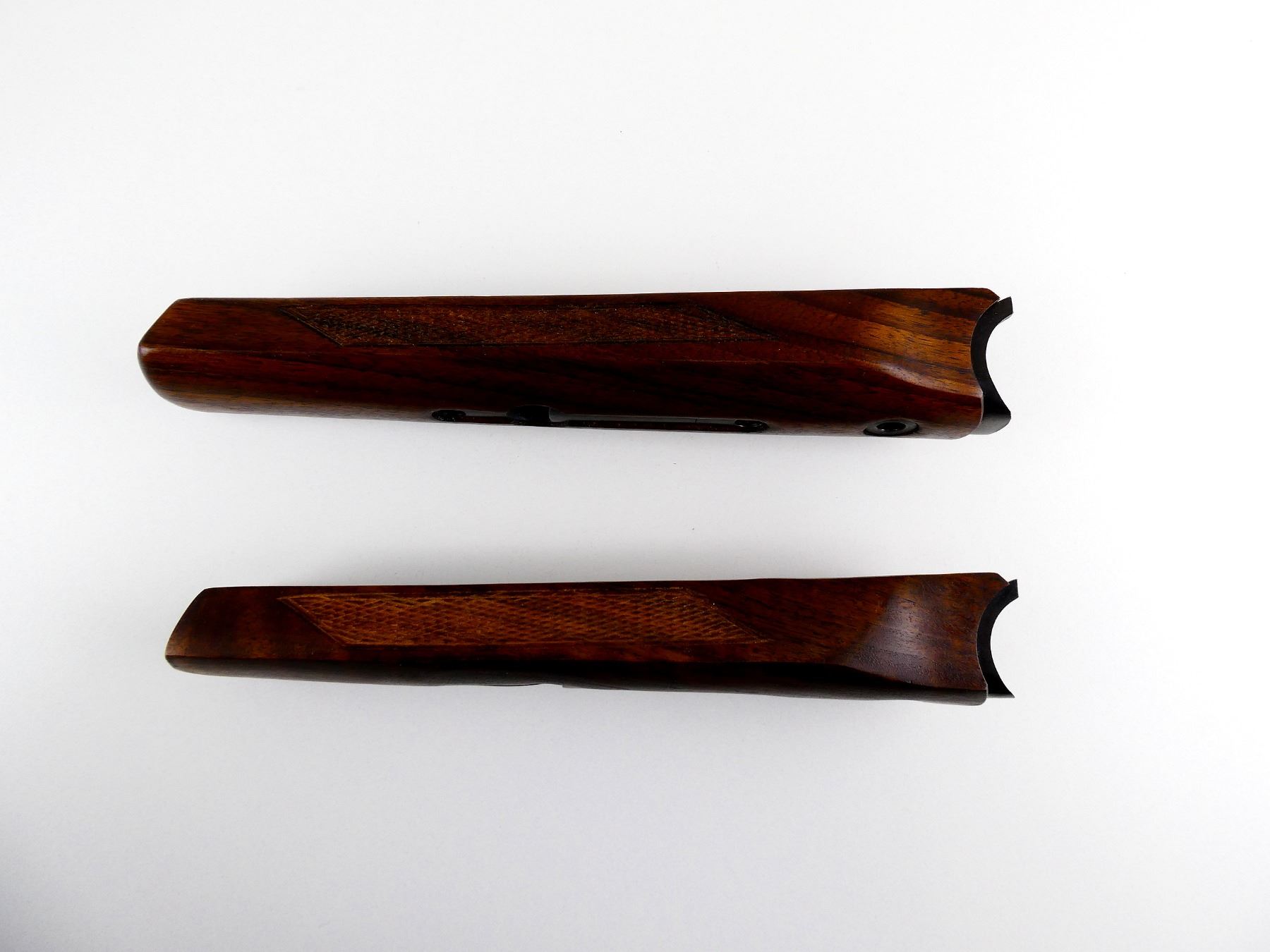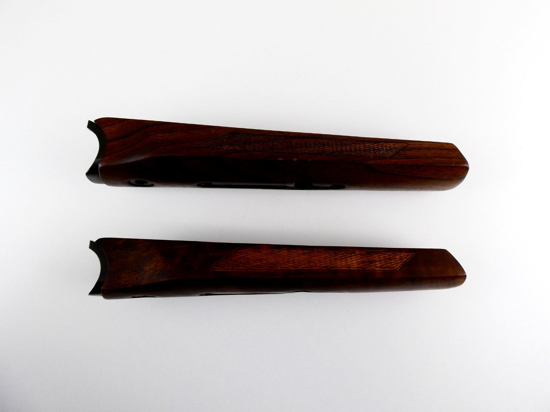 LOT INCLUDES; (2) WOODEN FORENDS, POSSIBLY FITS .410 GAUGE AND / OR 20 GAUGE SHOTGUNS ?, CHECKERED, MAY HAVE SMALL CRACKS & CHIPS, OAL APPROX. 9.25". MAY REQUIRE FITTING. SEE PHOTOS.