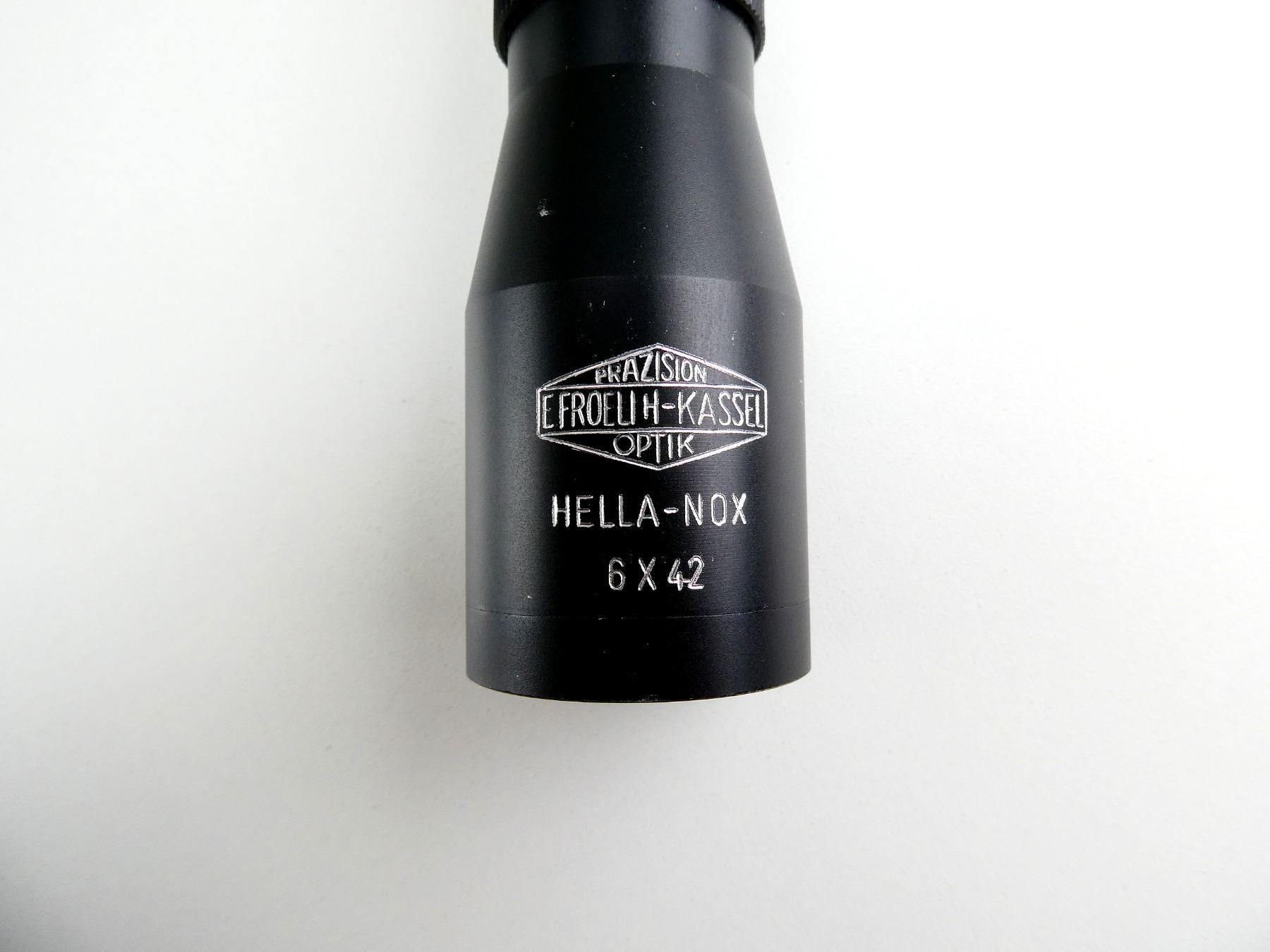 (1) CLEAR OPTICS, GERMAN NUMBER 1 RETICLE, 1" TUBE DIAMETER, WORKING MAGNIFICATION RING, WINDAGE & ELEVATION KNOBS TURN, MARKED: "PRAZISION EFROELIH-KASSEL OPTIK", "HELLA-NOX", "6X42", ETC., SHOWS WEAR & TEAR / USE MARKS. SEE PHOTOS.