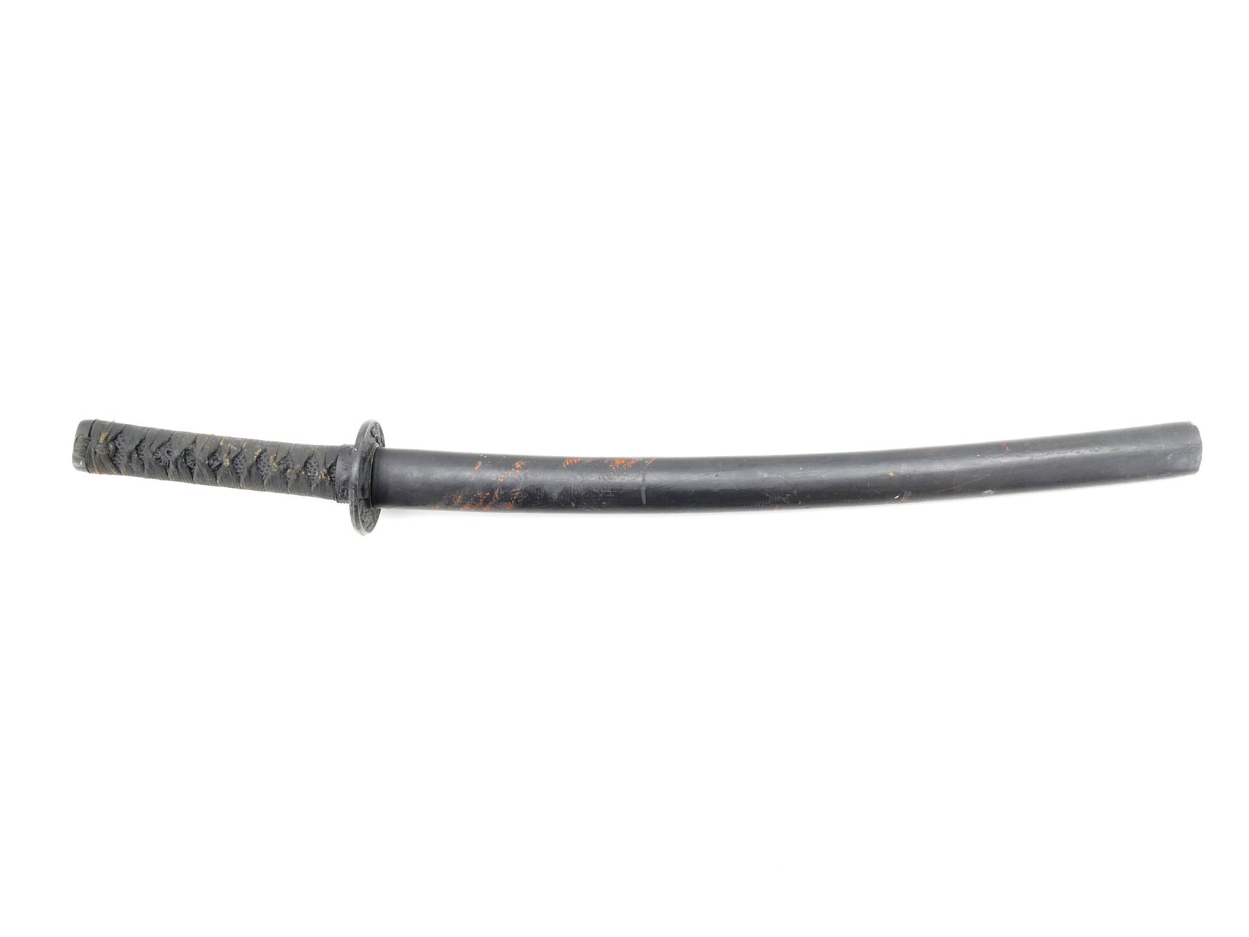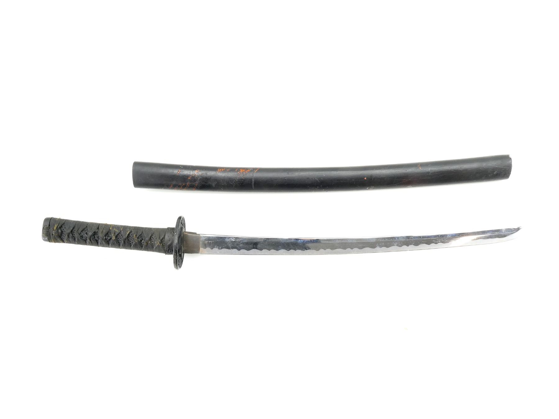 (1) STEEL BLADE UNMARKED, BLACK PAINTED METAL HAND GUARD, BLACK LACE WRAPPED HILT WITH DRAGON ?, BLACK PAINTED WOOD SHEATH, BLADE APPROX. 28" & OAL APPROX. 25.75". SEE PHOTOS.