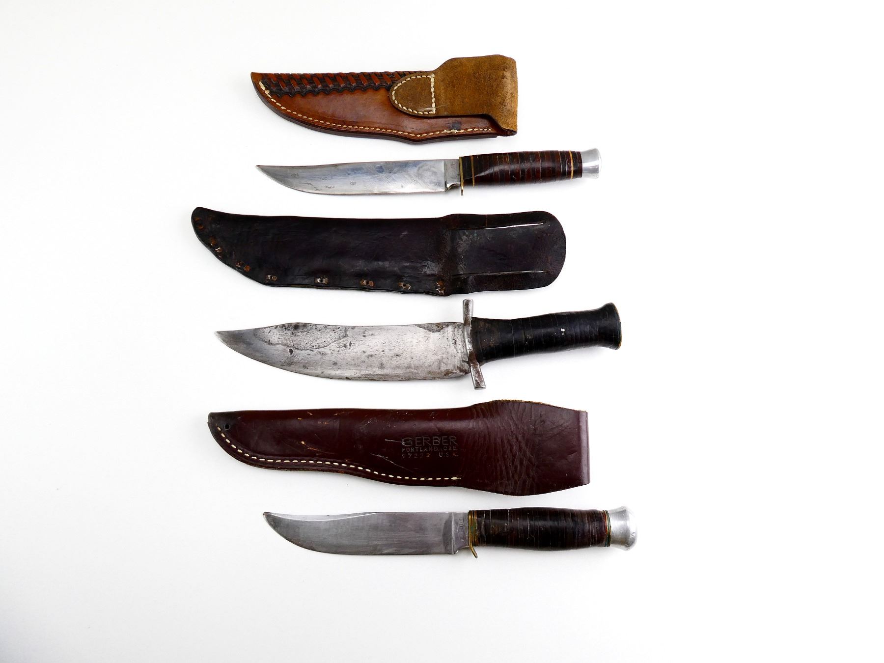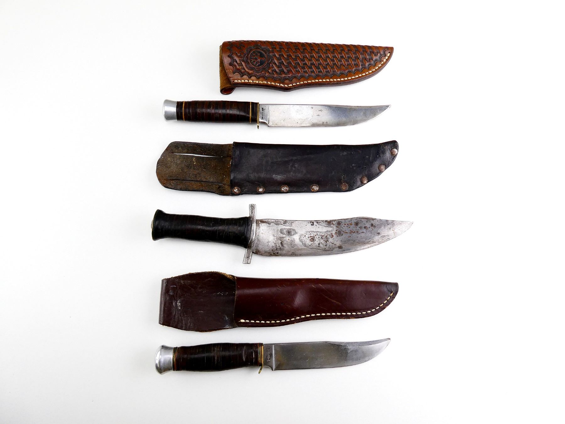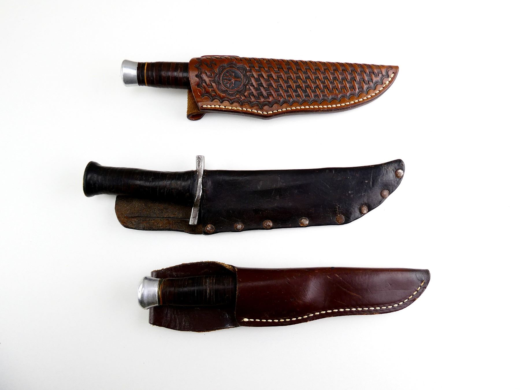 LOT INCLUDES; (3) STEEL FIXED BLADE KNIVES, LEATHER WASHER STYLE GRIP, VARIOUS MARKINGS, WITH LEATHER SHEATHS, BLADES APPROX. 5 1/8"-6.75" & OAL APPROX. 9 1/8"-11". SEE PHOTOS.