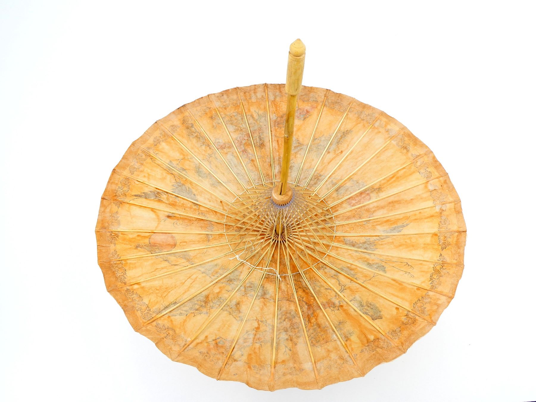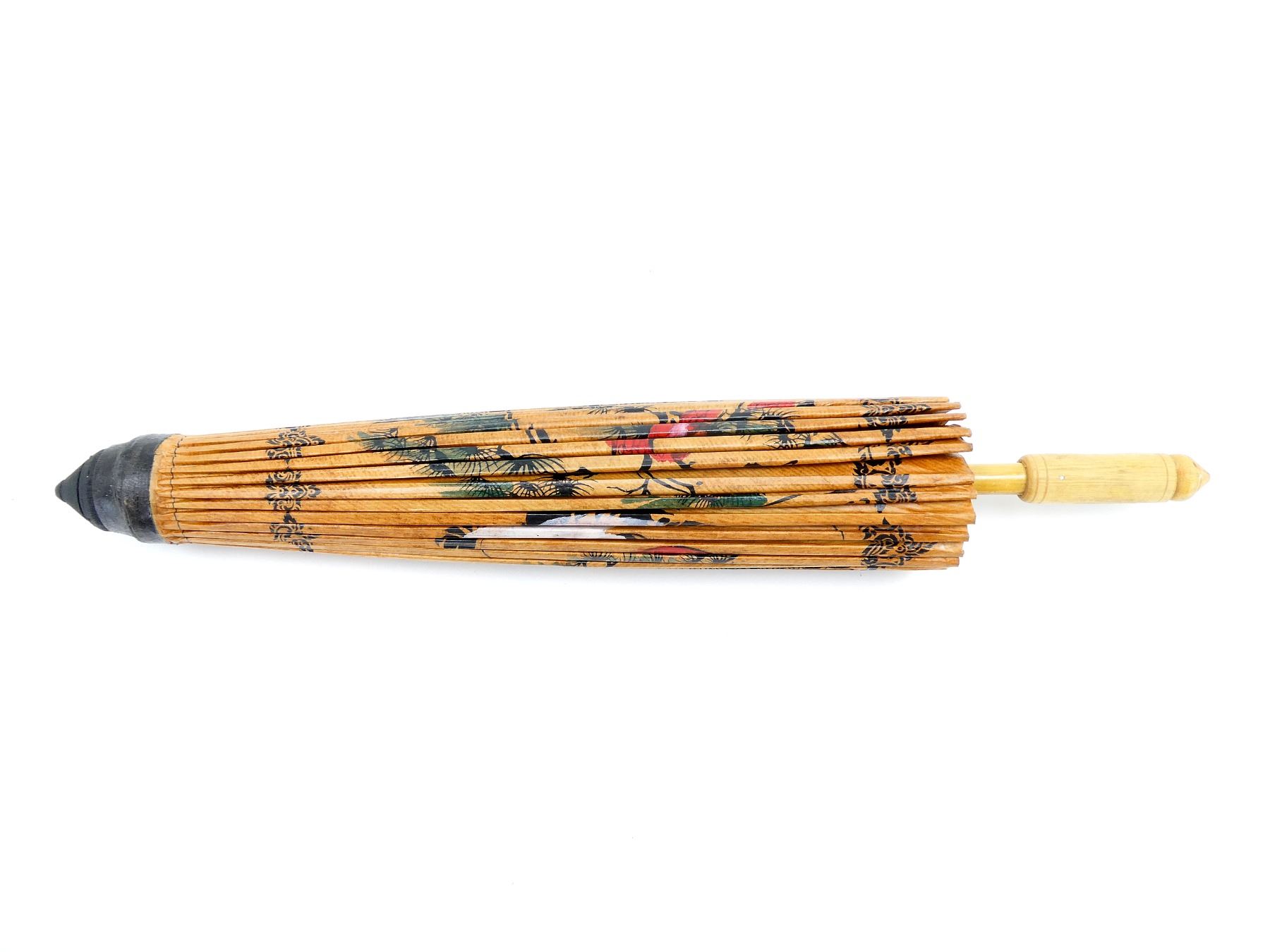 (1) ORNAMENTAL UMBRELLA, RICE PAPER ? & BAMBOO, VARIOUS DESIGNS & MARKINGS, APPROX. 29" DIA., OAL APPROX. 24". SEE PHOTOS.