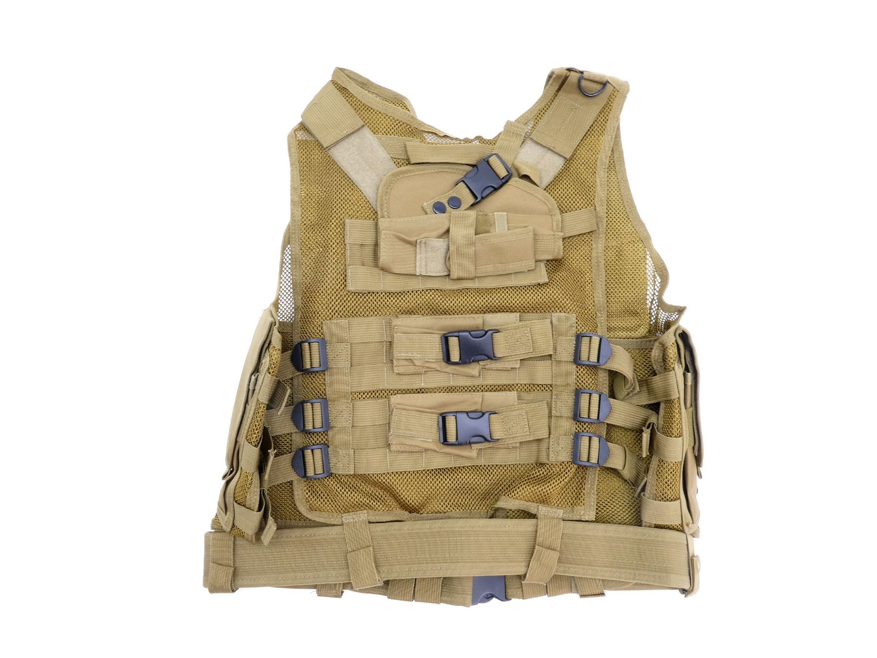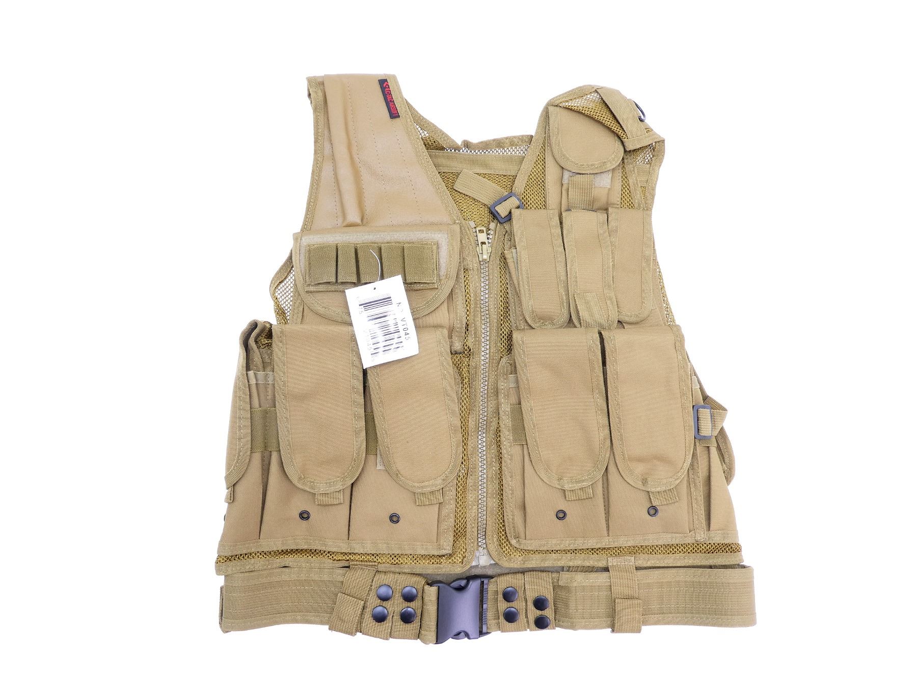 (1) COYOTE BROWN, POLYESTER CONSTRUCTION, ADJUSTABLE WITH SIX LARGE RIFLE MAGAZINE POUCHES, TWO SMALL UTILITY POUCHES & TWO MAP POUCHES ON THE INSIDE, WITH ZIP CLOSURES, ADJUSTABLE, NOS, WITH ORIGINAL TAGS. SEE PHOTOS.