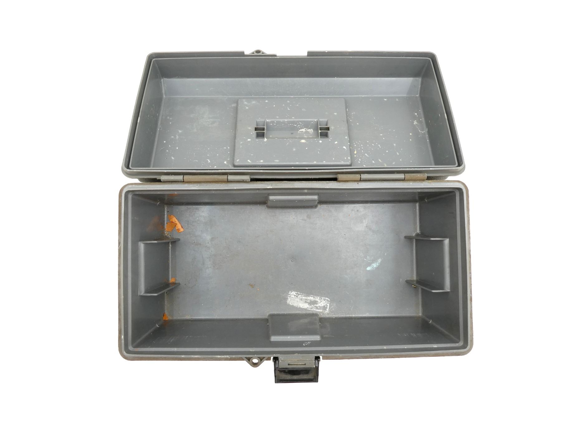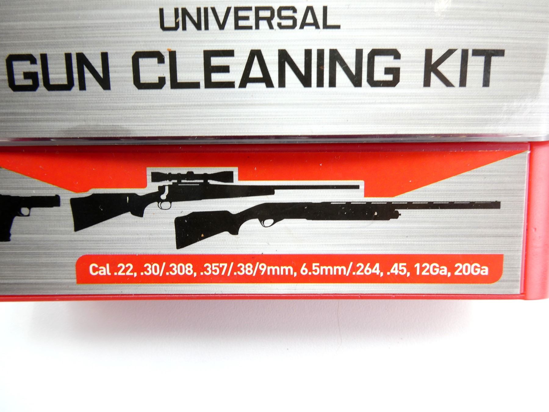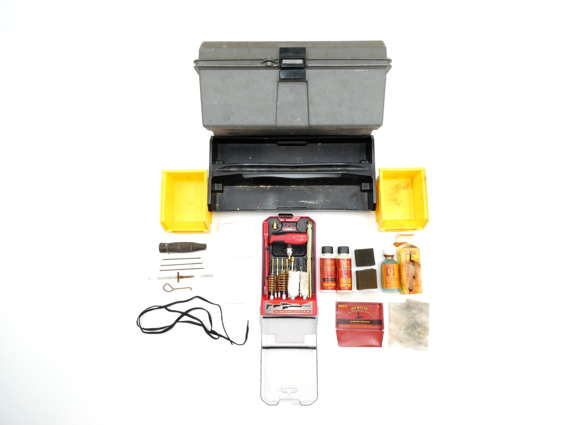 LOT INCLUDES; (1) OUTERS CLEANING KIT WITH GUN BLUE, METAL CLEANER, SPONGES, ETC., (1) HOPPE'S GUN BLUE WITH ORIGINAL PACKAGING, (1) BIRCHWOOD CASEY UNIVERSAL GUN CLEANING KIT, FITS VARIOUS CALIBERS, WITH 5-PIECE BRASS CLEANING ROD, 7-PIECE BORE BRUSHES, 5-PIECE BRASS JAGS, 2-PIECE MOP BRUSH, PATCHES, ETC., (1) PERFECT MALLARD DUCK CALL, VARIOUS MARKINGS, (1) GREY PLASTIC TOOL / TACKLE BOX, REMOVEABLE TRAY, APPROX. 16" X 8" X 7.25", ETC. SEE PHOTOS. ** PICK UP ONLY **