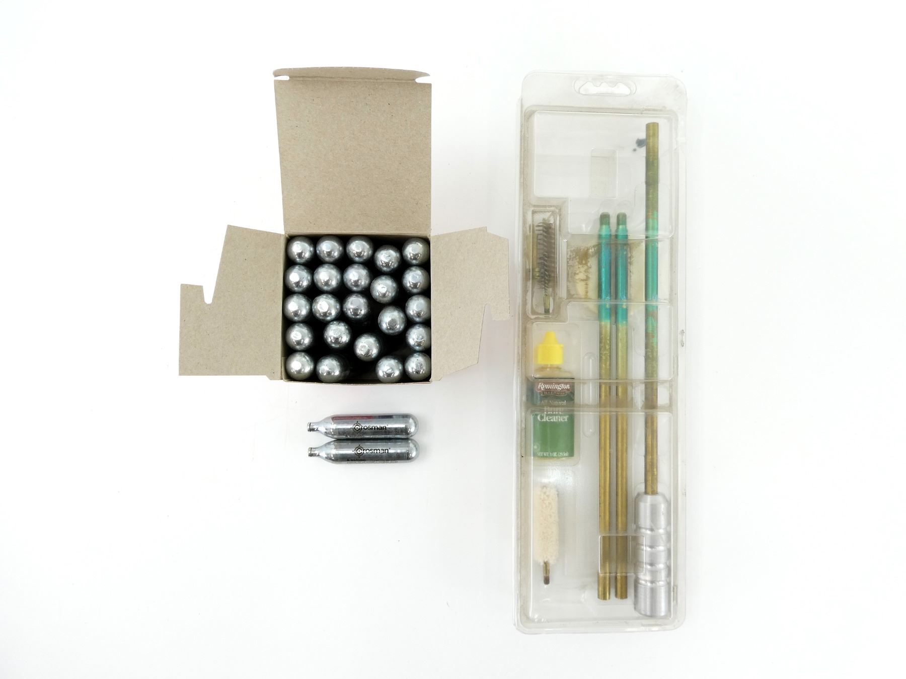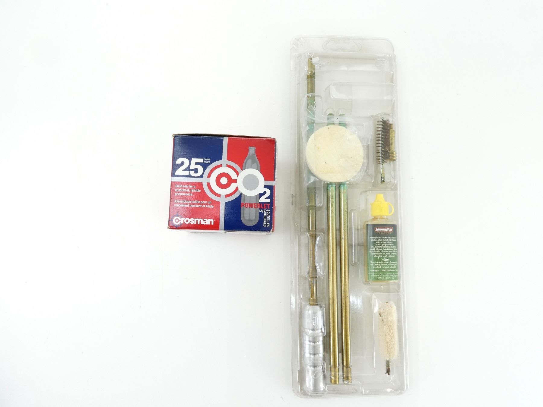 LOT INCLUDES; (1) REMINGTON GUN CLEANING KIT, WITH BORE CLEANER, COTTON MOP BRUSH, WIRE BRUSH, JAG, 3-PIECE CLEANING ROD, ETC. & APPROX. (25) CROSMAN CO2 POWERLETS, ONE IS USED, 12 GRAM CARTRIDGES, IN ORIGINAL BOX. SEE PHOTOS. ** PICK UP ONLY **