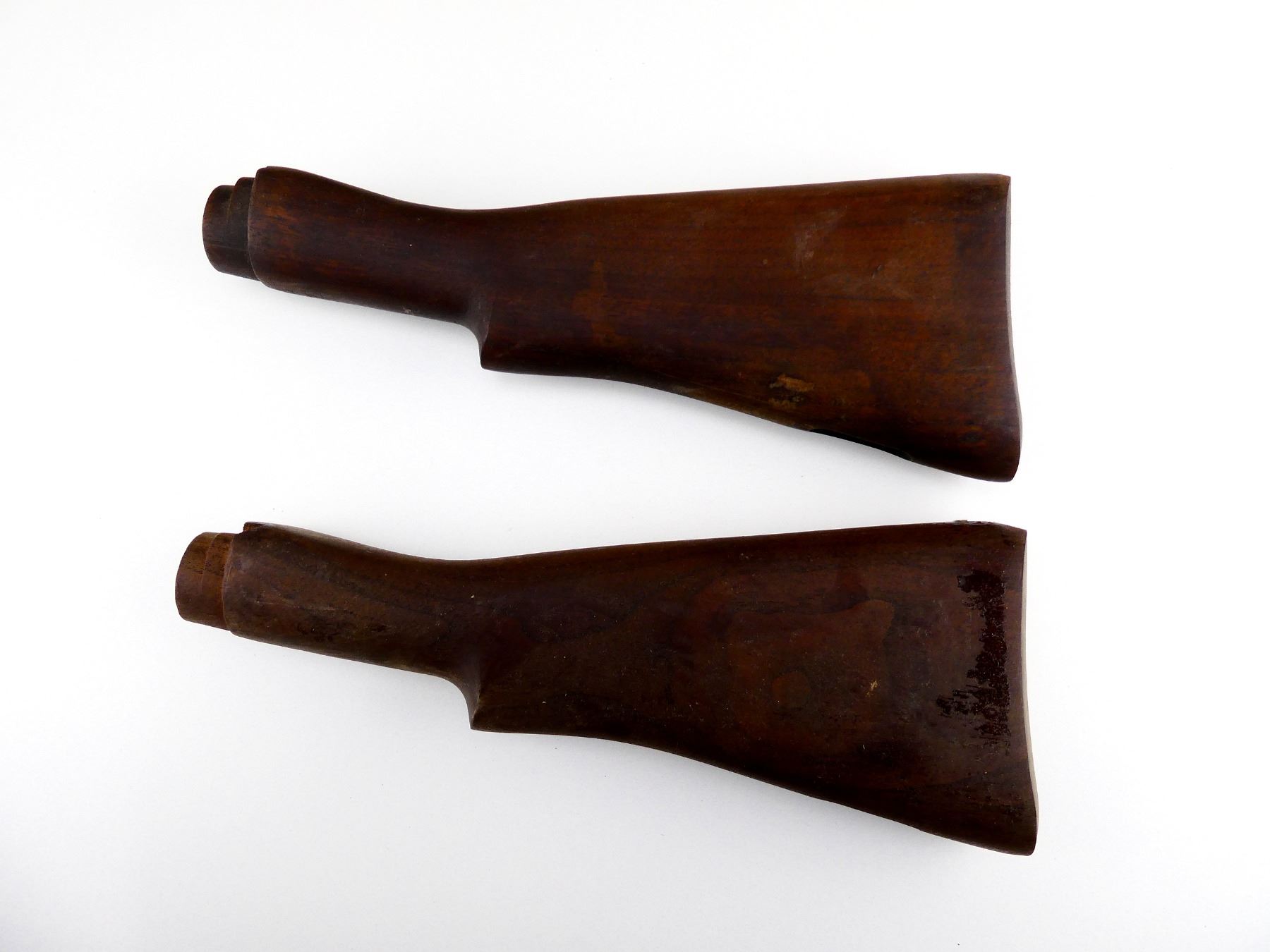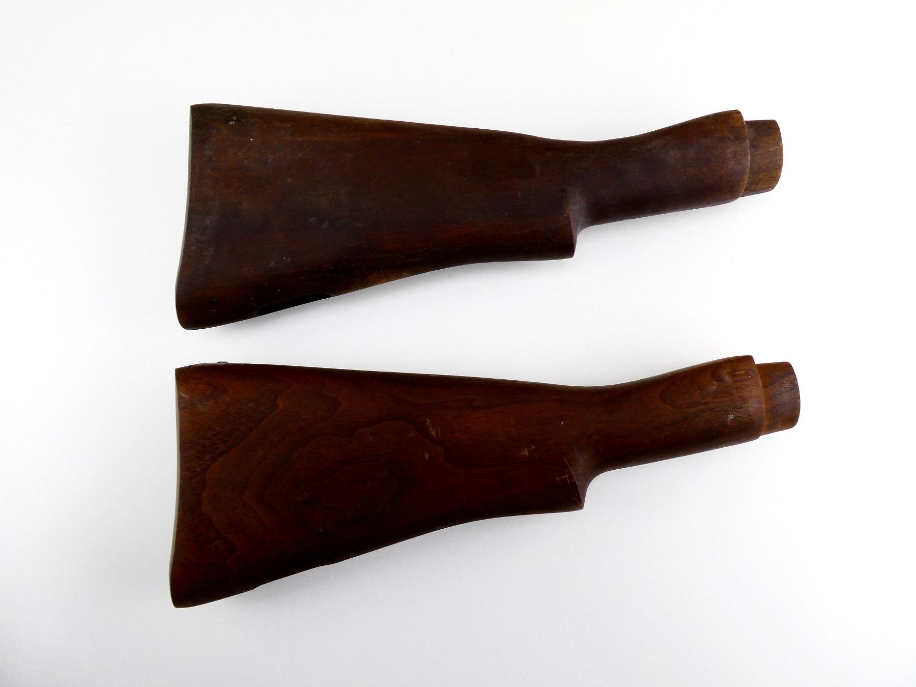 LOT INCLUDES; (2) FITS LEE ENFIELD NO.4 SERIES' RIFLES, WALNUT WOOD CONSTRUCTION, NO PARTS, MARKED: "B", BANTAM LENGTH OAL APPROX. 12.25". MAY REQUIRE FITTING. SEE PHOTOS.
