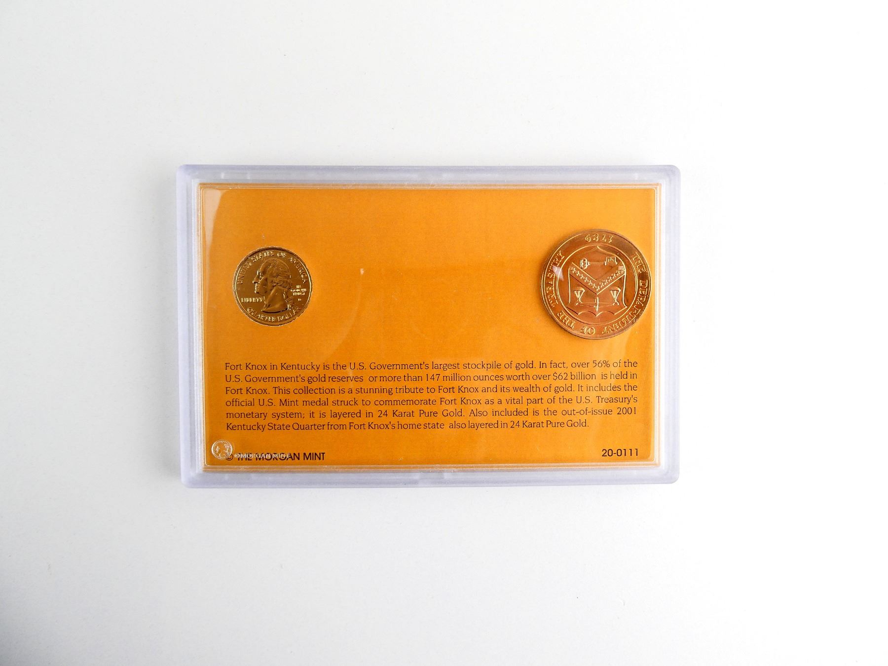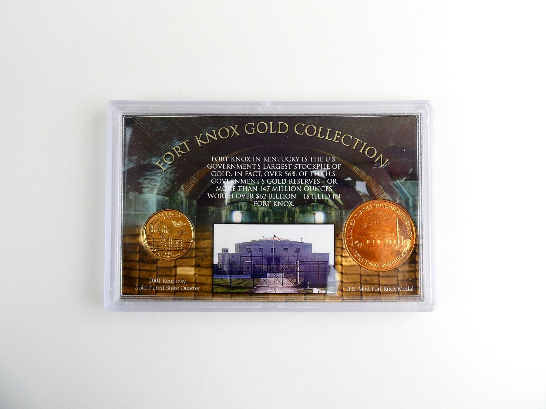 LOT INCLUDES; (1) 2001 KENTUCKY GOLD PLATED STATE QUARTER, LAYERED IN 24 KARAT PURE GOLD & (1) U.S. MINT FORT KNOX MEDAL, LAYERED IN 24 KARAT PURE GOLD, BOTH IN PROTECTIVE CASE WITH INFORMATION ON EACH PIECE. SEE PHOTOS.