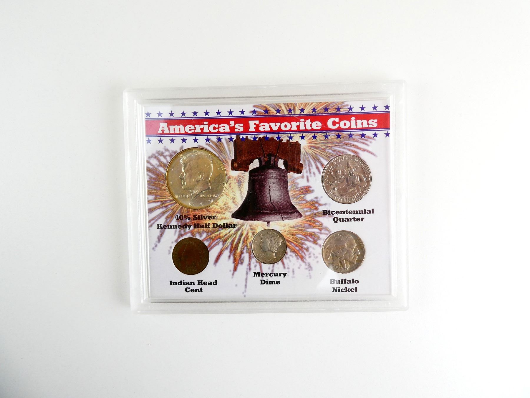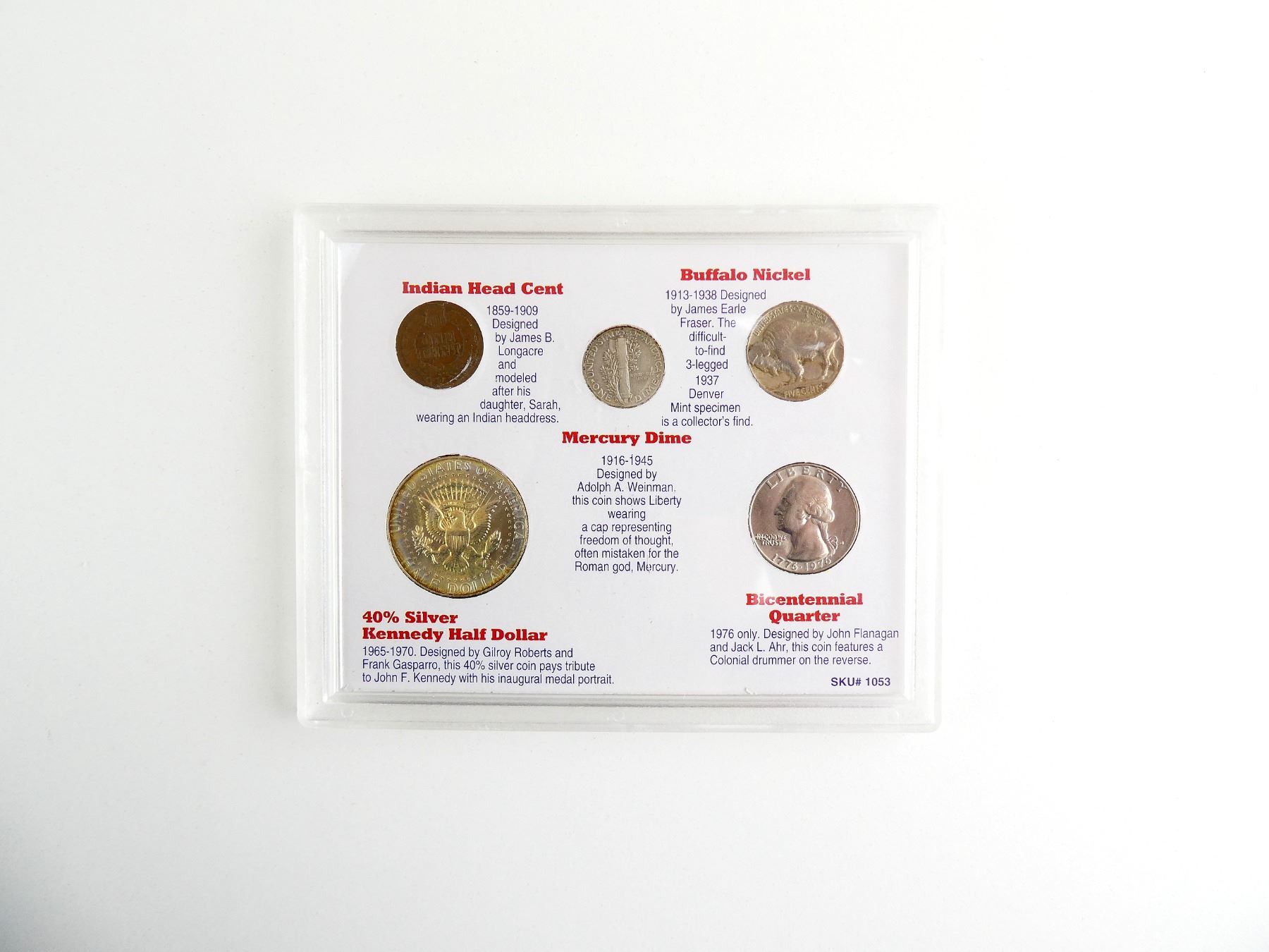 LOT INCLUDES; (1) NATIVE AMERICAN HEAD PENNY, DATED 1908, (1) MERCURY DIME, DATED 1944, (1) BUFFALO NICKEL, DATED 1930, (1) BICENTENNIAL QUARTER, DATED 1976 & (1) 40% SILVER KENNEDY HALF DOLLAR, ALL IN PROTECTIVE CASE WITH VARIOUS INFORMATION ABOUT COINS. SEE PHOTOS.