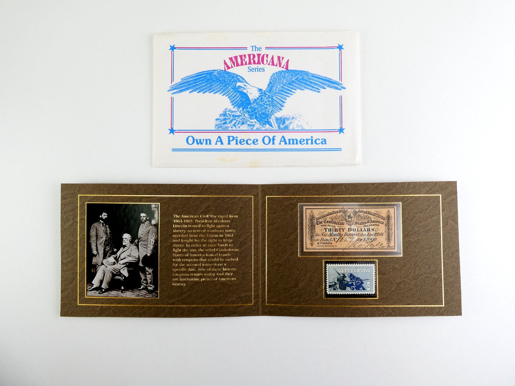 LOT INCLUDES; (1) CONFEDERATE BOND COUPON, MARKED: "THE CONFEDERATE STATES OF AMERICA, WILL PAY TO THE BEARER, (THIRTY DOLLARS), FOR SIX MONTHS INTEREST DUE JAN 1ST 1814, ON BOND NO. 8059 FOR 1000" ETC. & (1) 5 CENT CIVIL WAR CENTENNIAL GETTYSBURG STAMP, DATED 1863 - 1963, BOTH ON CARDBOARD WITH VARIOUS INFORMATION ABOUT THE BOND COUPON. SEE PHOTOS.