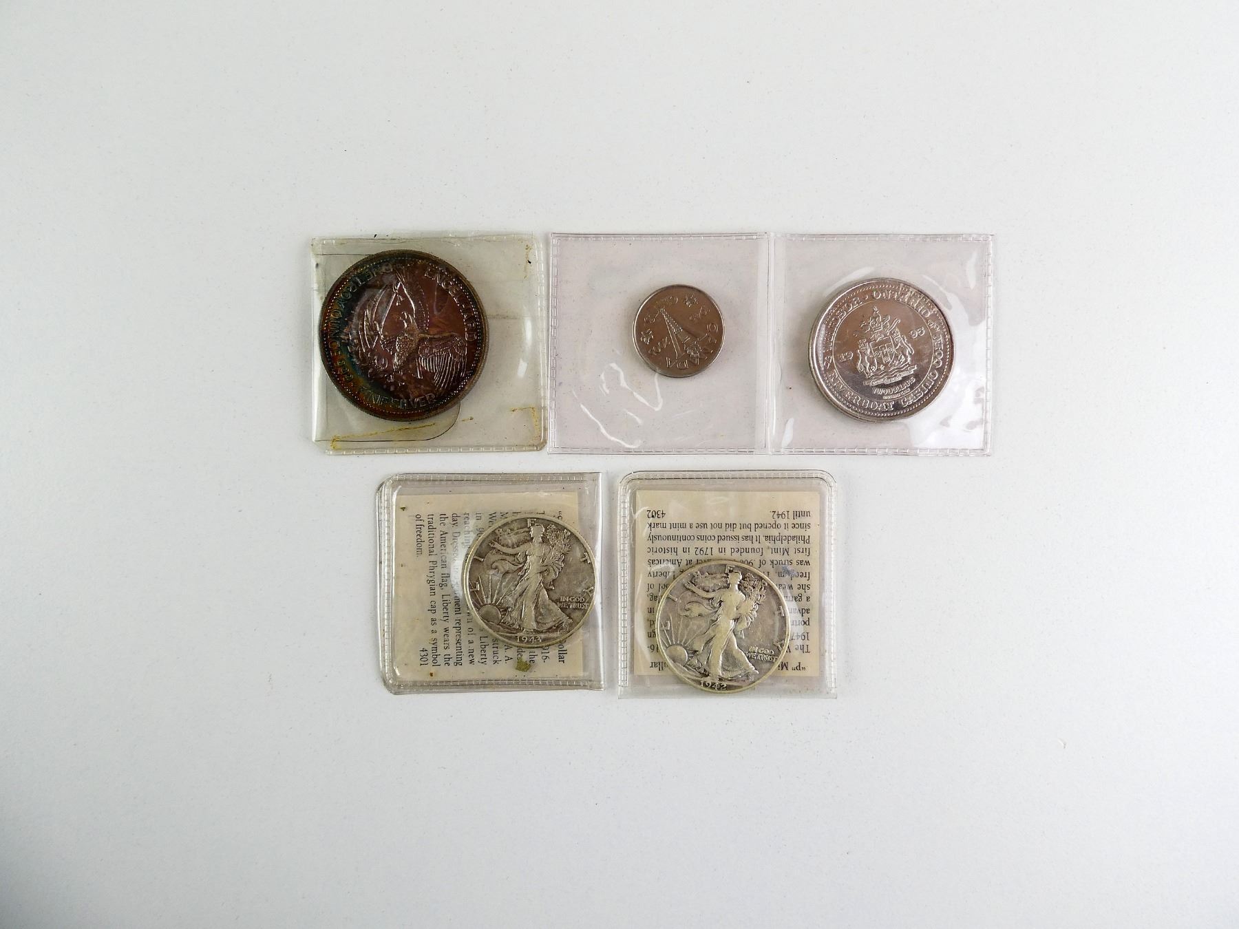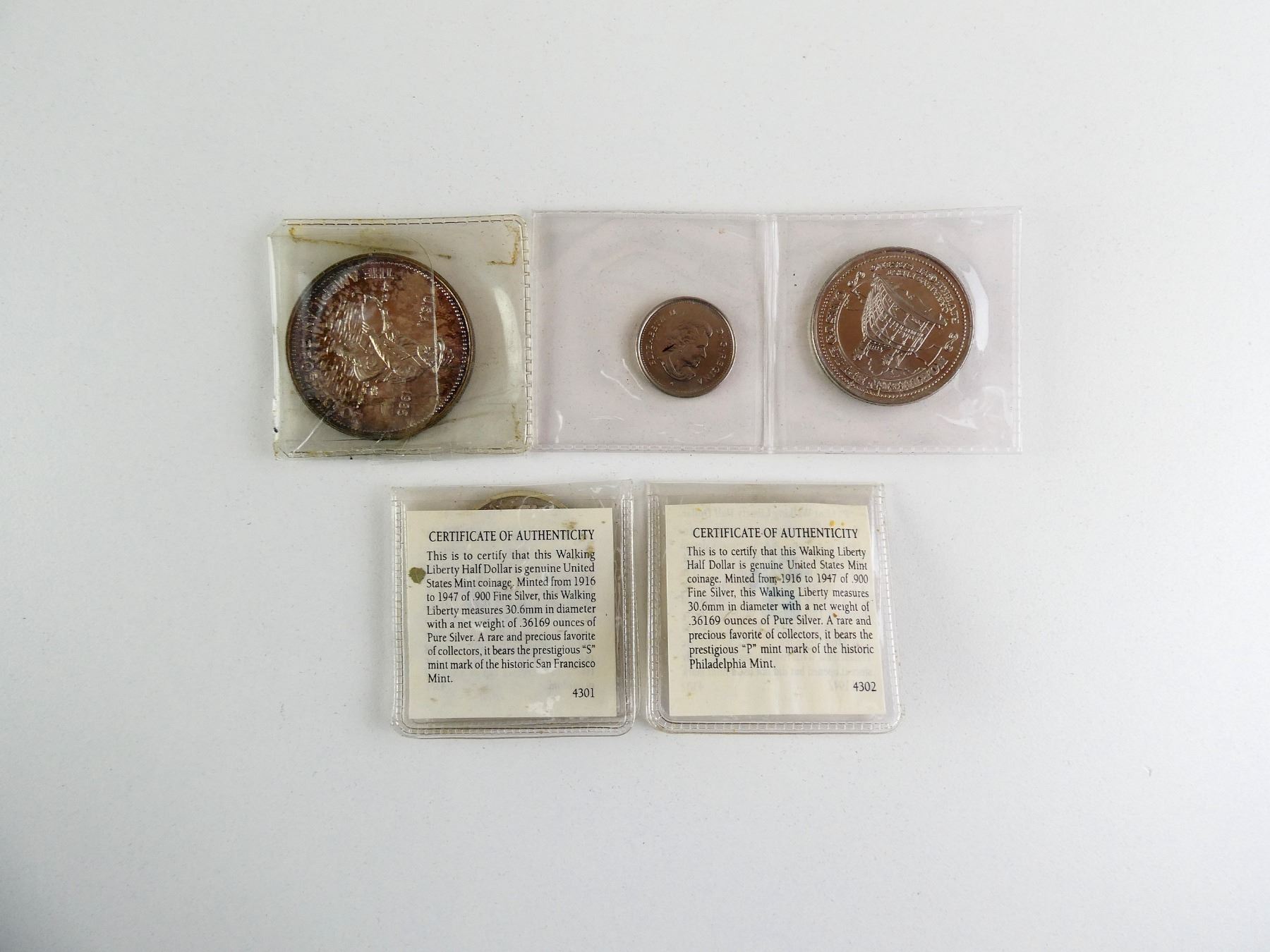 LOT INCLUDES; (1) CANADIAN VICTORY DIME DATED 1945 TO 2005, (1) CANADIAN TWO DOLLAR RIVERBOAT CASINO COIN, DATED 1995, (1) U.S. ENGELHARD 1 OZ SILVER THE AMERICAN PROSPECTOR COIN, DATED 1985 & (2) U.S. WALKING LIBERTY HALF DOLLARS, ONE DATED 1942 MINTED BY PHILADELPHIA, ONE DATED 1943 MINTED BY SAN FRANCISCO, BOTH WITH CERTIFICATE OF AUTHENTICITY. SEE PHOTOS.