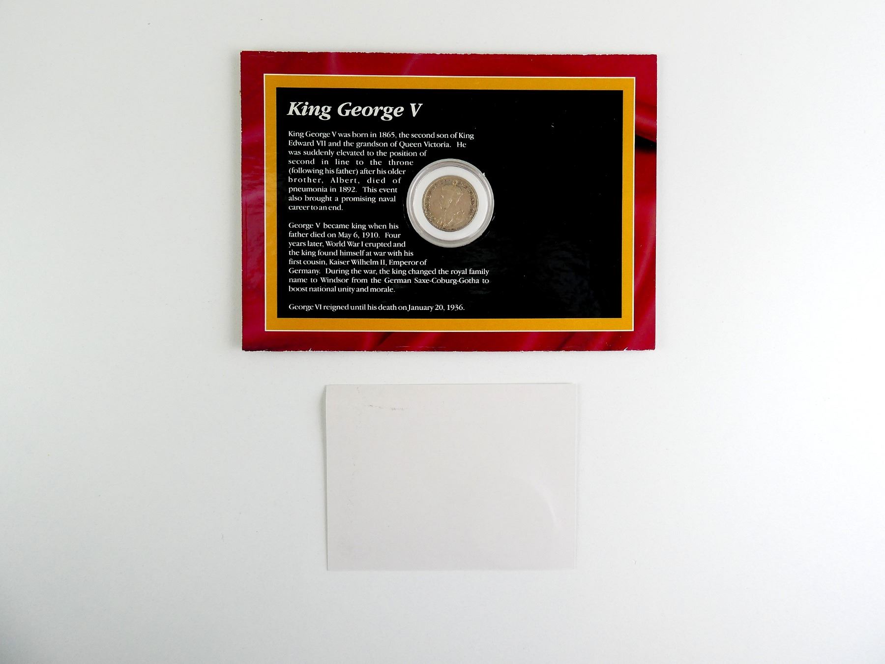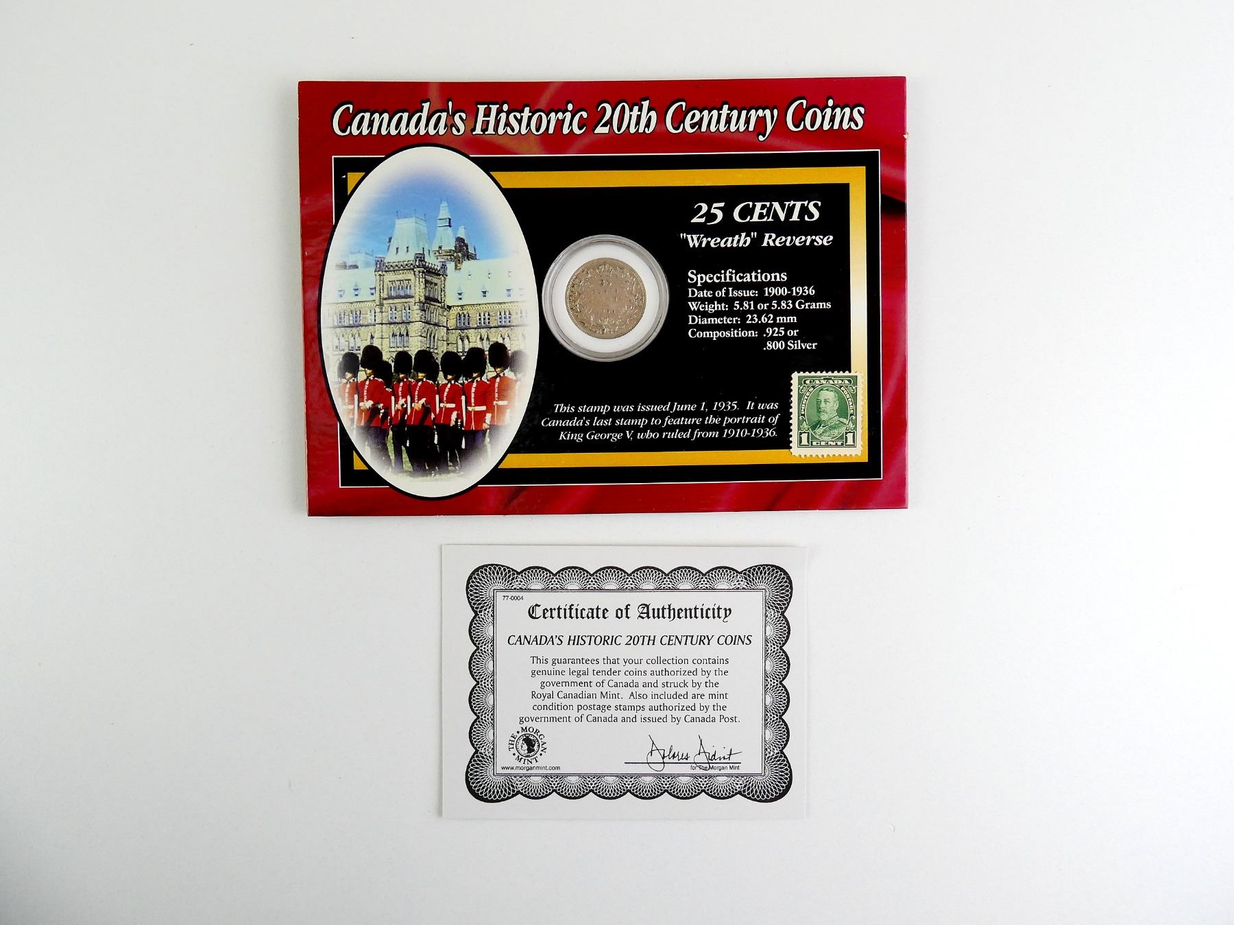 LOT INCLUDES; (1) 25 CENT COIN, DATED 1936 & (1) KING GEORGE V 1 CENT STAMP, ISSUED JUNE 1, 1935, ALL IN PROTECTIVE CASE WITH INFORMATION ABOUT COIN / STAMP / KING GEORGE V & CERTIFICATE OF AUTHENTICITY. SEE PHOTOS.