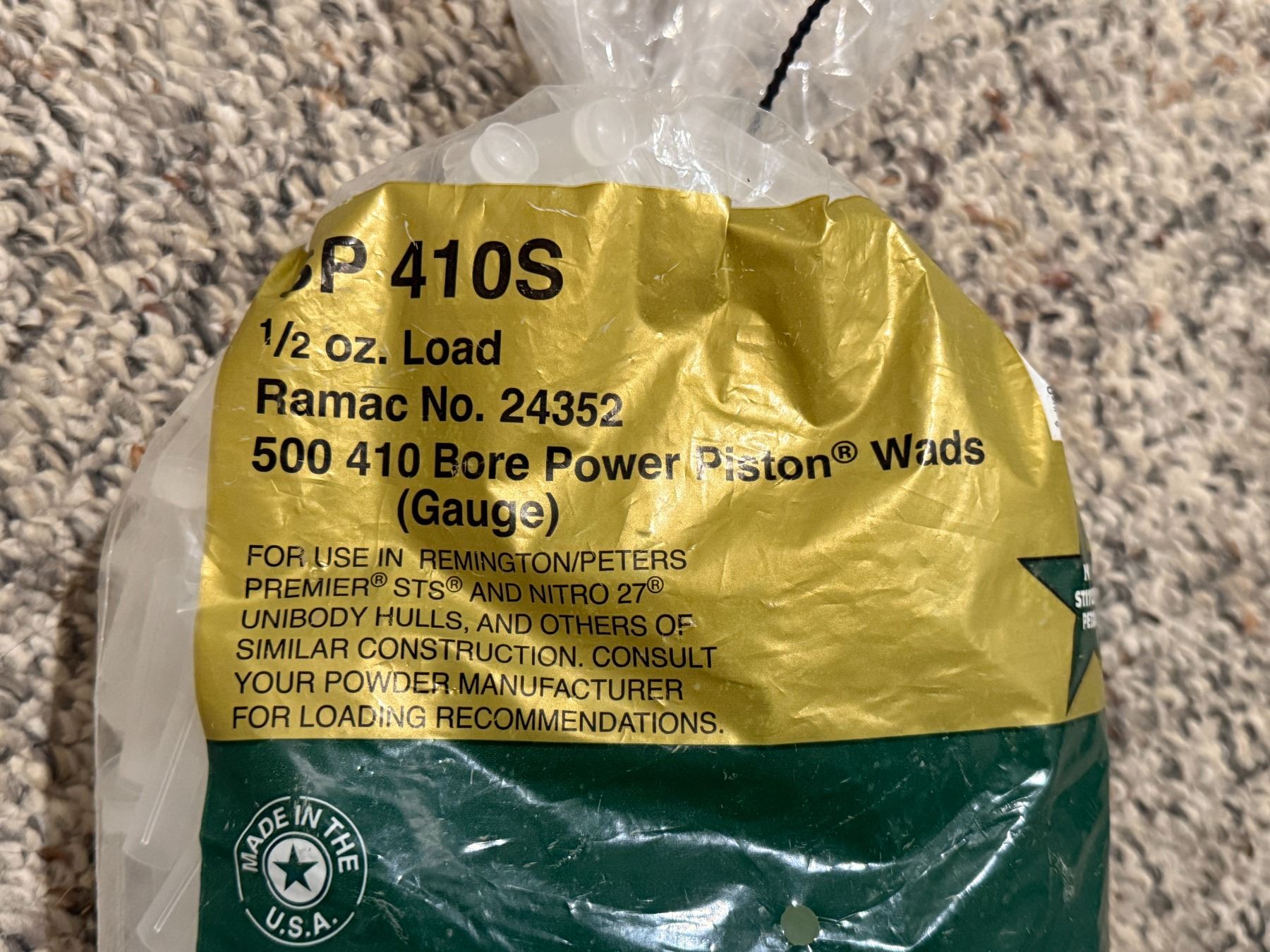 410 Bore Power Piston Wads Bag. Open bag as shown in photos.