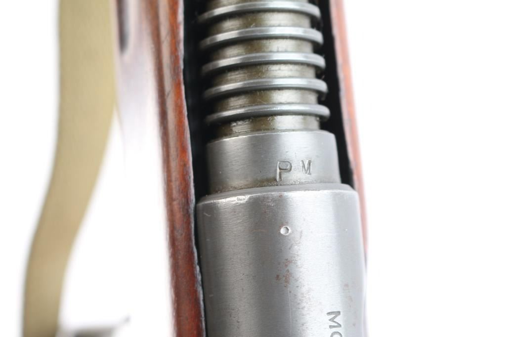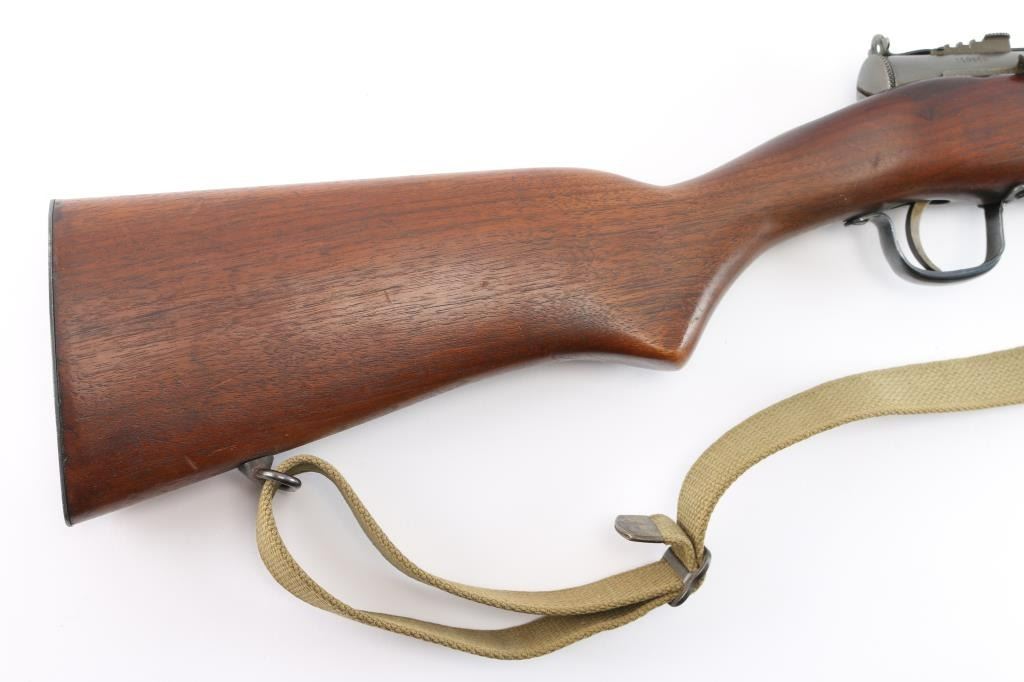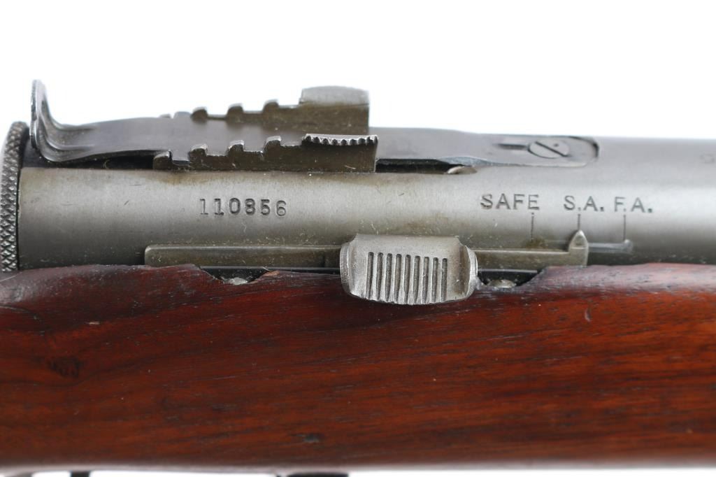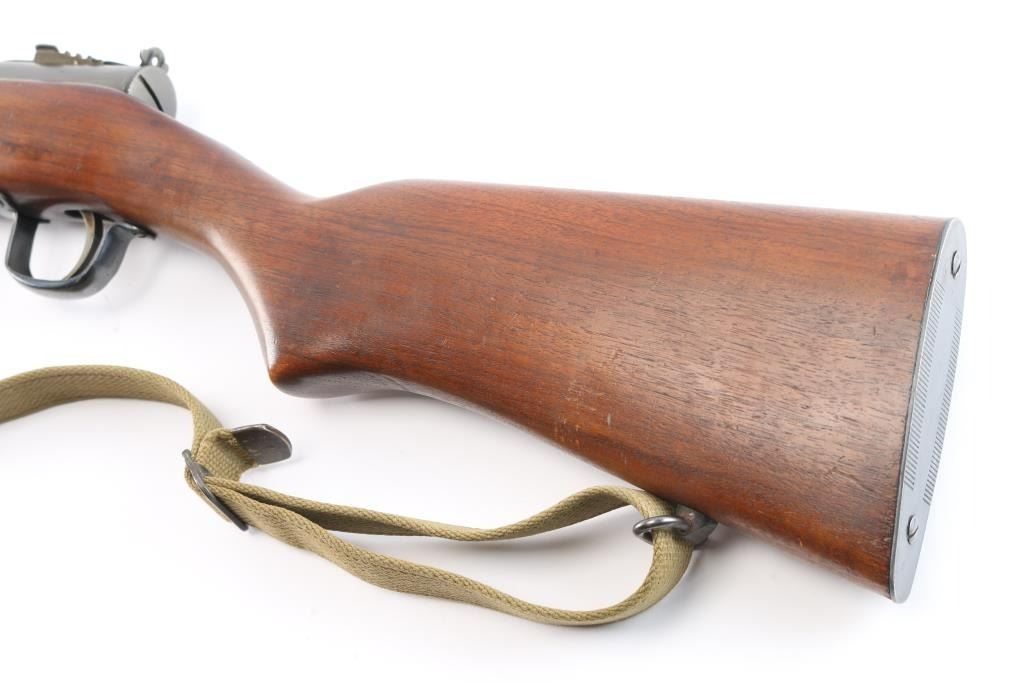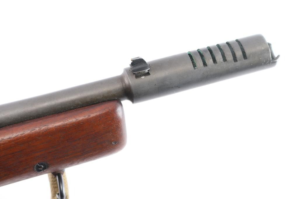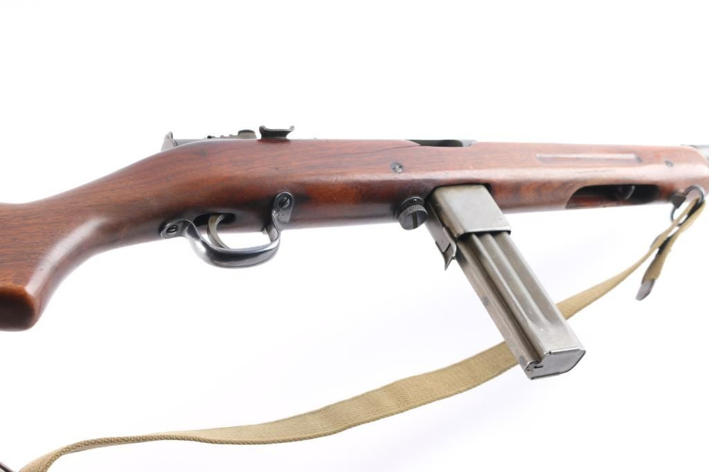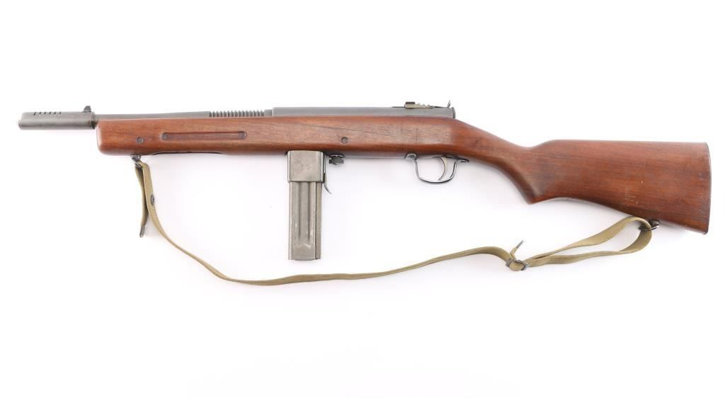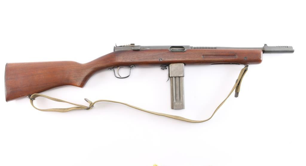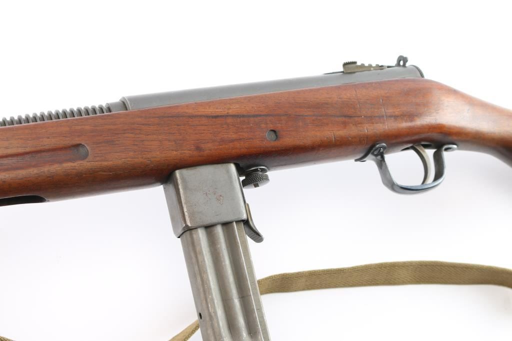 .45 Acp #110856.'Fully Transferable' WWII era U.S. Military contract closed bolt select fire submachine gun chambered in .45 Auto, manufactured circa 1941-1945. Over 100,000 Reisings were ordered during World War II, and were initially used by the United States Navy, Marine Corps, and the United States Coast Guard, though some were shipped to Canadian, Soviet, and other allied forces to fight the Axis powers. Features a parkerized finish, 10.8" barrel with 14 cooling fins, attached compensator, dovetailed blade/bead front sight, elevation adjustable aperture rear sight with retaining screw, operating rod placed inside the forearm, serrated trigger, three screw trigger guard, three-position selector with outward flanges, knurled take-down screw, two-piece magazine release, factory 20 round parkerized magazine, sling swivels and smooth one piece walnut pistol grip with ties through the forend. grasping grooves & partially serrated metal buttplate. SMG exhibits approximately 80% of it's thinned parkerized finish showing scattered brown tones, a few scattered scratches and some handling wear. Action is sound, the bore is excellent/bright and the wood stock is good with minor scratches & a 4" crack on the right side of the stock behind the ejection port. USGI green web sling attached. NOTE* There are four ken Christie 30 rd .45 ACP. stick magazines up for bid in this auction.