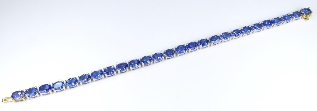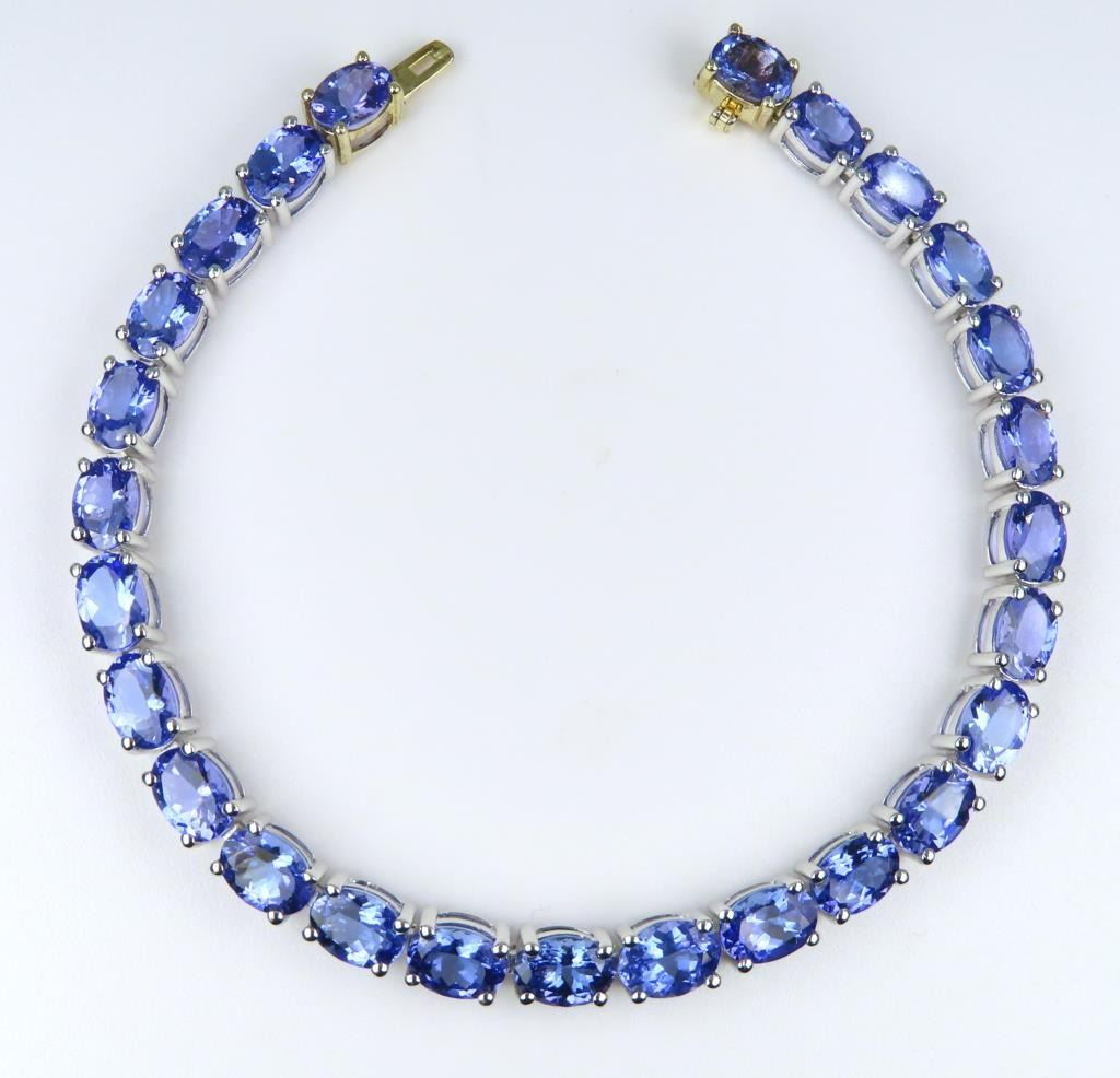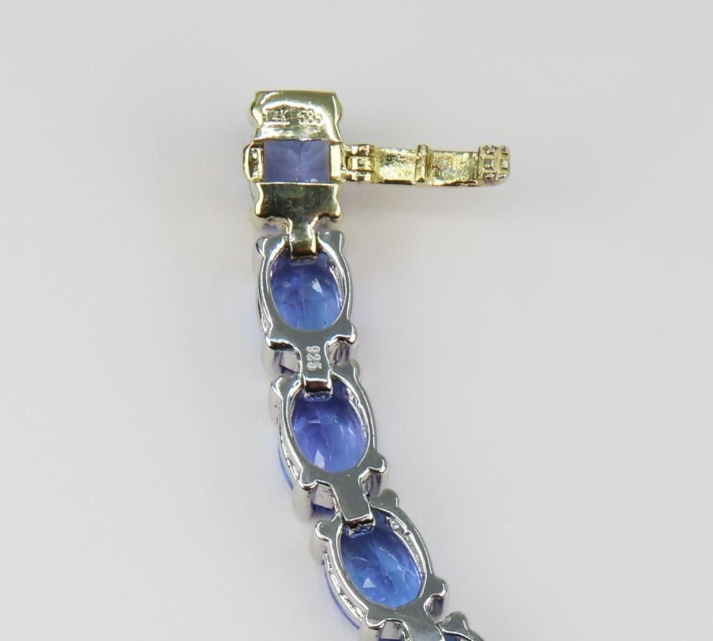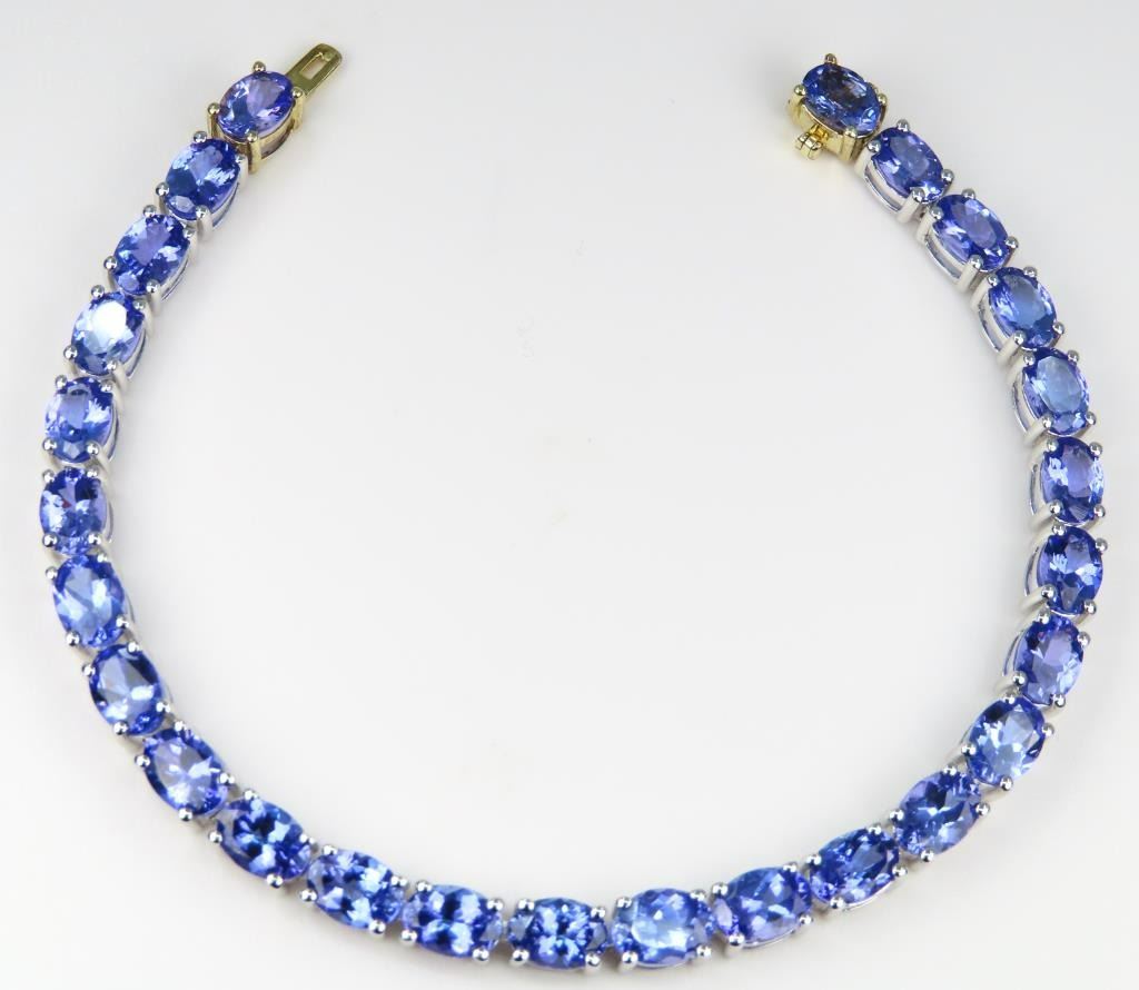 Featuring 26 oval cut Extra vivid, Purplish/Blue Tanzanites weighing approx. 22.00-25.00 carats set in 14 karat yellow gold (stamped) and sterling silver setting. Retail $8,000-$9,000.