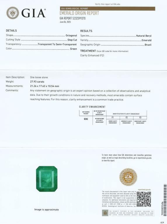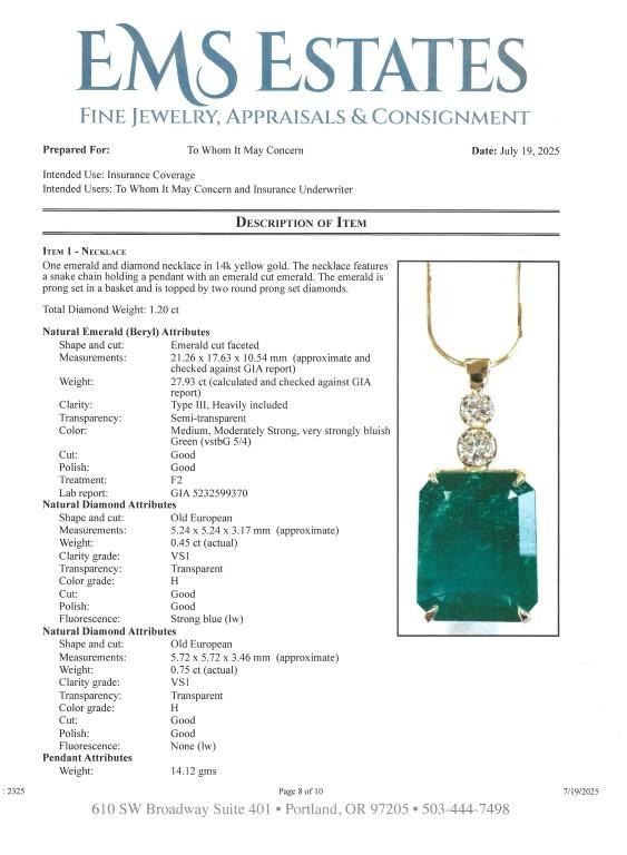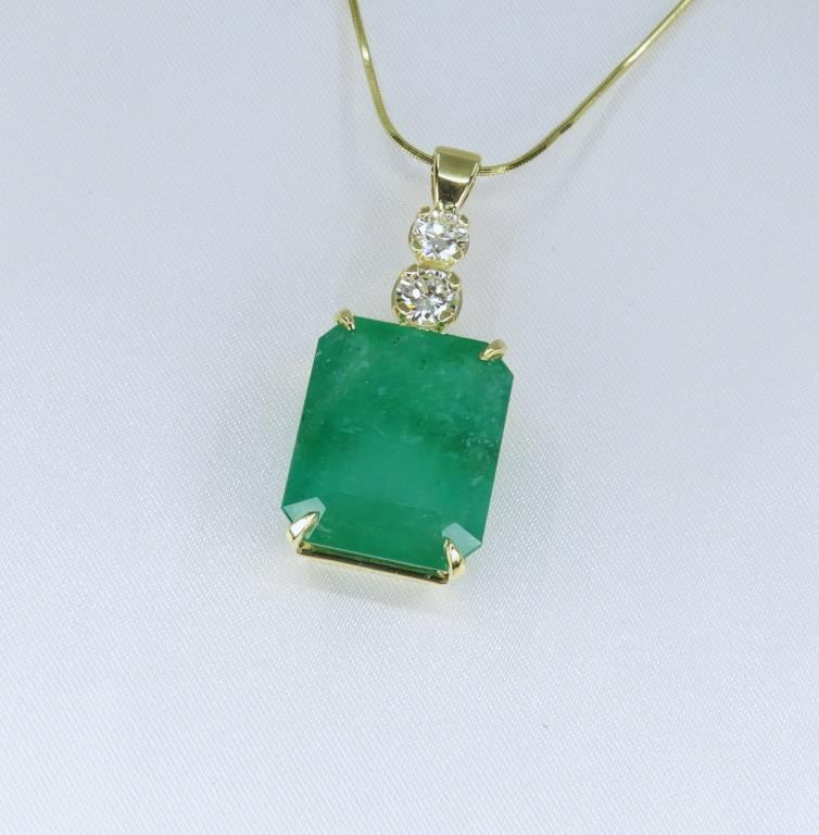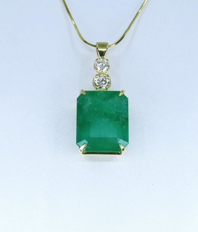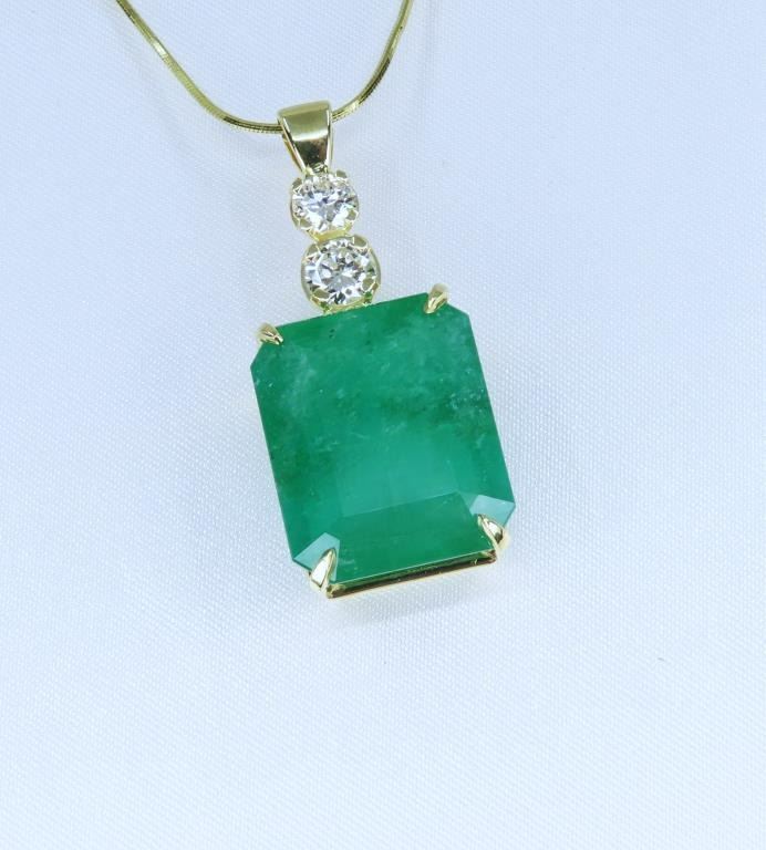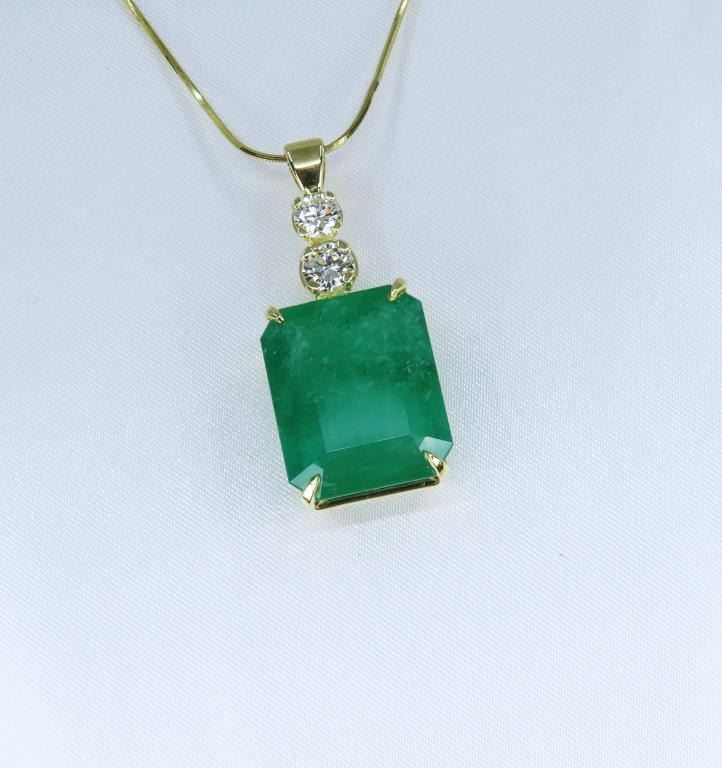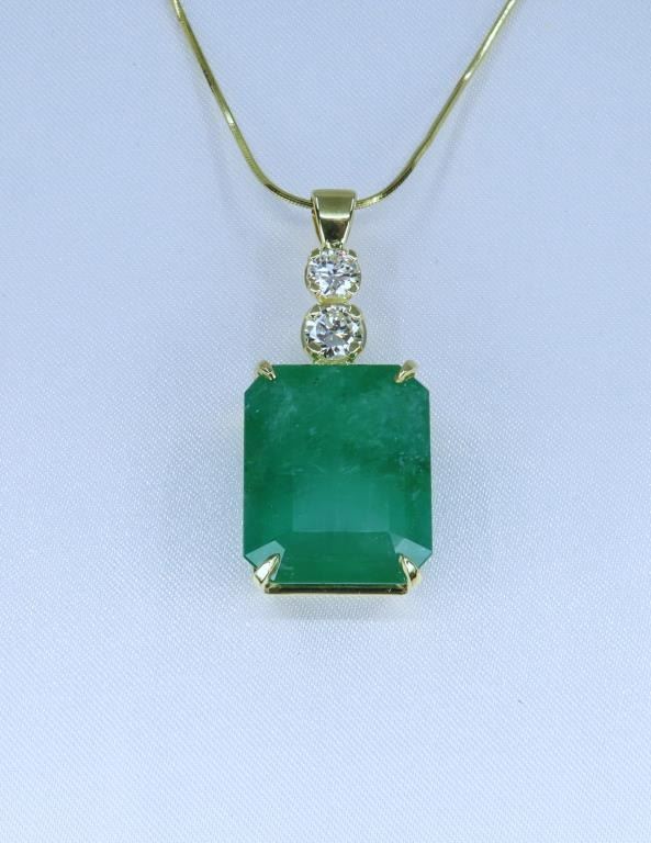 Spectacular Statement Piece - Huge 27.93 carat G.I.A. Certified Natural Emerald and Diamond Pendant featuring a rectangular cut Brazilian Emerald with rich Blue Green color. The Emerald is brilliantly accented with 2 round cut Diamonds weighing 1.15 carats with H-I colors and VS clarity set in a fine, custom crafted 14 karat yellow gold designer setting. Fine Luxury Jewelry Collection. Full Retail Appraisal - $92,500.00.