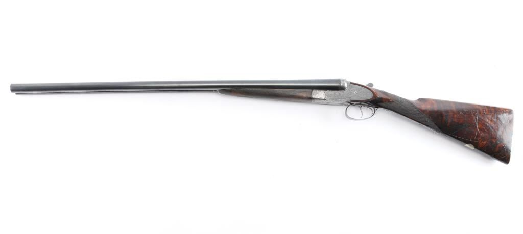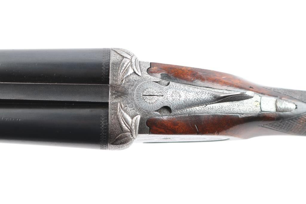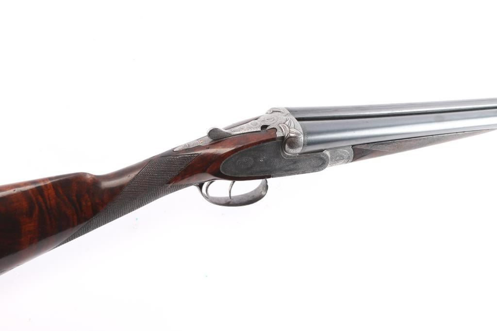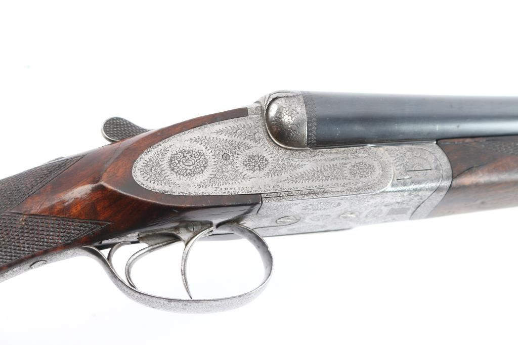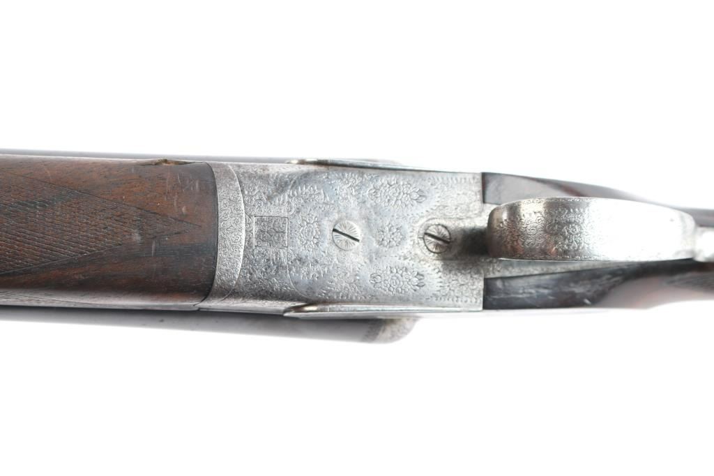 Vintage high quality Lebeau-Courally SxS sideplate ejector shotgun. Belgian firearms manufacturer with a long history in the production of high-quality shotguns and rifles. The company was founded by Auguste Lebeau in 1865 and later merged with the Courally family in 1885. 27-3/4’’ chopper lump barrels, concave solid rib, brass bead. Right barrel marked "Aug. Lebeau-Courally A Liege", left marked "Fabt Des Coups De Russell D'Espagne & D-Italie ” Bottom of bbls. are marked “ACIER COMPRIME/DE WAHLREYNE”, with Belgium proofs including "C" over 12 in diamond which dates the gun t0 1898-1924. Both locks marked "Fabricant A liege". The safety "S" is gold inlay, coin finished receiver has extensive coverage of English rose & scroll engraving that extends to forearm iron with borders at breech end of barrels, high relief acanthus leaves engraved on the bolsters. Features include double under lug and third bite locking, selective ejectors & double triggers with articulated front trigger. Splinter forearm with Anson release and straight hand stock of exhibition quality European walnut have burl figure with contrasting dark and orange tones. Stock and forearm have generous coverage of point pattern hand checkering. Toeline of stock has brass nameplate. all matching serial numbers Bores are very good/bright, receiver is very good, barrels lock-up tight, barrel blue is about 95% with minor scratches/scuffs, slight muzzle wear and the wood is overall good with wear to the forearm checkering, many scratches and a circular crack in the heel of the buttstock. stock measurements-Lop-14" to front trigger, Dac-1 1/2" and Dah-2 1/2".
