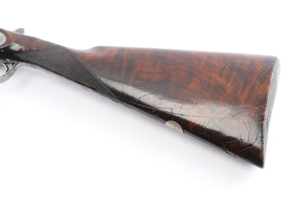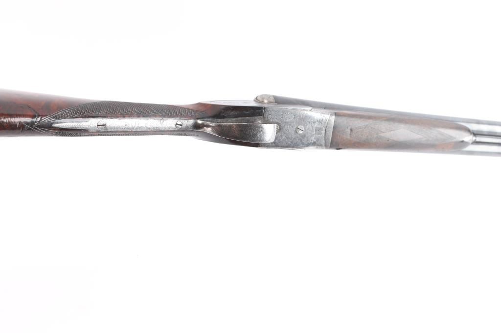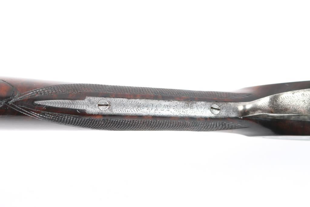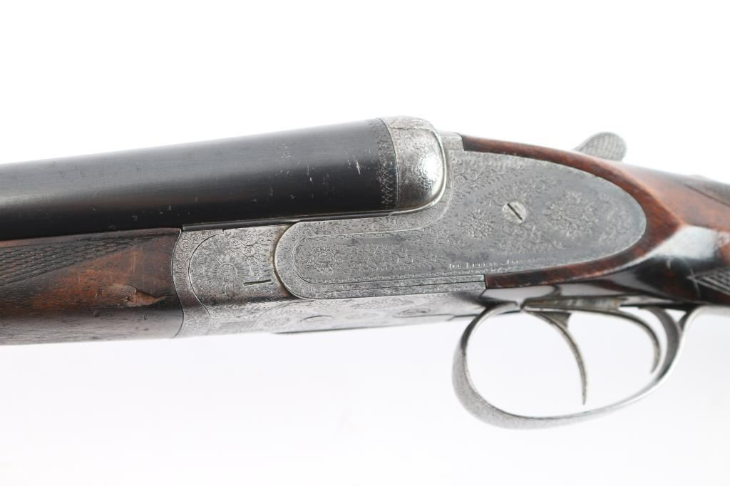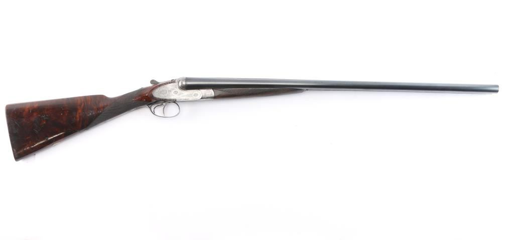 Vintage high quality Lebeau-Courally SxS sideplate ejector shotgun. Belgian firearms manufacturer with a long history in the production of high-quality shotguns and rifles. The company was founded by Auguste Lebeau in 1865 and later merged with the Courally family in 1885. 27-3/4’’ chopper lump barrels, concave solid rib, brass bead. Right barrel marked "Aug. Lebeau-Courally A Liege", left marked "Fabt Des Coups De Russell D'Espagne & D-Italie ” Bottom of bbls. are marked “ACIER COMPRIME/DE WAHLREYNE”, with Belgium proofs including "C" over 12 in diamond which dates the gun t0 1898-1924. Both locks marked "Fabricant A liege". The safety "S" is gold inlay, coin finished receiver has extensive coverage of English rose & scroll engraving that extends to forearm iron with borders at breech end of barrels, high relief acanthus leaves engraved on the bolsters. Features include double under lug and third bite locking, selective ejectors & double triggers with articulated front trigger. Splinter forearm with Anson release and straight hand stock of exhibition quality European walnut have burl figure with contrasting dark and orange tones. Stock and forearm have generous coverage of point pattern hand checkering. Toeline of stock has brass nameplate. all matching serial numbers Bores are very good/bright, receiver is very good, barrels lock-up tight, barrel blue is about 95% with minor scratches/scuffs, slight muzzle wear and the wood is overall good with wear to the forearm checkering, many scratches and a circular crack in the heel of the buttstock. stock measurements-Lop-14" to front trigger, Dac-1 1/2" and Dah-2 1/2".