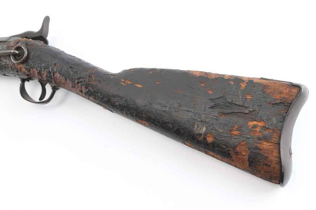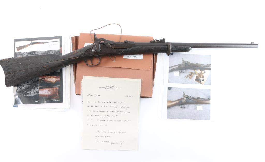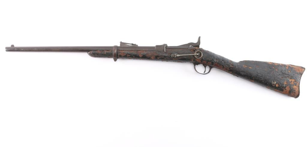 Prime Custer range 1873 Springfield .45-70 carbine. This number is between 39253 and 39448. 39253 is listed as recovered at Slim Butte and 39448 is listed by Dumont in his book as "Direct Association". This carbine shows a dark, uncleaned brown patina with very light lock marking discernable, good U.S. on breech block, and readable serial number as listed. The stock is broken, cracked and has many losses of wood to use, exposure, and exposure to "campfires". The swivel on band removed otherwise complete. Lock works and bore rough but shootable. John Kopec collection. Kept by Kopec to his death as he felt as did his close friend, Sterling Fenn, that this carbine "was there and probably Indian captured". Large folder of research by Kopec and Fenn.