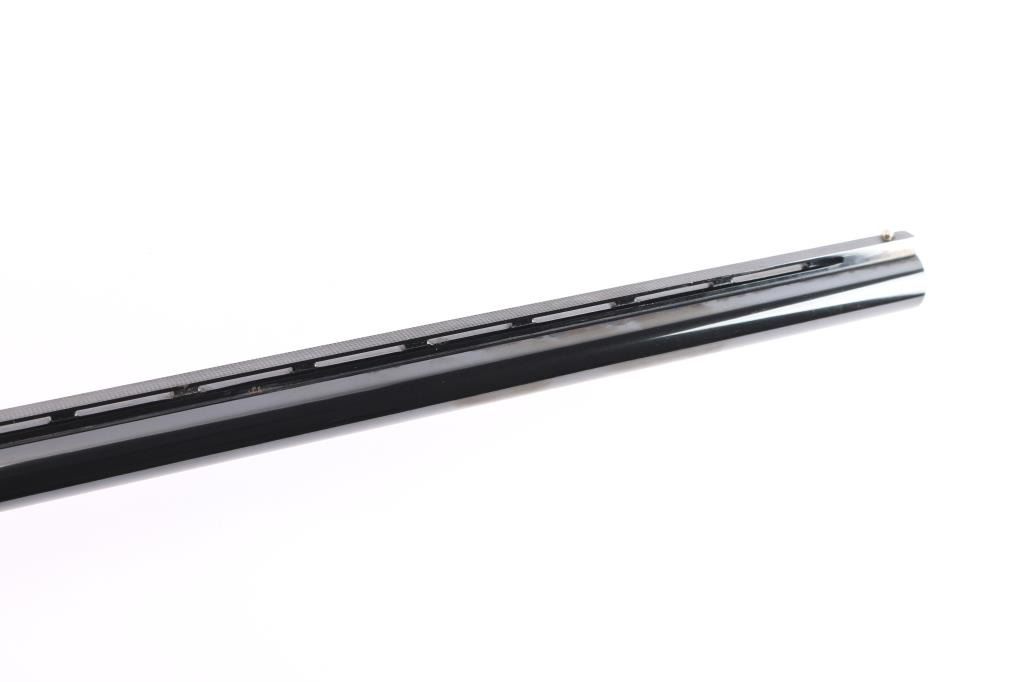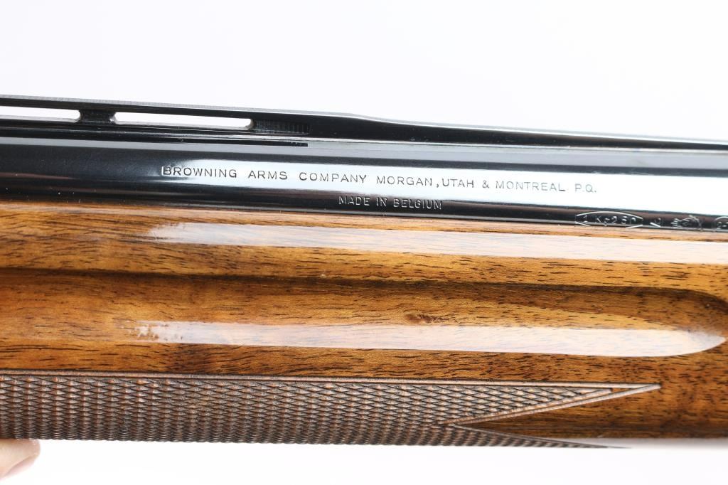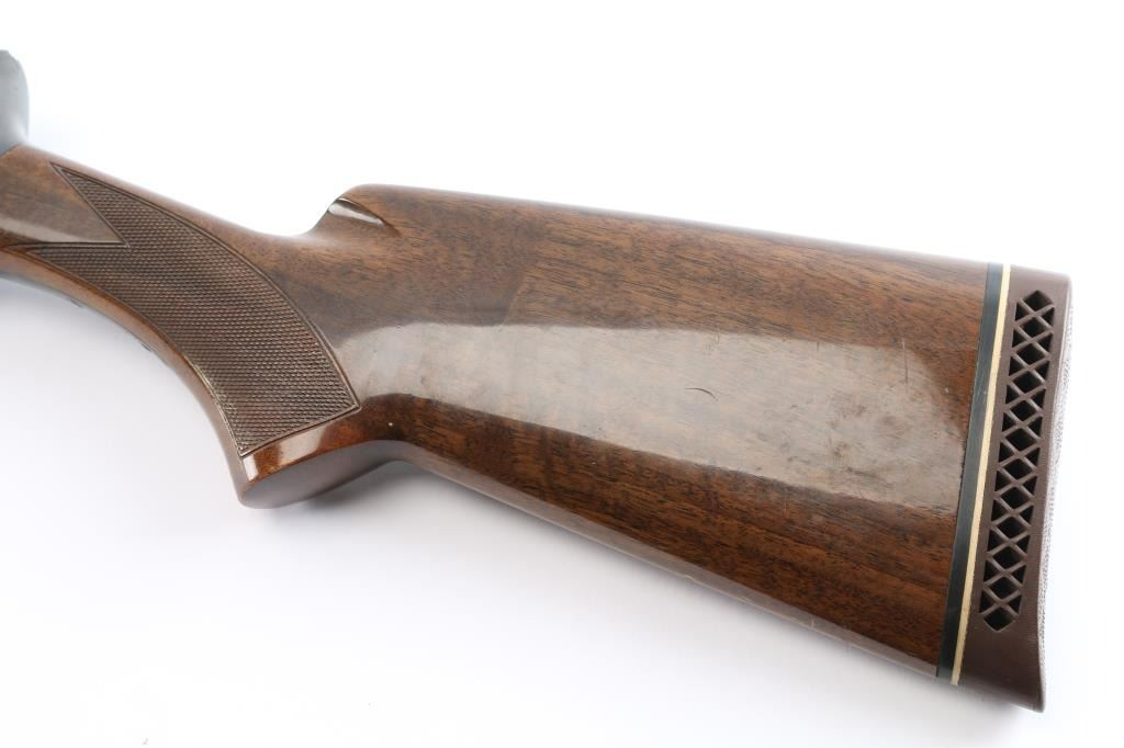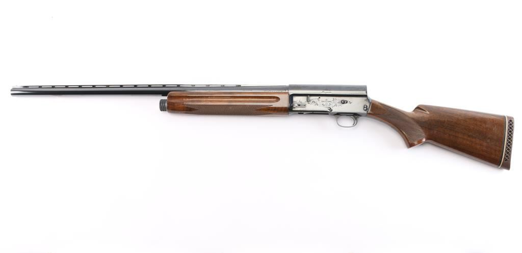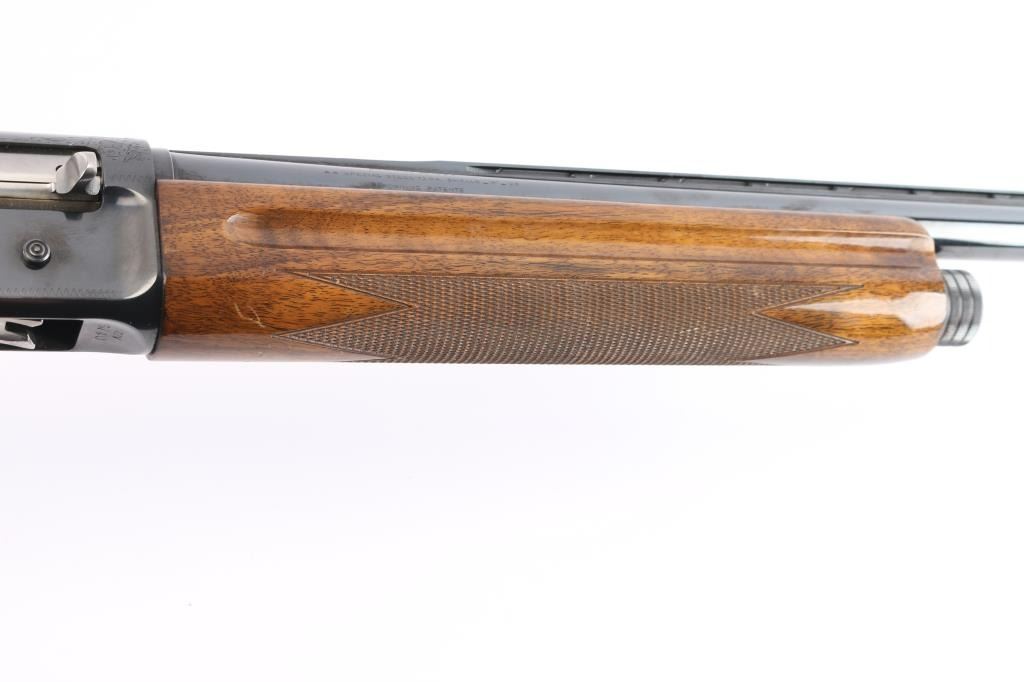 Belgium made by FN for Browning. A5, 12 gauge Magnum, circa 1972. It has a blued 27 1/2" vent rib barrel, steel sighting bead, accepts 3" shells, magazine cut-off, push button safety, floral engraved receiver The original blue finish is about 98% showing showing some minor scratches. The wood stocks are checkered at the wrist and forend which also sports grasping grooves, curved grip. Wood is in very good shape with some signs of use and handling and It has a Browning recoil pad. Bore is excellent/bright, action is smooth. LOP is 14 1/4". Choke measures IM.