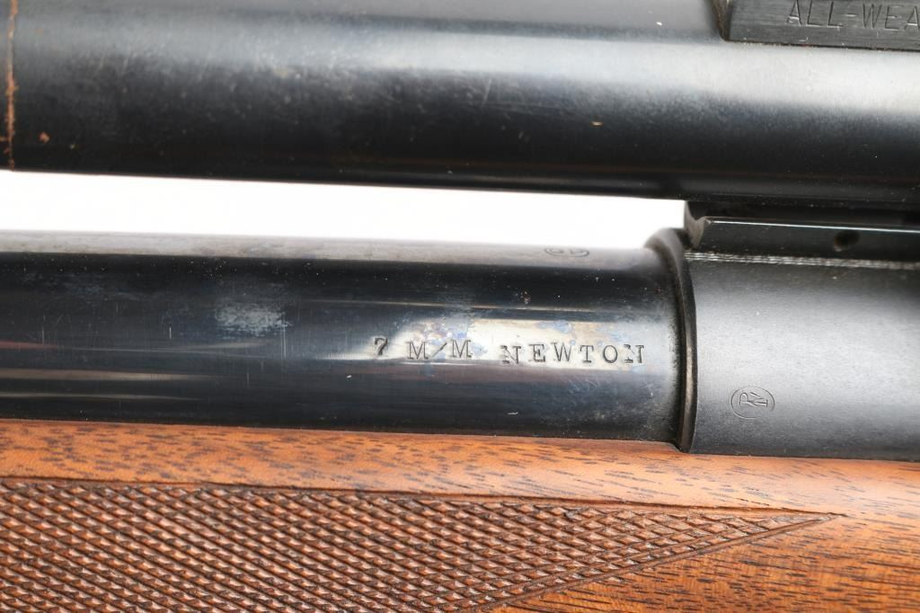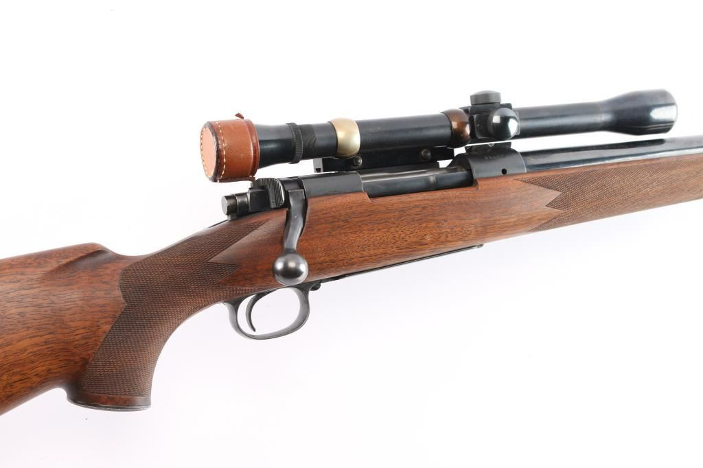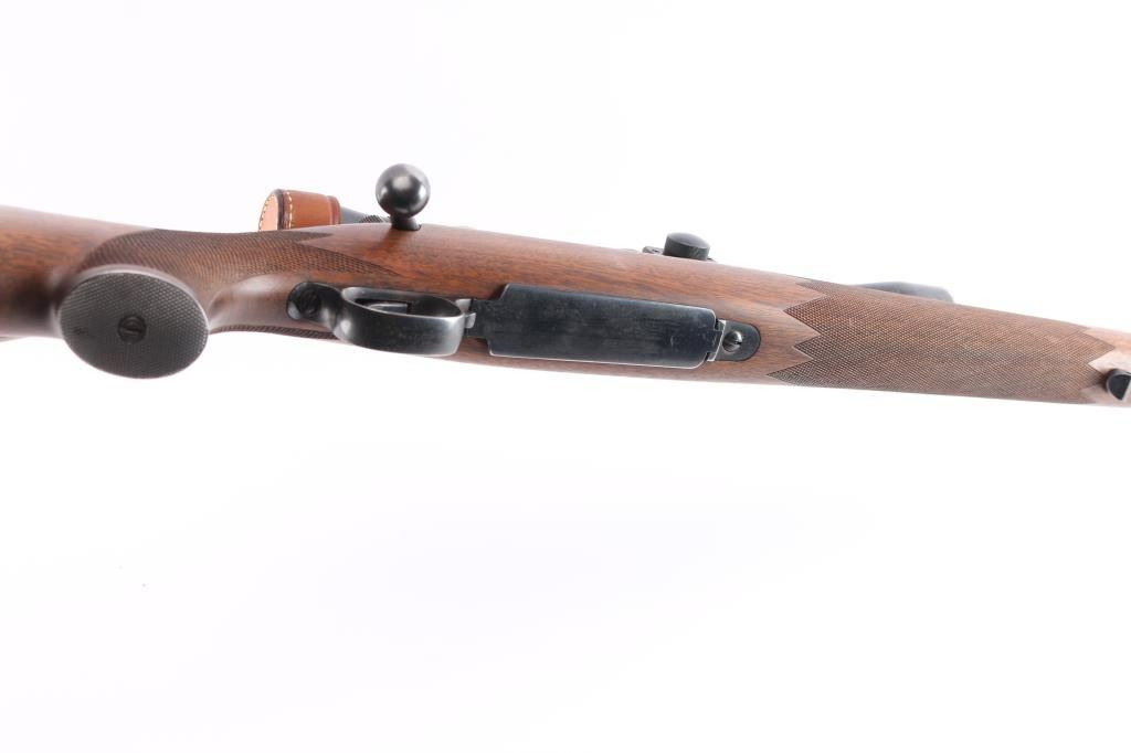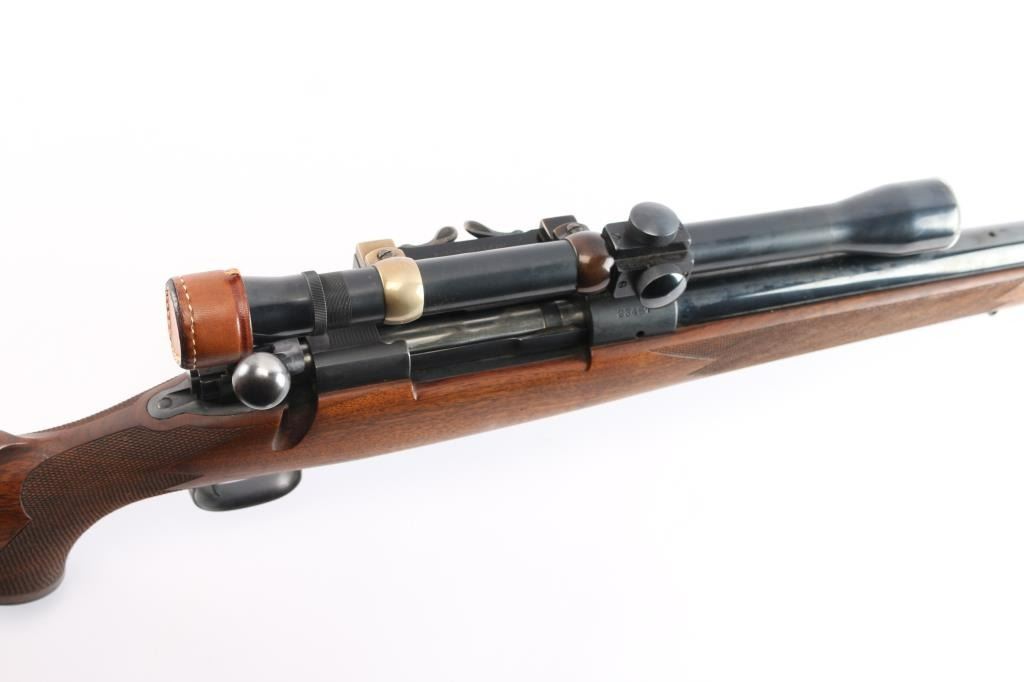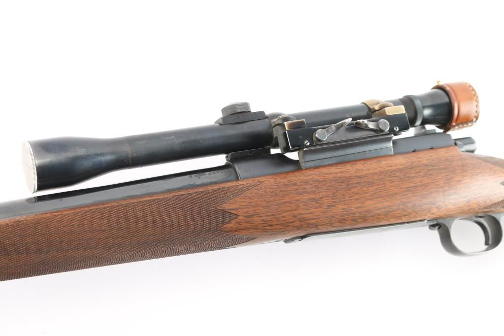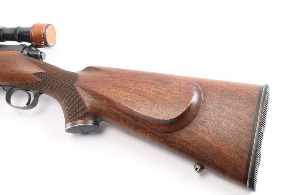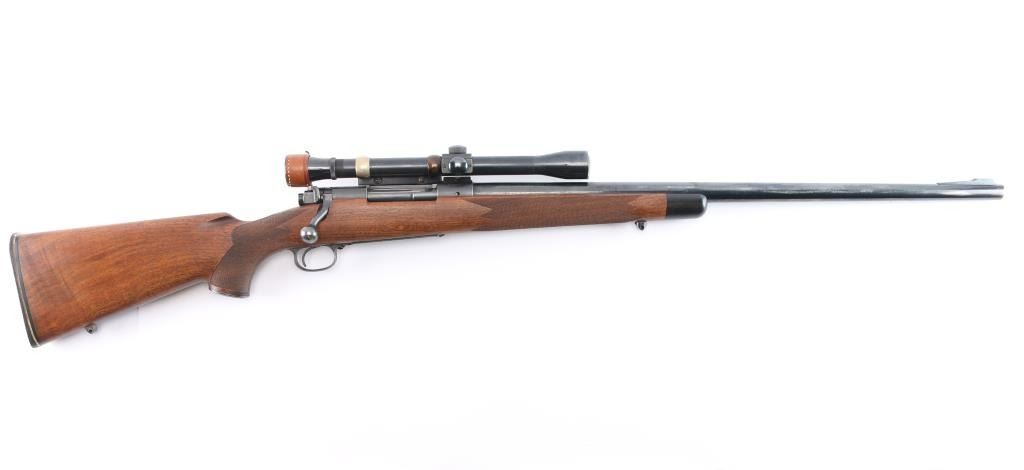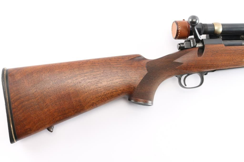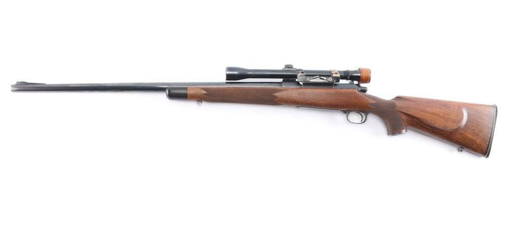 rifle circa 1939. Features custom 27" medium-heavy barrel, Lyman Alaskan 2.5x scope with fine crosshairs, three position safety, hinged floorplate. Custom walnut stock features fine checkering at wrist & forend, ebony tip, right hand cheekpiece with shadow line, checkered steel grip cap, recoil pad, sling studs. Bore is bright overall, some darkness in grooves. Retains 85% finish with some discoloration and other losses on barrel, thinning and scratches on bottom metal. Stock is near excellent with few blemishes. Recoil pad needs replaced.