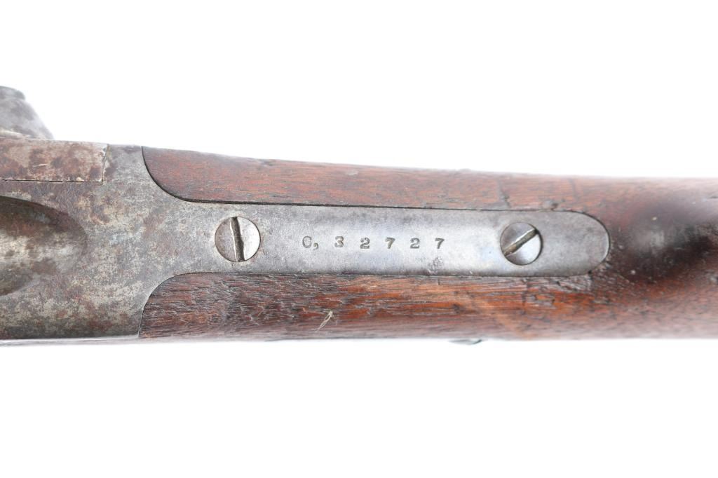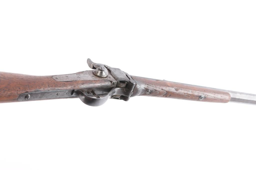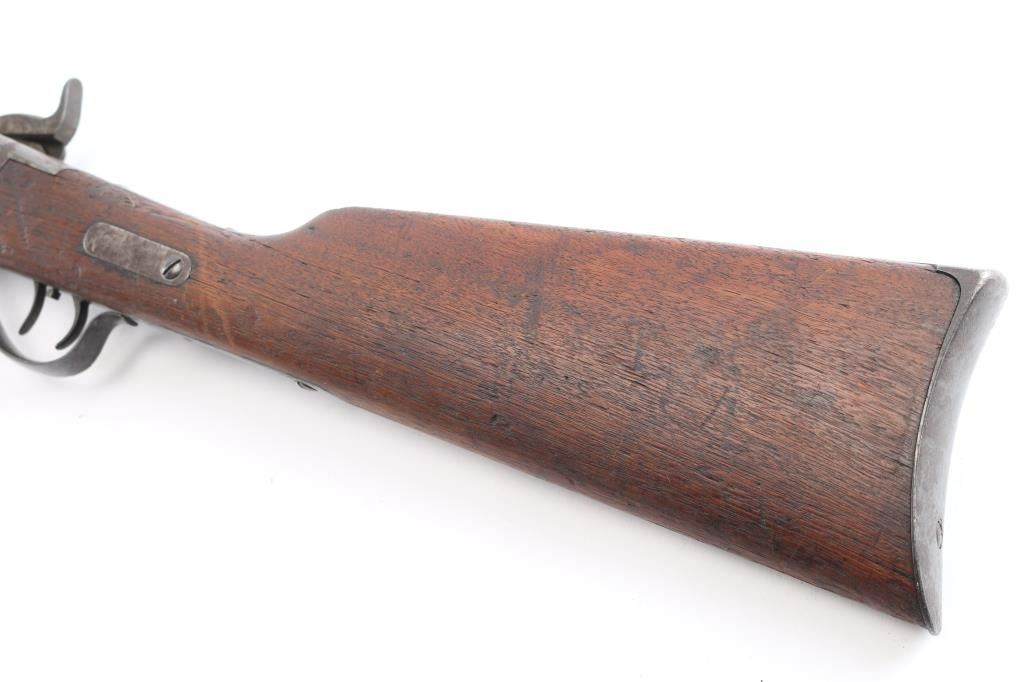 "Meachum" conversion of Sharps carbine, serial #C32727, action to 45 2/10 cal (.45-70). BBL is old reliable marked and period shortened to 22" and of heavier than standard weight. Double-set triggers. Standard Sharps rear ladder sight and Western made fine post front sight. Bright and very good bore. Triggers work. And good overall with many losses to forearm of wood along edges. The bbl is numbered 32727, the original number of carbine, and 160155, also 15676 along with a #16 by the forward forend screw (weight of bbl)? These numbers may be researchable through Sharps Research Service as to extra bbls or guns returned and re-sold by Sharps to dealers. James Wells "Buffalo Hunt" Collection.