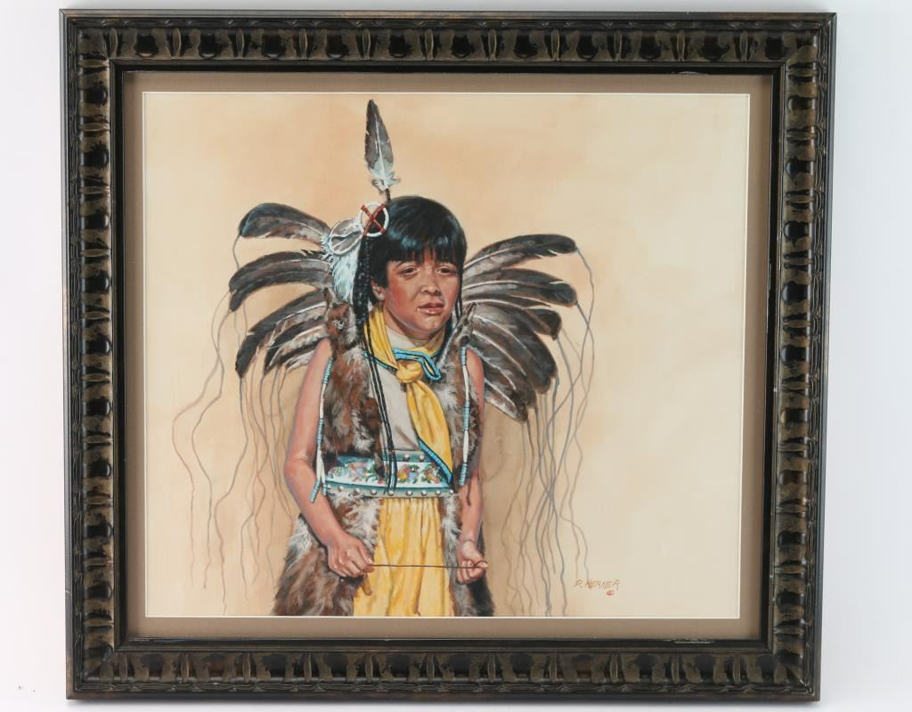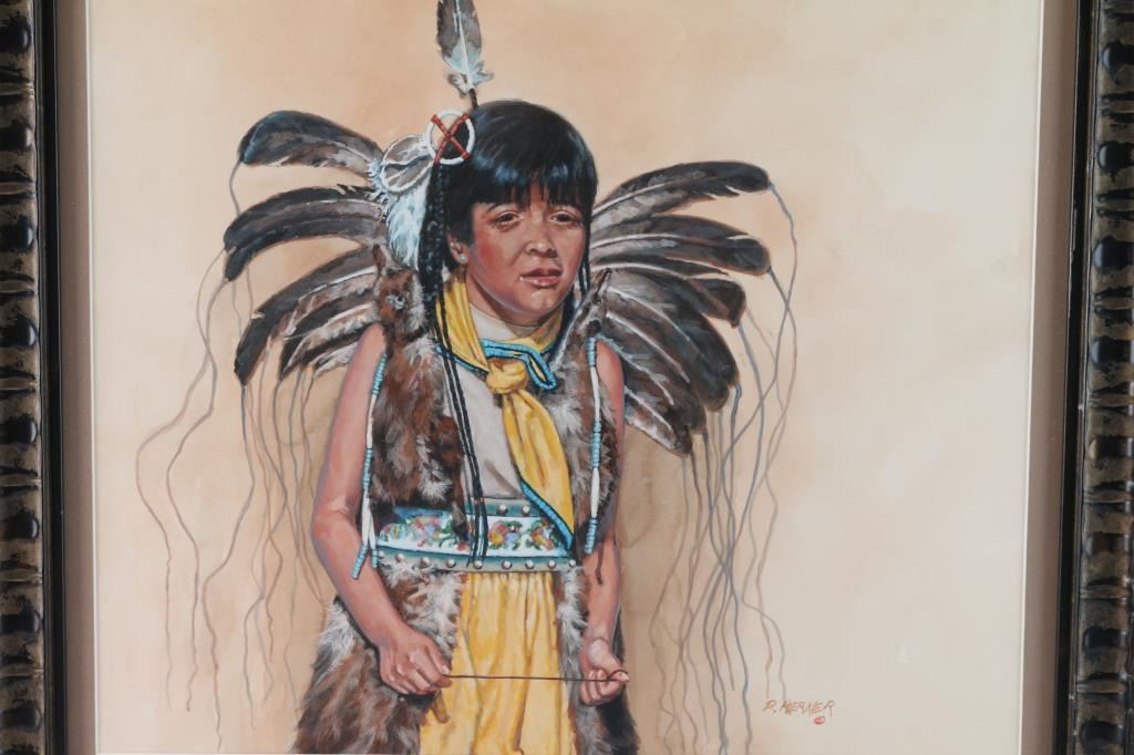Entitled "Feather Dancer". Signed lower right corner with copyright mark. Matted and framed measures 19" x 21".