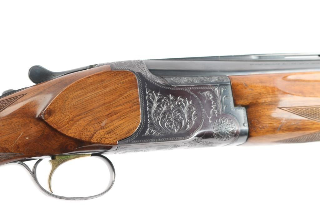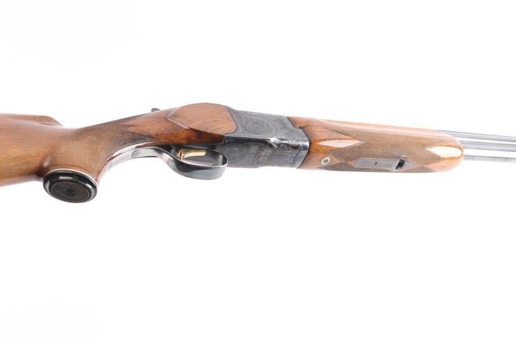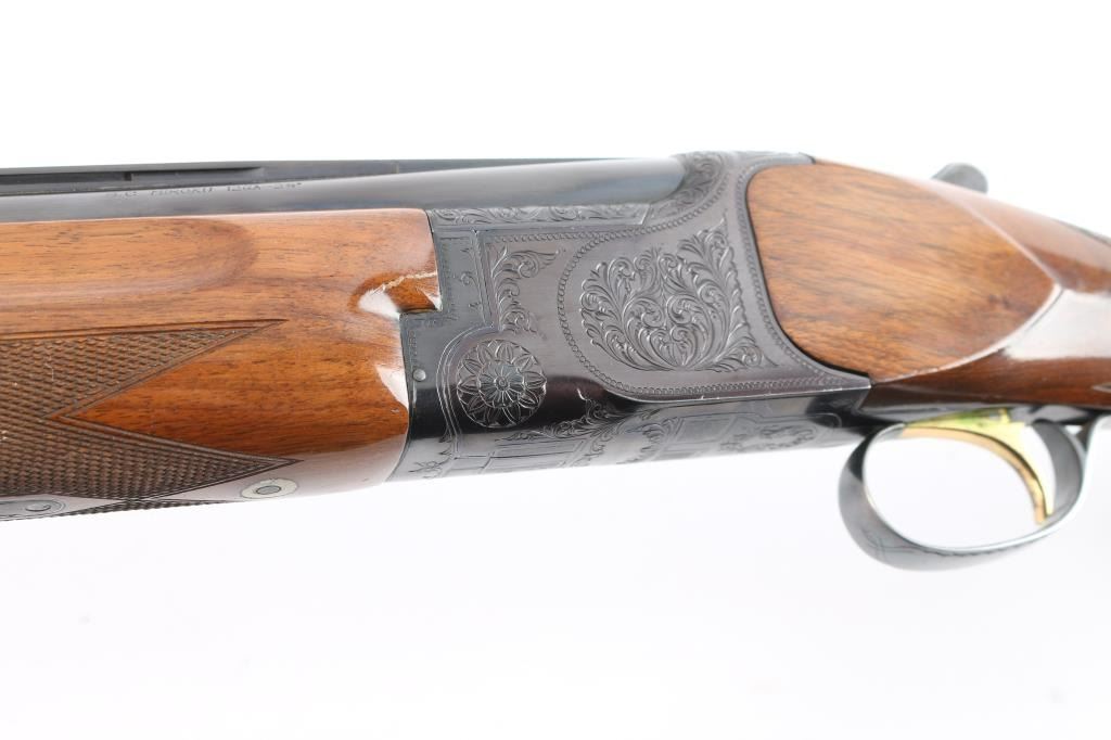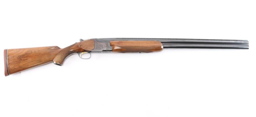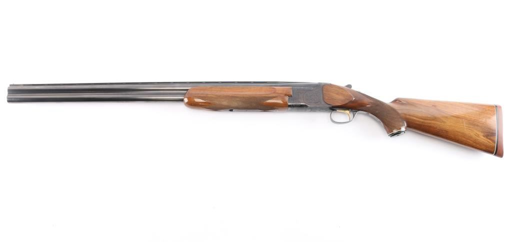 Quality Japanese made over under shotgun with 28" vent rib barrels, steel bead with smaller mid bead. Blued finish, scroll engraved receiver, high gloss checkered Monte Carlo style walnut stock and forearm, single select gold toned trigger, sliding tang safety/selector, factory buttplate, steel grip cap. Choke markings indicate Full / Modified. LOP is 14 3/4". Bores are excellent/bright, blue is about 98% with minor scratches & wood is very good/sound with minor scratches/dings, barrels lock-up tight.