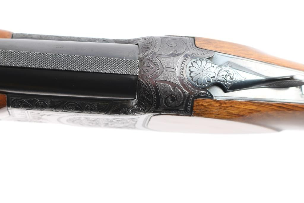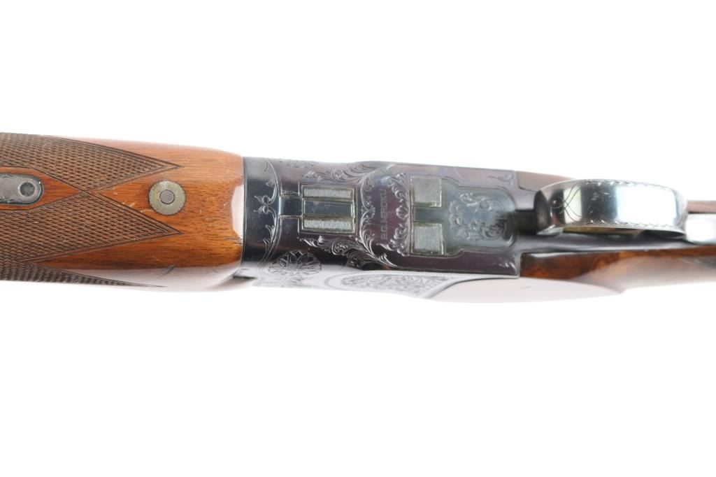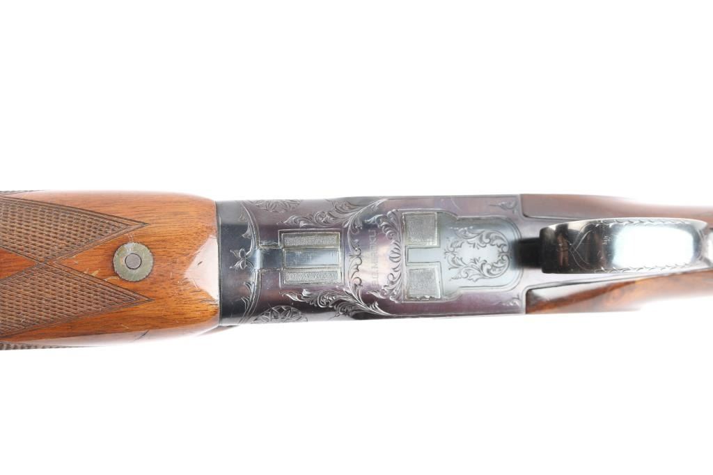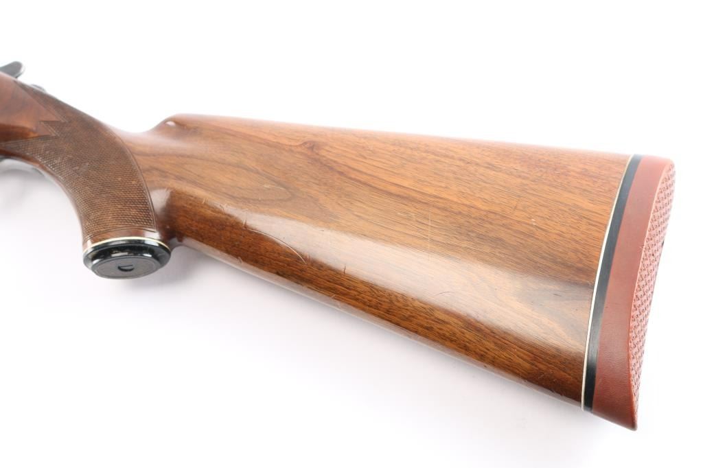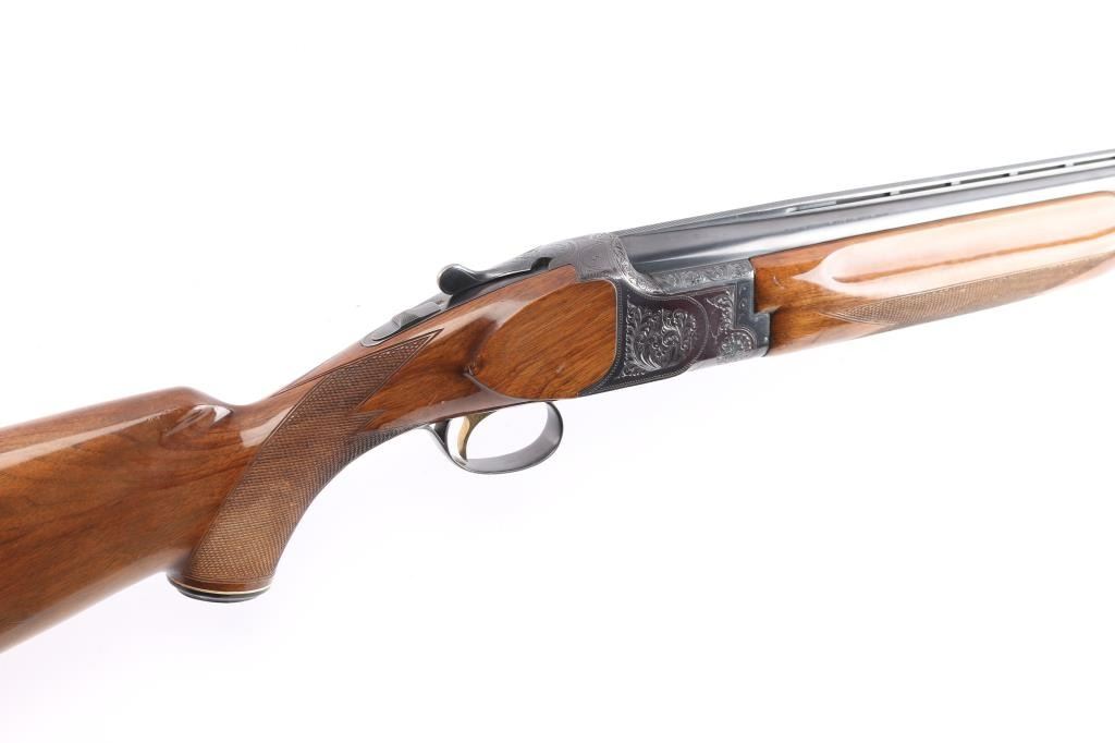 Quality Japanese made over under shotgun with 28" vent rib barrels, steel bead with smaller mid bead. Blued finish, scroll engraved receiver, high gloss checkered Monte Carlo style walnut stock and forearm, single select gold toned trigger, sliding tang safety/selector, factory buttplate, steel grip cap. Choke markings indicate Full / Modified. LOP is 14 3/4". Bores are excellent/bright, blue is about 98% with minor scratches & wood is very good/sound with minor scratches/dings, barrels lock-up tight.