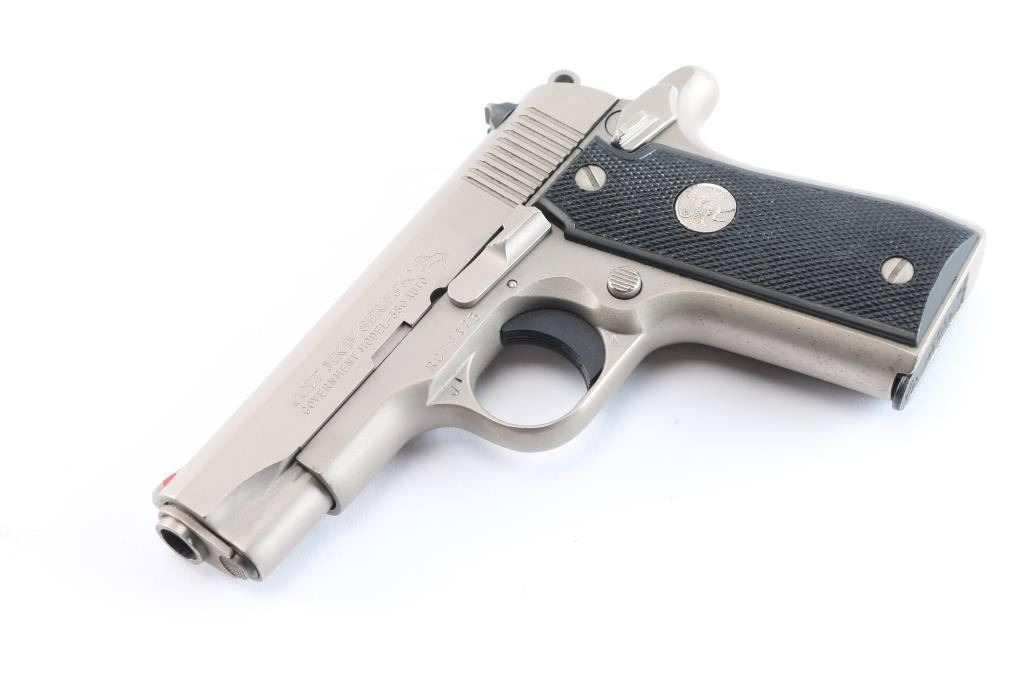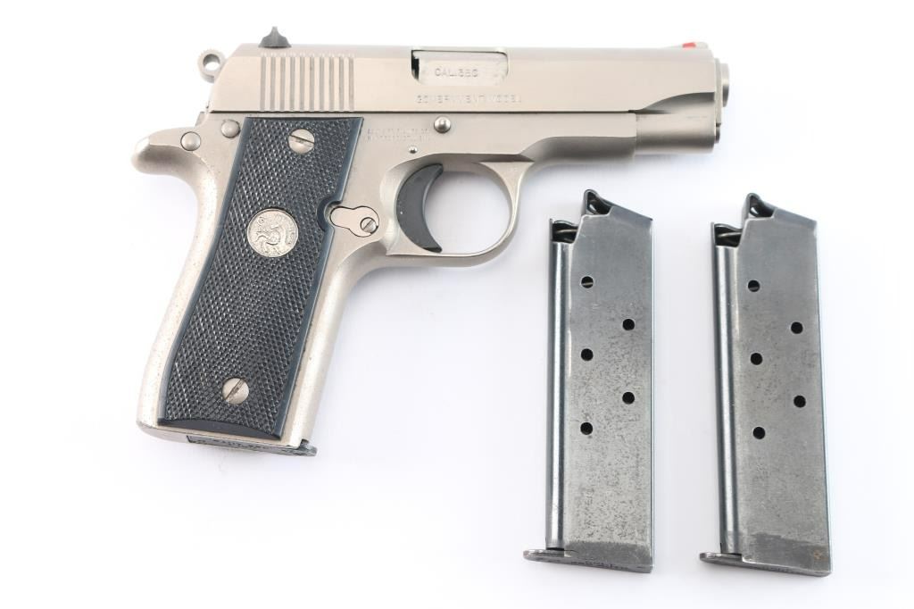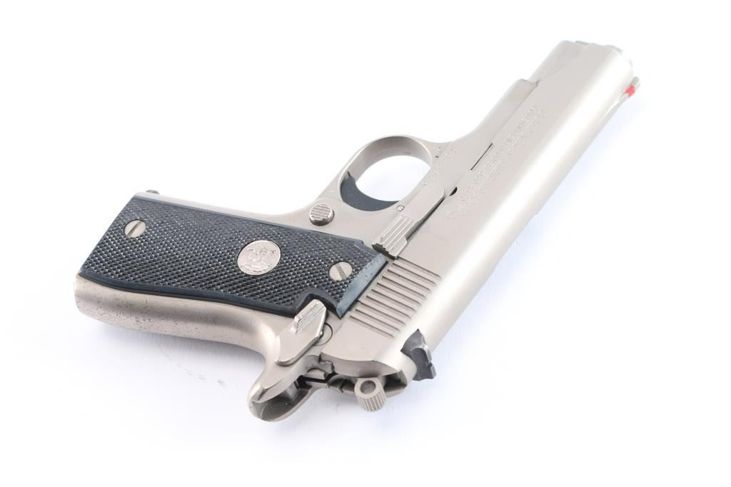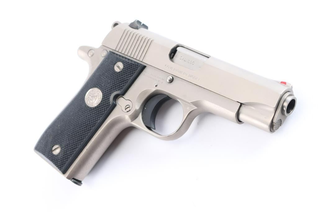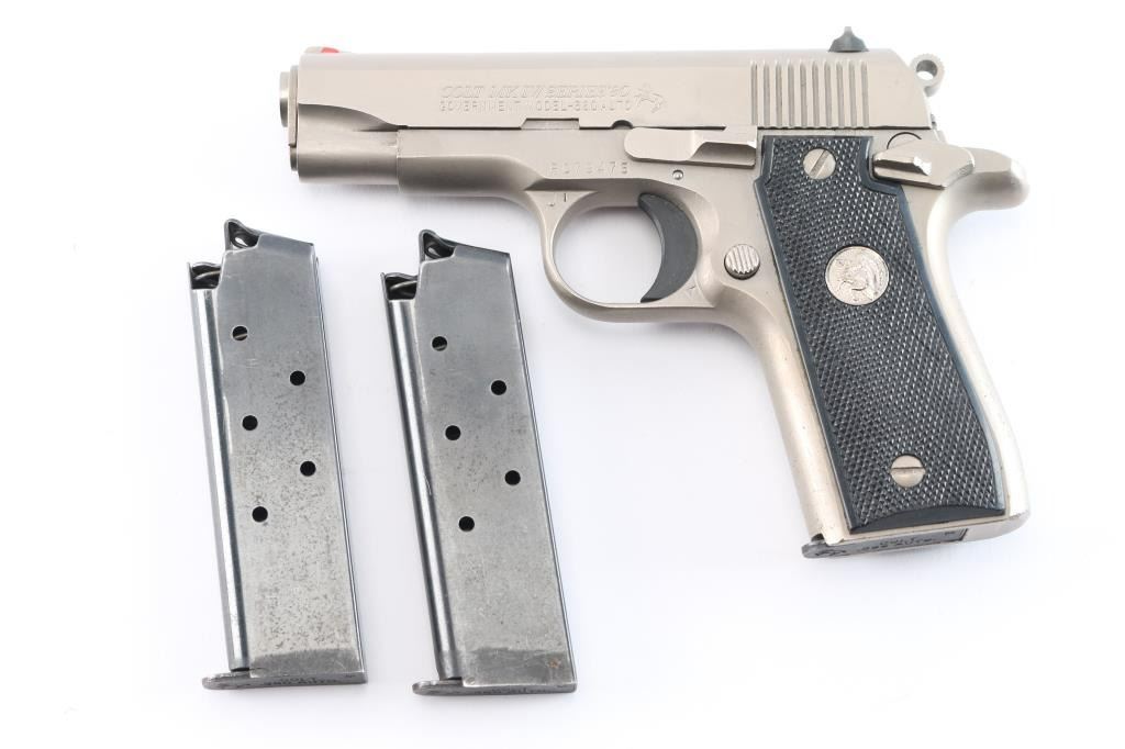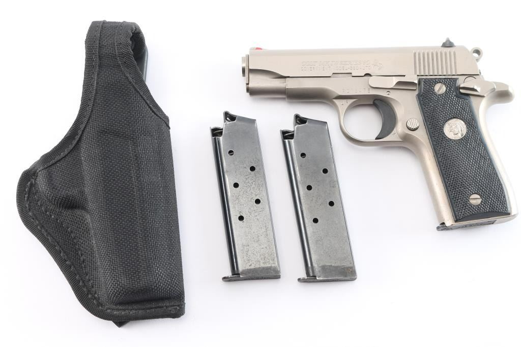'Mk IV Series 80' Single action semi-automatic pocket pistol built along the lines of a scaled-down 1911A1, manufactured in Hartford, CT circa 1986. Features stainless steel construction, 3.25" barrel, fixed ramp front sight with red insert, dovetailed rear sight with square notch, serrated trigger, serrated round hammer spur, manual safety on the left side of the frame, push button magazine release, factory 7 round magazine, checkered black synthetic grips with nickel Colt medallions. Bore is excellent/bright, action is smooth, grips are very good and the brushed stainless finish is overall very good with minor scratches/scuffs. Includes two spare factory magazines (3) total and a molded black nylon snap holster.