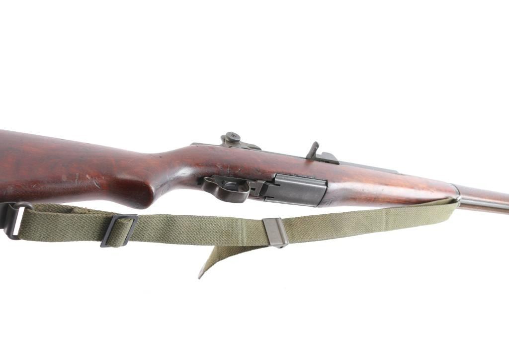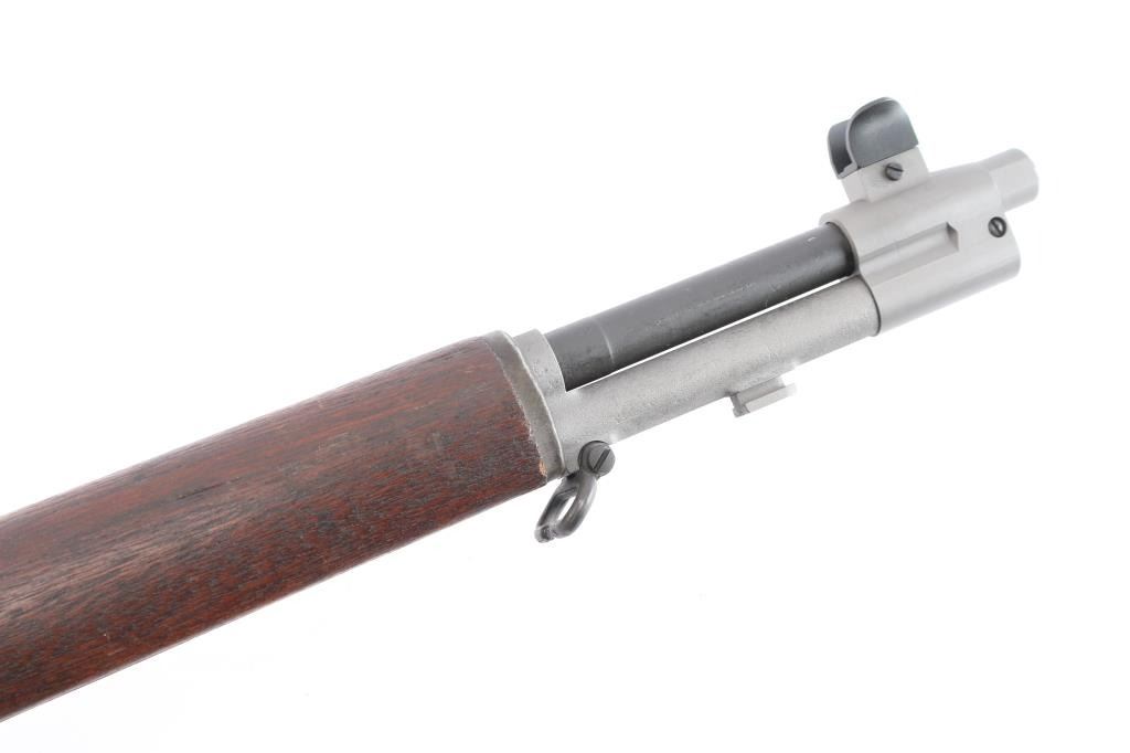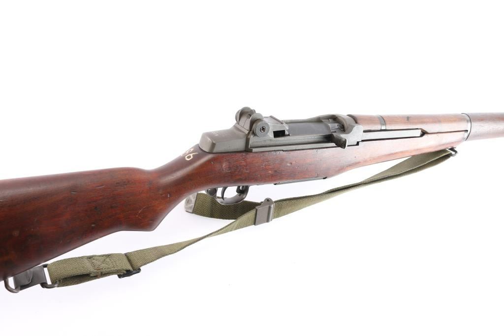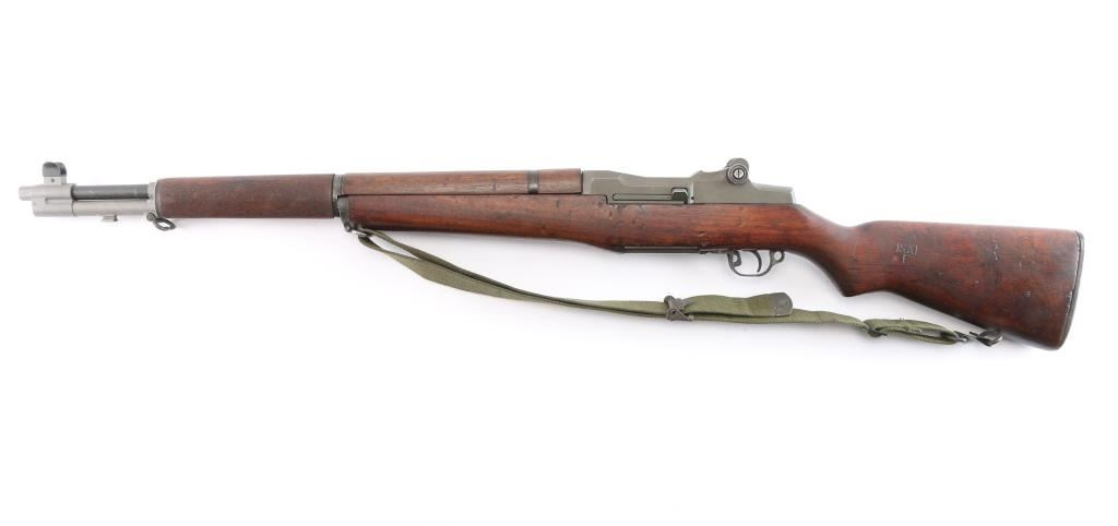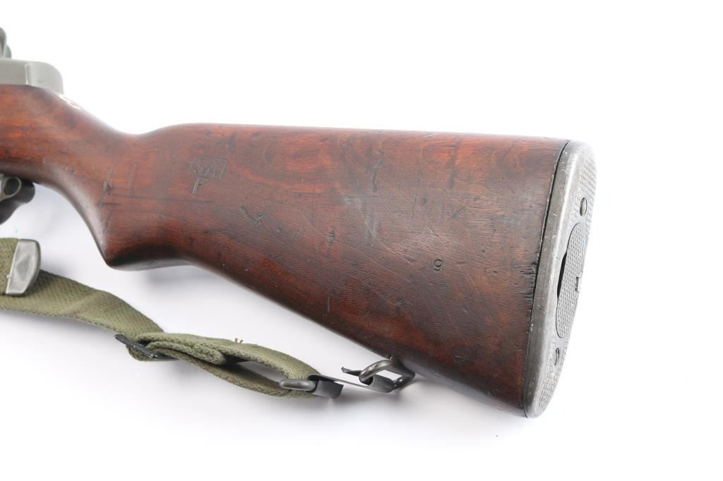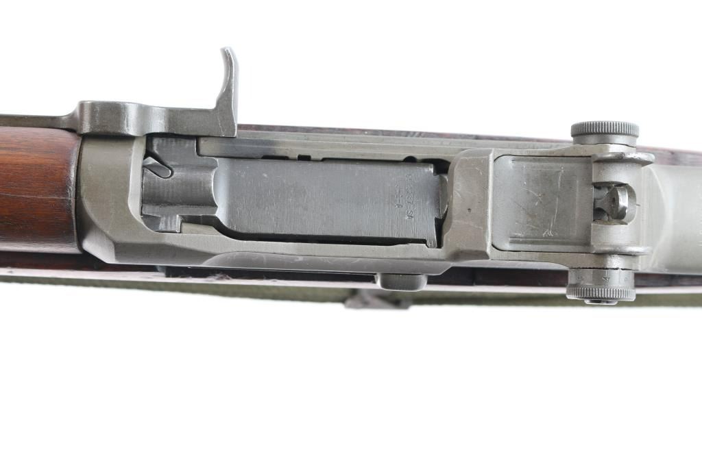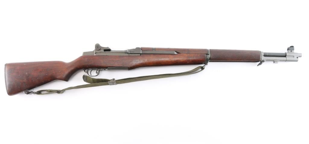 "Gas Trap" US military semi-automatic rifle, manufactured circa 1938, restored to the original very early pre-war configuration with recently made replica gas trap parts. The workhorse rifle of the US military in WWII and beyond. Features parkerized finish, walnut stock & hand guards, 24" barrel, adjustable sights with protected front blade & protected rear peep, fixed magazine for en-bloc clip, manual safety. Early style milled trigger guard. Barrel marked "SA D6535448 8 53 MD35" with crossed cannon stamp. Bolt marked "6528287-SA J-1-A". "SA" observed on hammer, trigger housing. Bore shows some light frosting throughout, sharp rifling. Various metal parts show different shades of dark gray parkerized finish, 95% coverage of arsenal refinish. The gas trap parts look like new. The wood is very good with typical handling marks, scratches and gouges, "P" in circle on bottom of wrist, "SA" in box over "F" on left just behind wrist. Painted rack number "86" behind receiver. Includes proper type green cotton web sling.