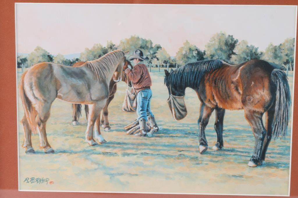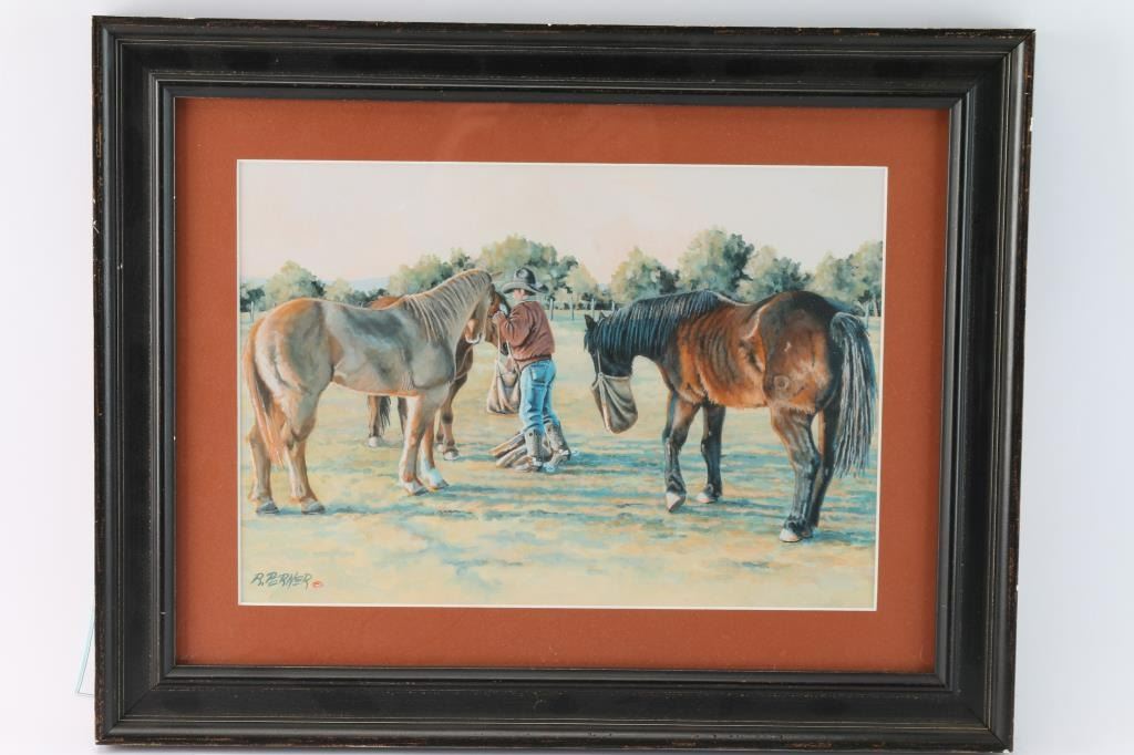 Entitled "Putting on the Feeding Bag". Signed lower left, with copyright mark. Measures 12" x 14".