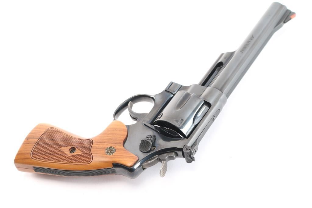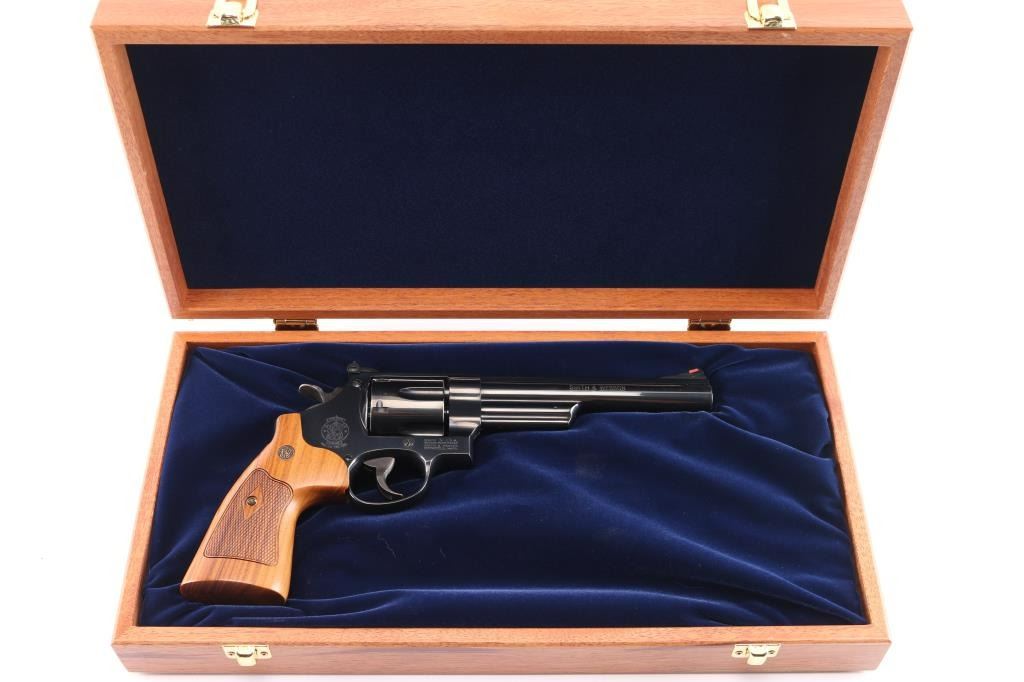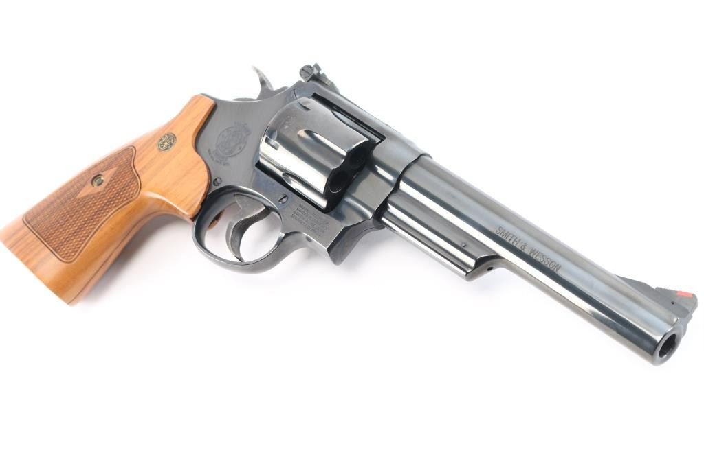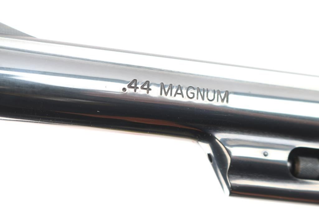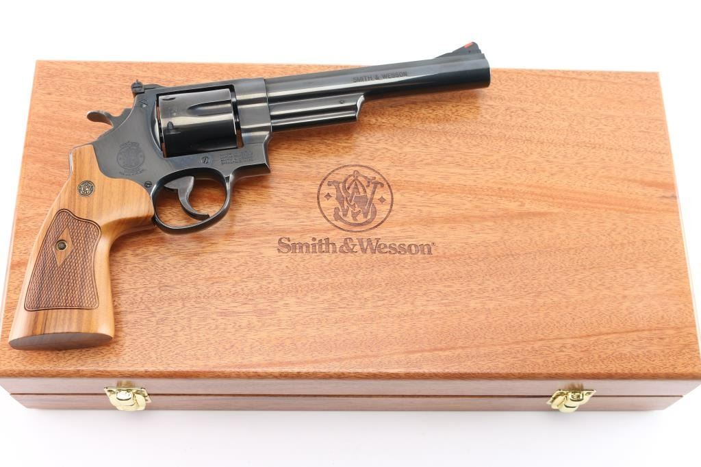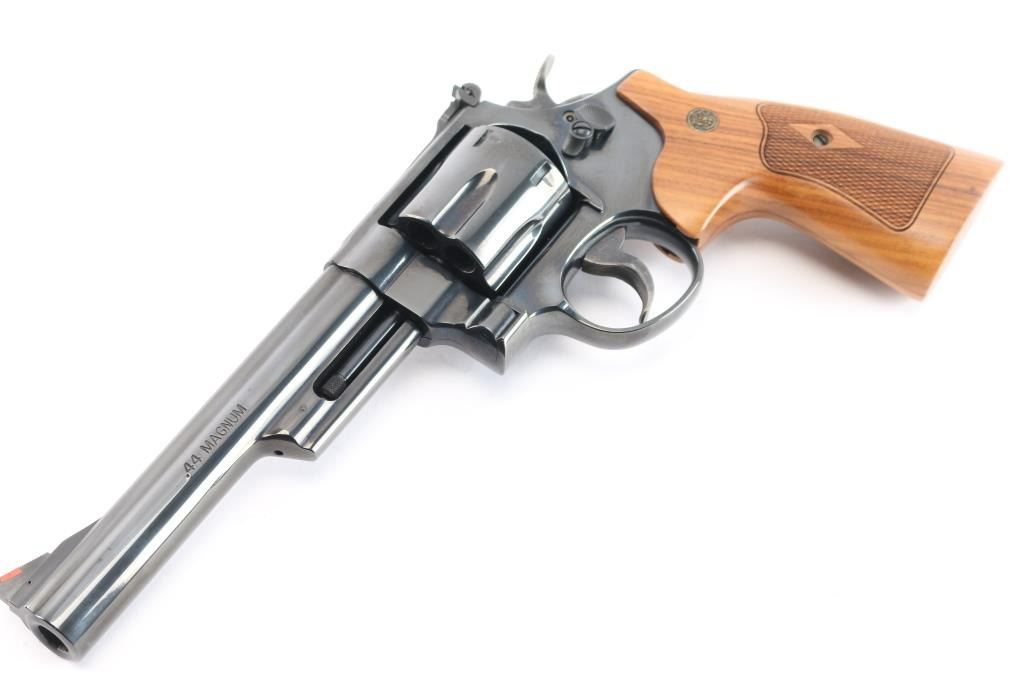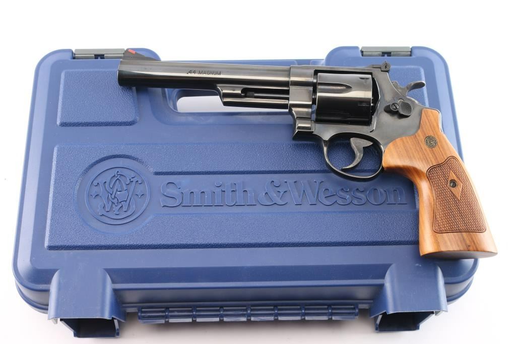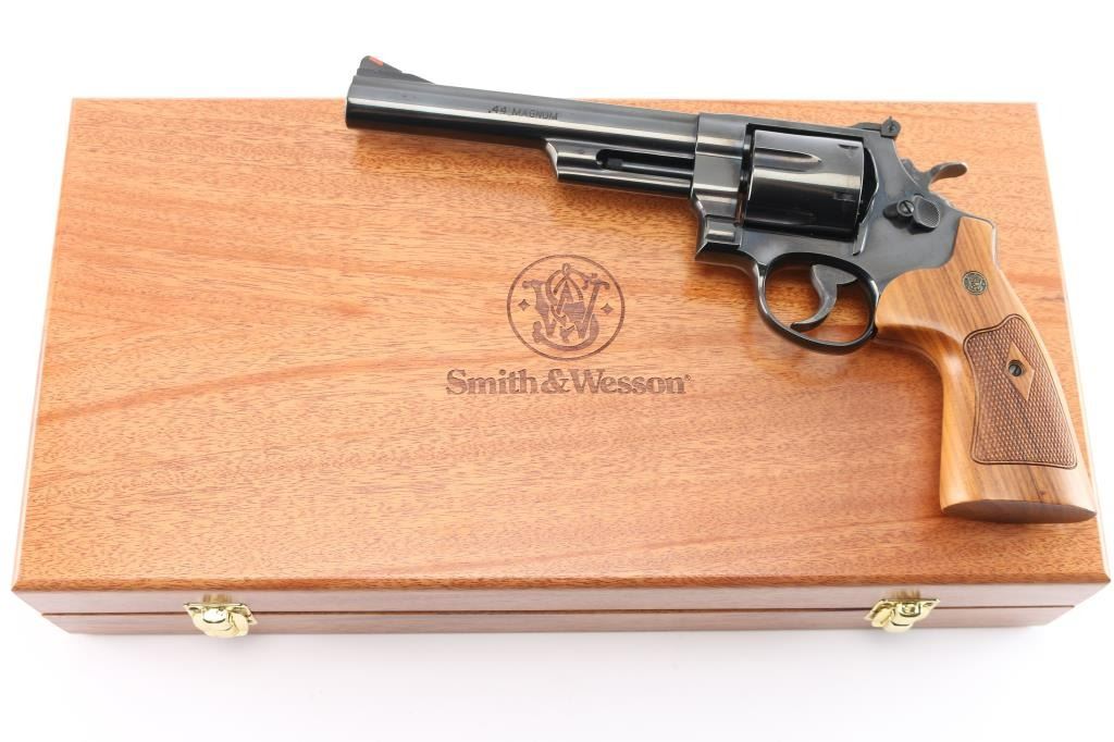 'The .44 Magnum' Large frame double-action revolver chambered in .44 Magnum. Features a blued finish, 6 1/2" barrel with partially serrated wide sighting rib, raised ramp front sight with red insert, adjusted micrometer click rear sight with white outline, shrouded ejector rod, fluted six-shot cylinder, .400" serrated target trigger, .500" target hammer, internal key lock safety, four screw square butt N target frame and two-piece diamond checkered African Cocobolo target grips with brass S&W medallions. Includes a factory blue hard case, matching label, with manual, cable lock, cleaning tools and internal lock keys. Revolver exhibits approximately 99%+ of it's original finish with a faint drag line on the cylinder and no other apparent wear. Action is smooth with solid lock-up, the bore is pristine and the wood grips are extra fine. Also comes with a S&W mahogany presentation with blue felt lining, with S&W trademark on lid. In cardboard sleeve, excellent, like new condition.