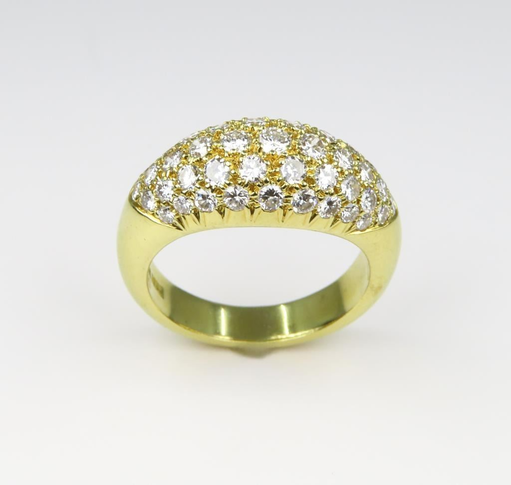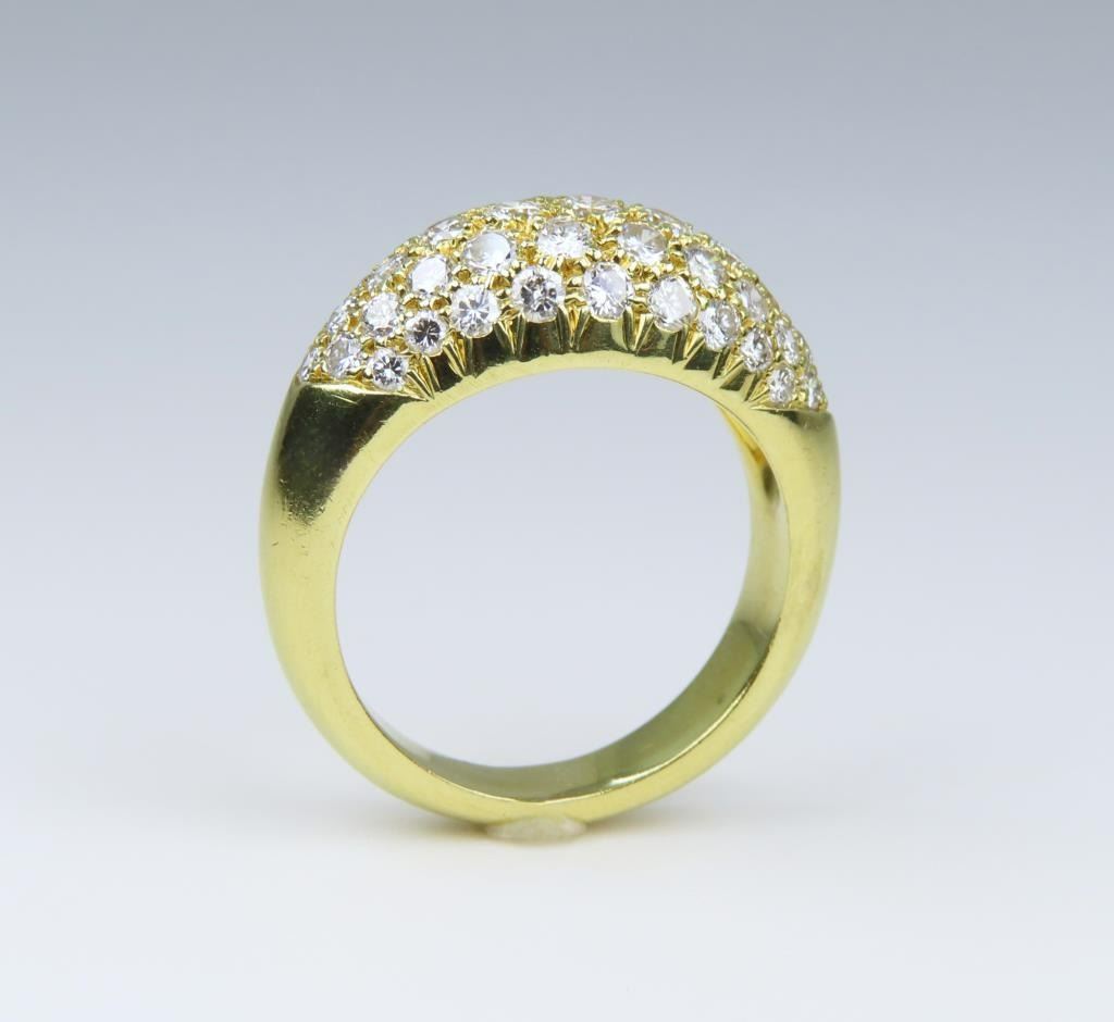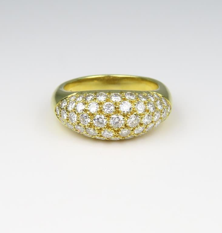 Dazzling Fine Cartier Style Diamond Ring featuring 50 Fine round pave set Diamonds weighing approx. 1.50 carats with F-G colors and VS clarity set in a meticulously crafted 18 karat yellow gold setting with a gold weight of 8.00 grams. Ring size 6 ¼. Retail $7,000-$9,000.