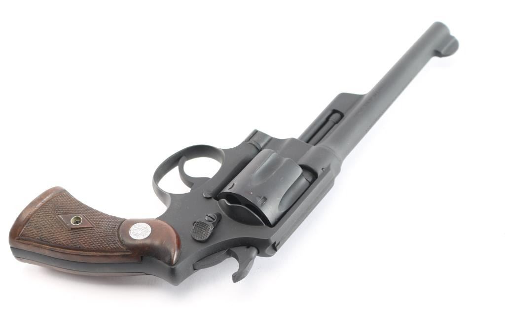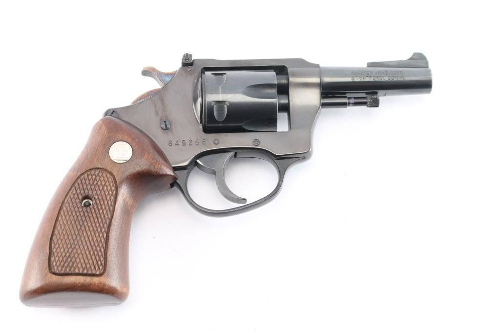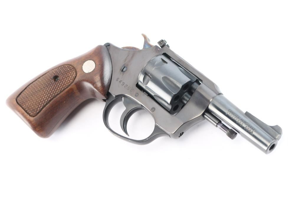 Double/Single action revolver chambered in .22 Magnum. Features blued finish, 3" barrel with exposed cylinder rod, adjustable sights, 6 shot fluted swing out cylinder with recessed chambers, checkered wood grips with Charter Arms medallions. Bore and chambers are excellent condition. Overall condition is like new, with few signs of handling, slight cylinder drag line.
