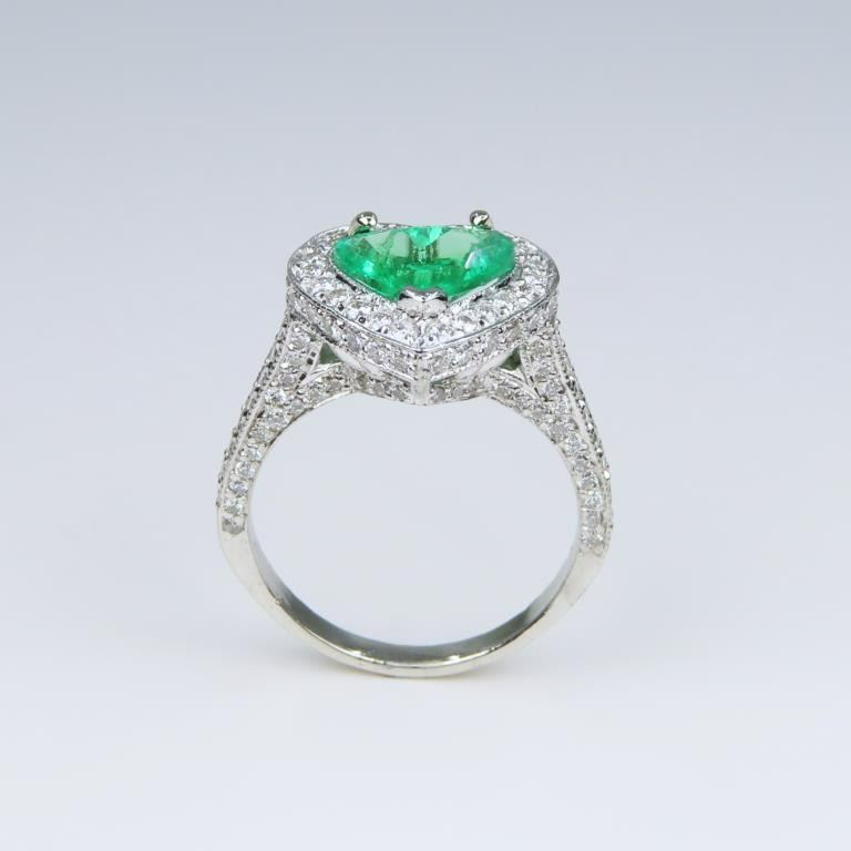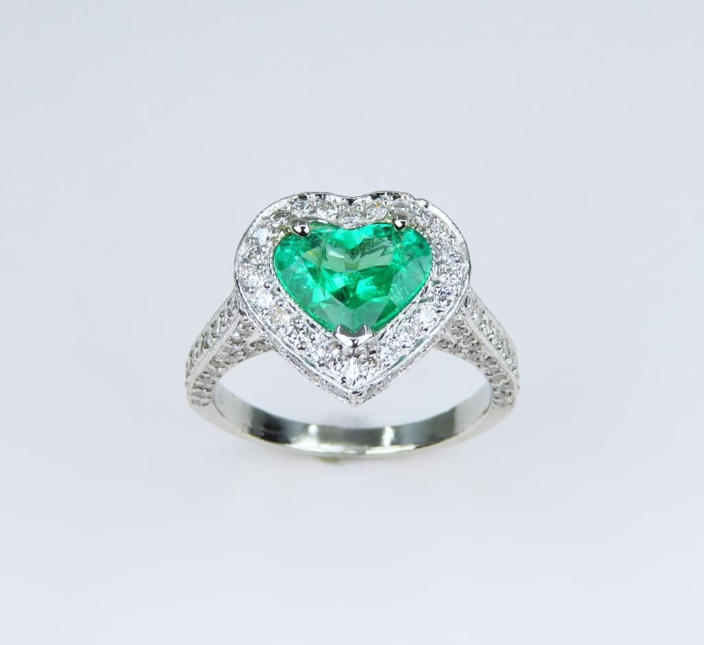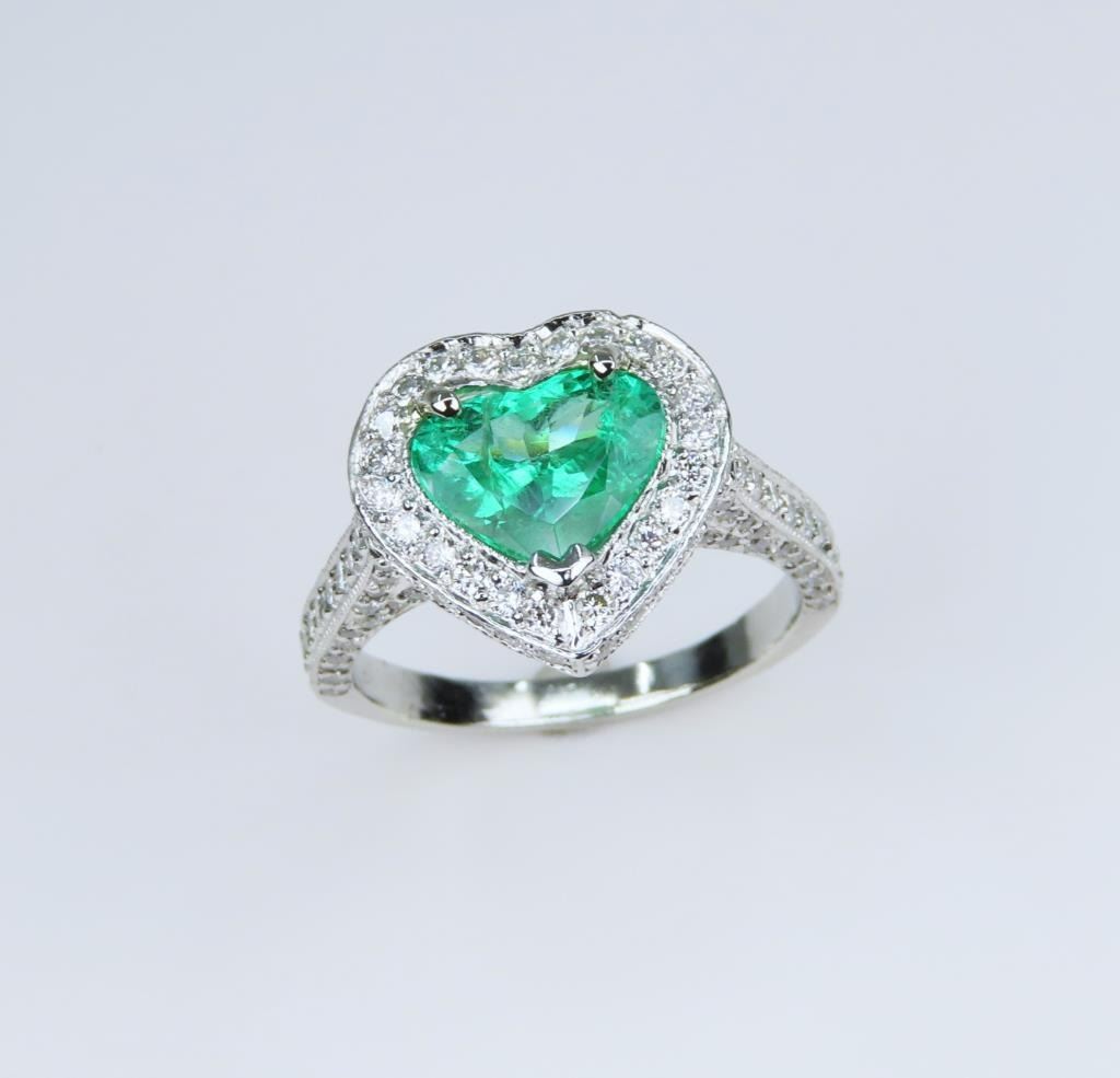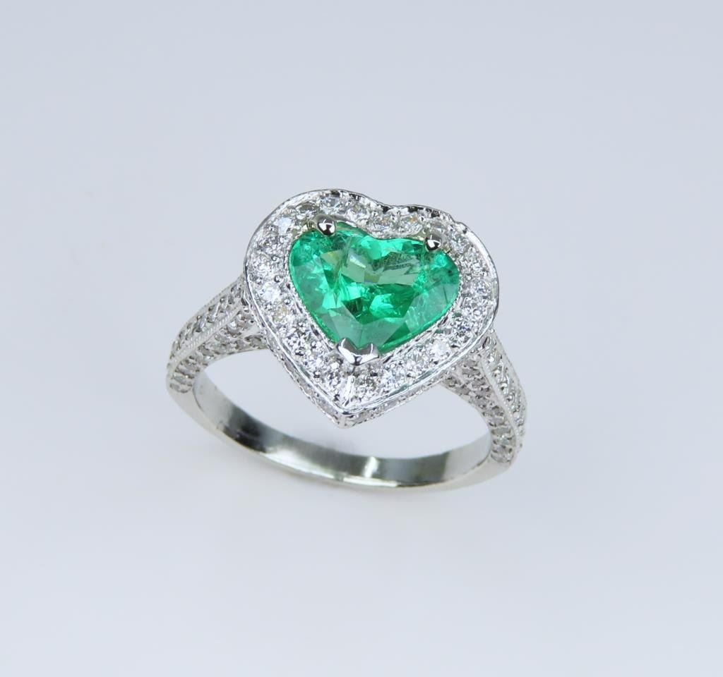 Exquisite, Very Fine Heart Shaped Columbian Emerald Platinum and Diamond Ring featuring a stunning extra vivid Green Emerald weighing 1.35 carats beautifully encrusted with over 144 round pave set Diamonds weighing approx. 1.00 carats with G-H colors and VS/SI clarity set in an intricately designed custom crafted Fine Quality Platinum setting. Ring size 5 ¼ - can be resized larger. Retail $10,000-$12,000.