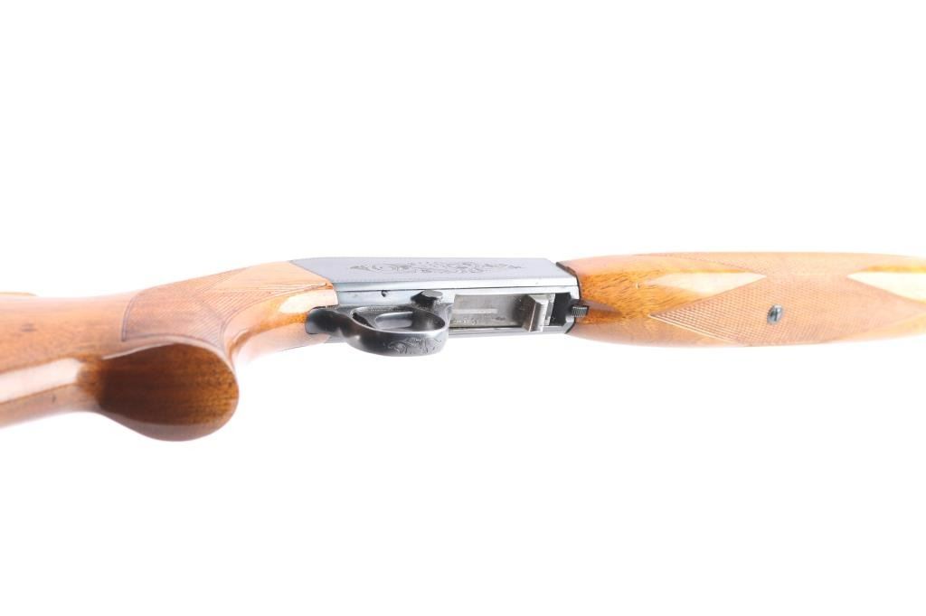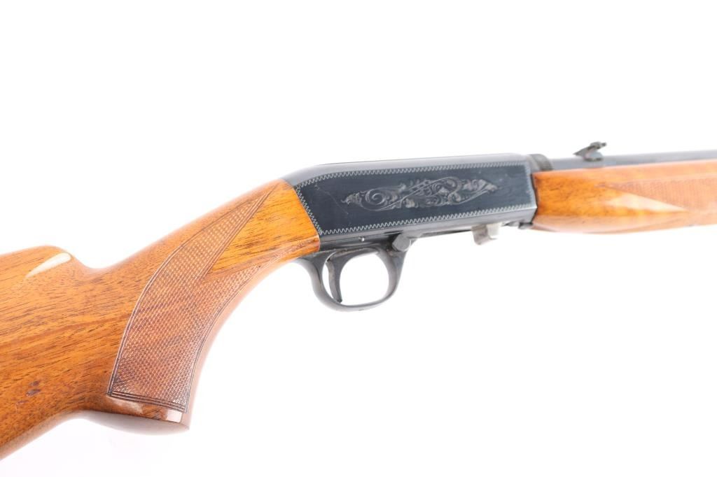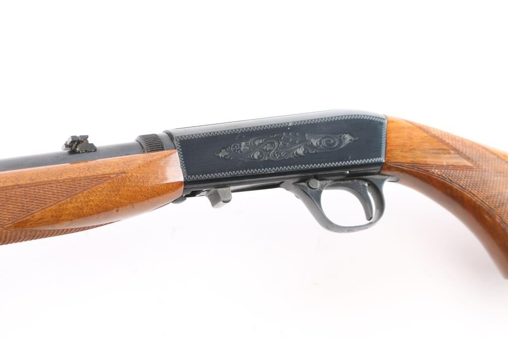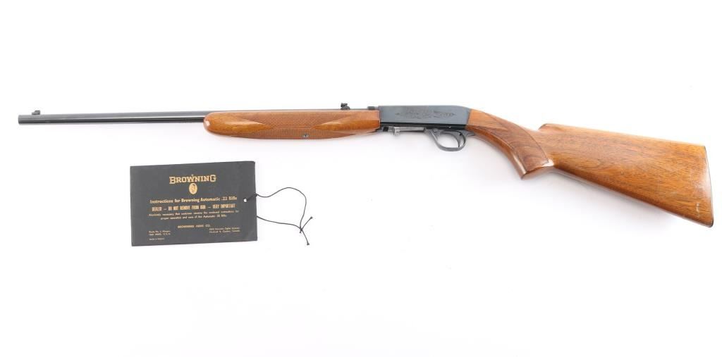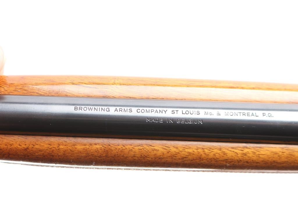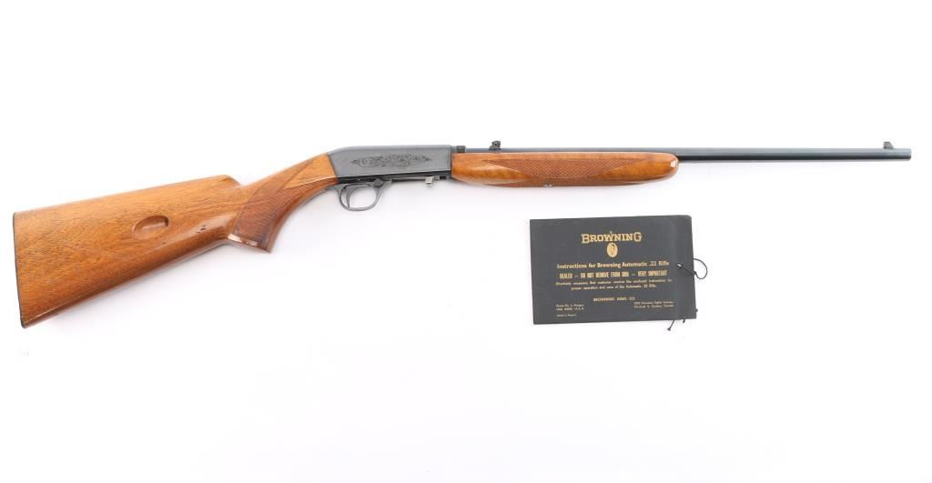 Grade I" Semiautomatic rifle made FN Herstal, Belgium for Browning Arms Co, St. Louis, Mo & Montreal P.Q.. Features take-down barrel, blued finish, checkered walnut butt & forend, 19" barrel, blade front sight with brass bead, adjustable sporting flip-up rear sight, magazine tube in butt, serrated steel buttplate, push button safety. Receiver/triggerguard is engraved with limited coverage of floral scrolls and edge patterns, receiver is grooved to mount an optics. Retains approximately 96% finish with minor scratches and a very small chip on the receiver, wood is excellent with high gloss and a few very minor scratches Bore is excellent/bright. Comes with the original manual. Manufactured 1964.